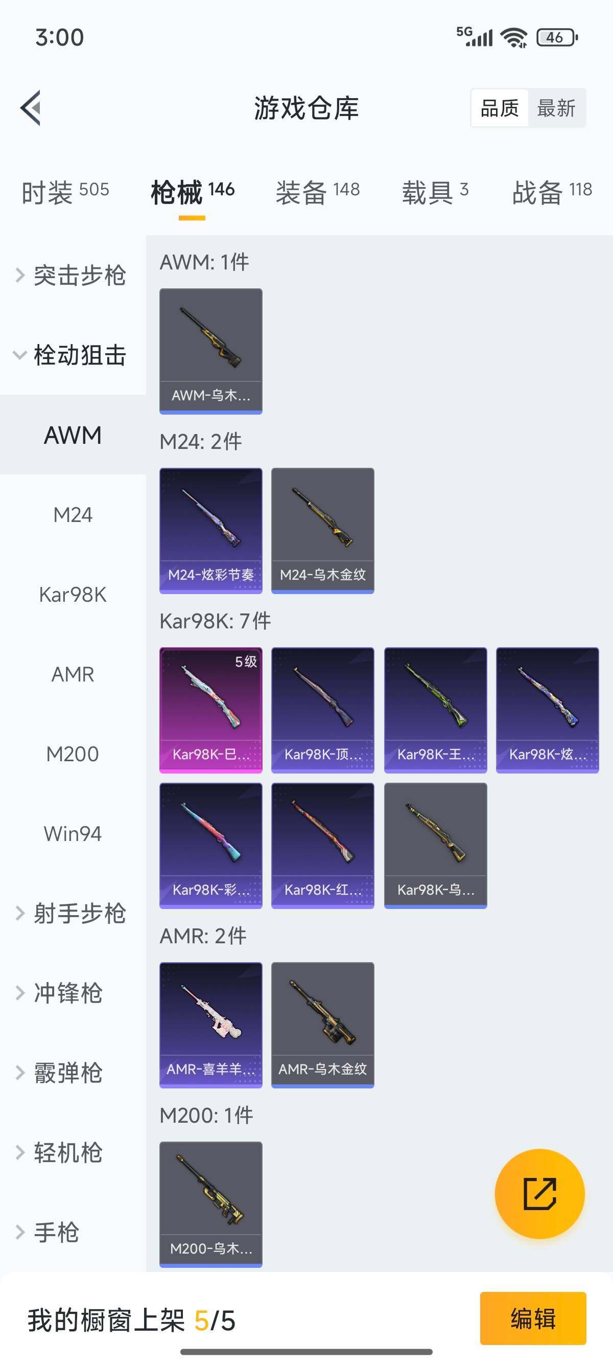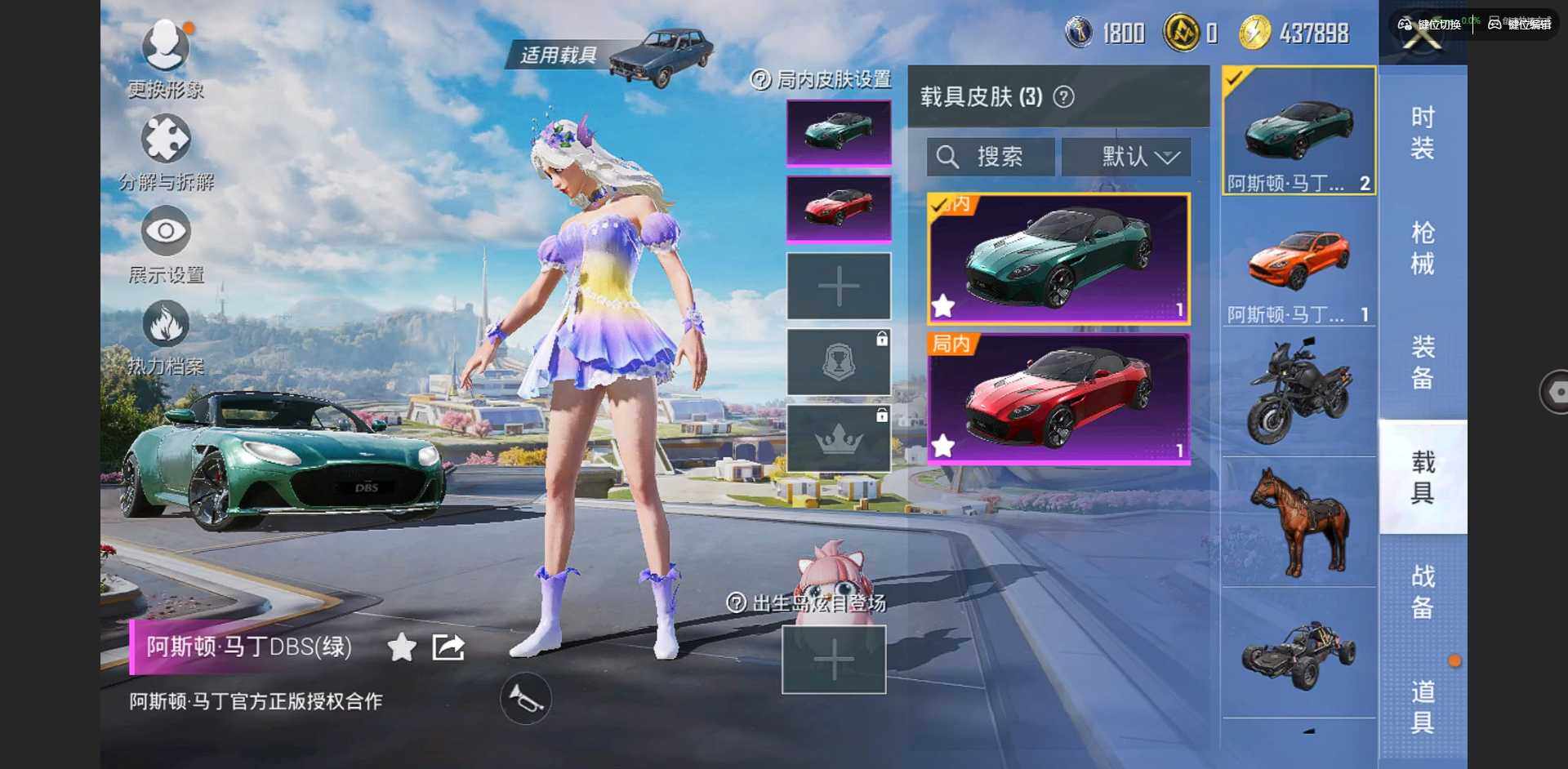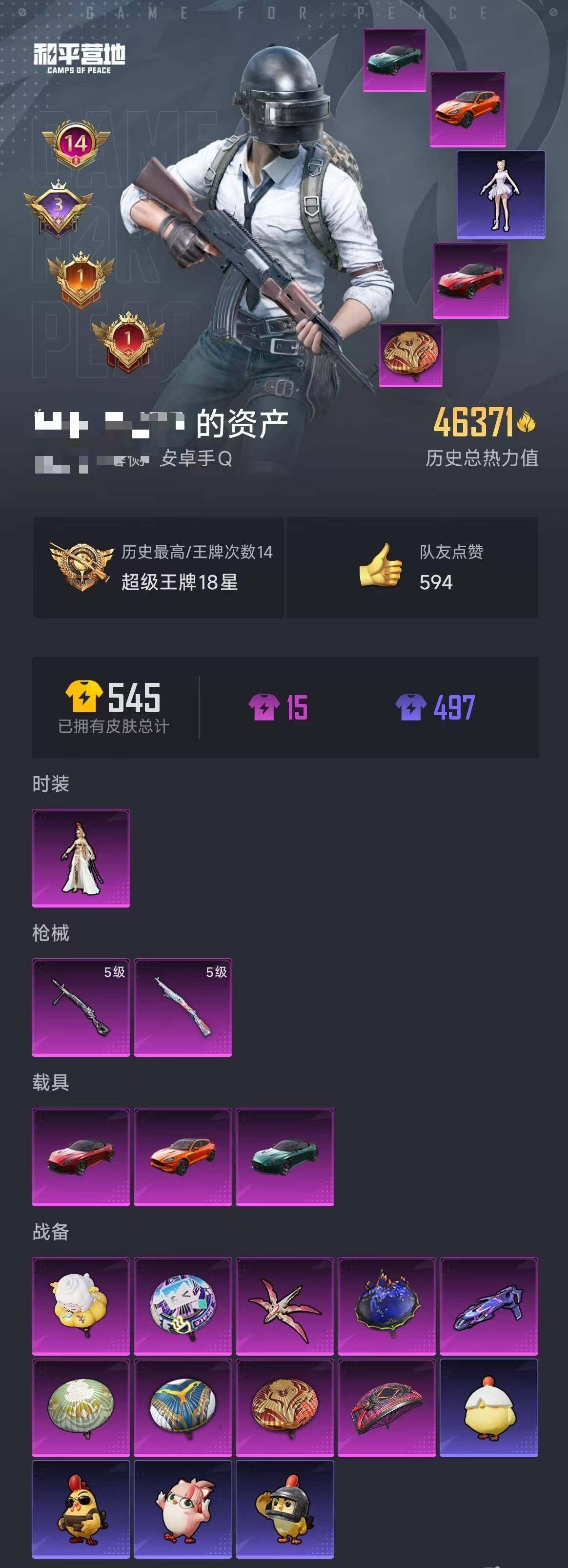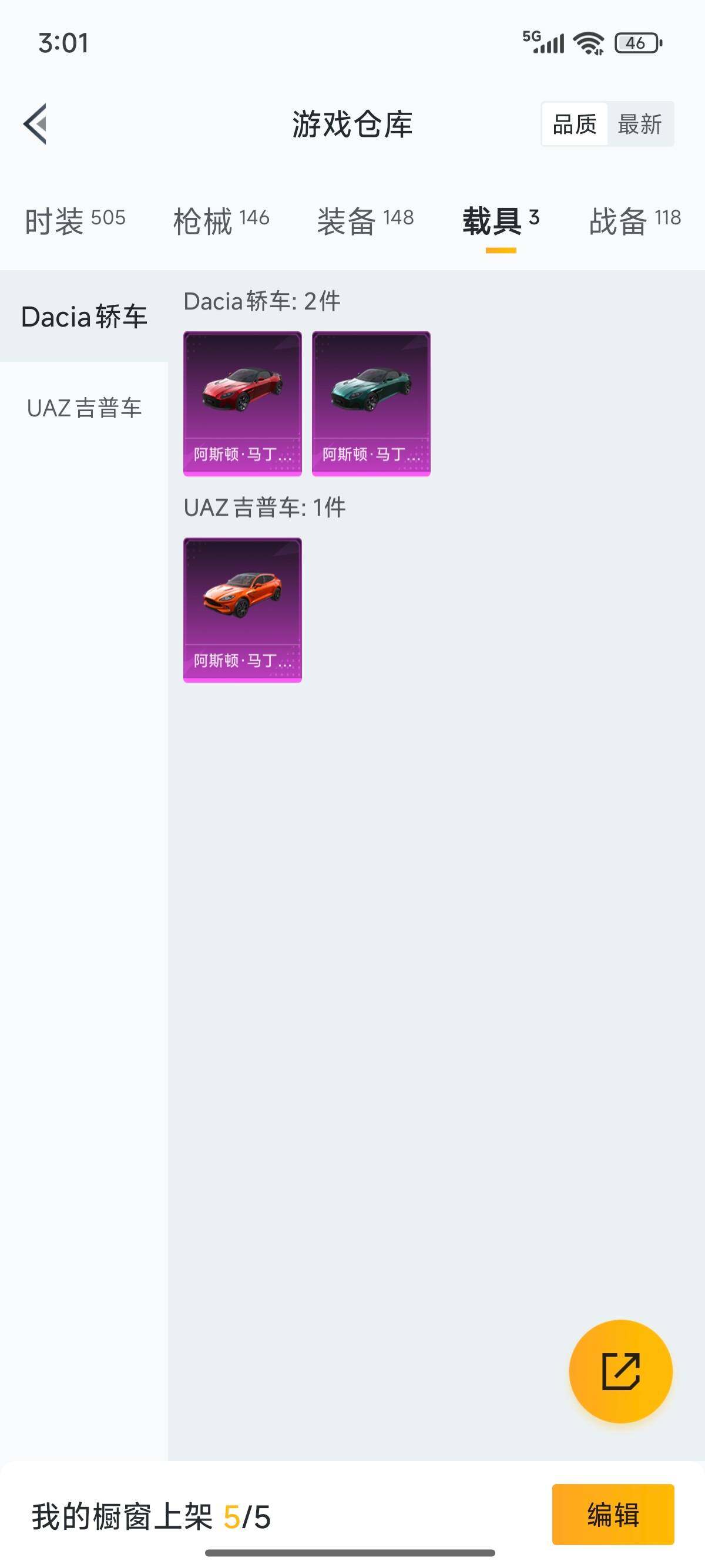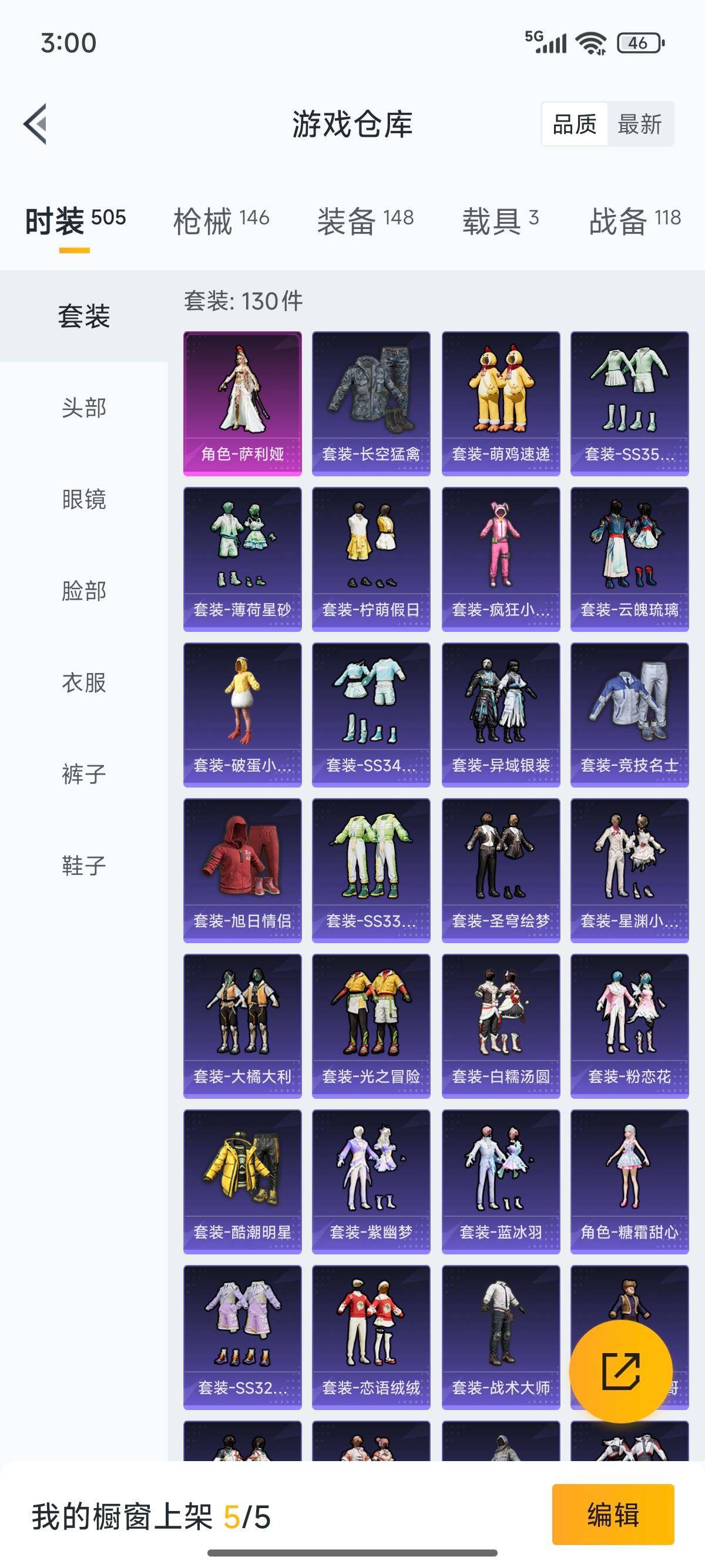 3载具-505套装-146呛皮-时装数: 130 载具数: 3 呛械数: 146 战备数: 118 热门装扮: 萨利娅 载具: 阿斯顿·马丁dbs红阿斯顿·马丁dbs绿阿斯顿·马丁dbx橙 稀有呛皮: 五级kar98k-巳巳如意五级dp-28-豹影疾电