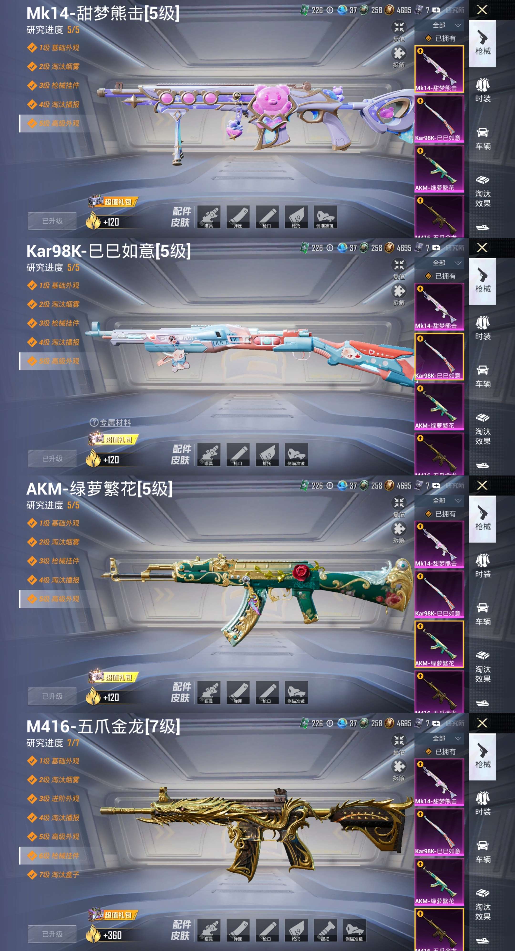 0载具-49套装-94呛皮-xq684【7级m4五爪金龙-2粉4满级特效-地铁满天赋-】安卓q区-2粉装-4特效呛-26713热力值-3王牌印记-49套装-94呛皮-无二次【优质套装】:智耀战神 萤海星豚【特效呛等级】:kar98k-巳巳如意五级m416-五爪金龙七级akm-绿萝繁花五级mk14-甜梦熊击(五级)【稀有武器皮肤】: famas-墨龙九天 vect-创世·救赎 kar98k-巳巳如意 20