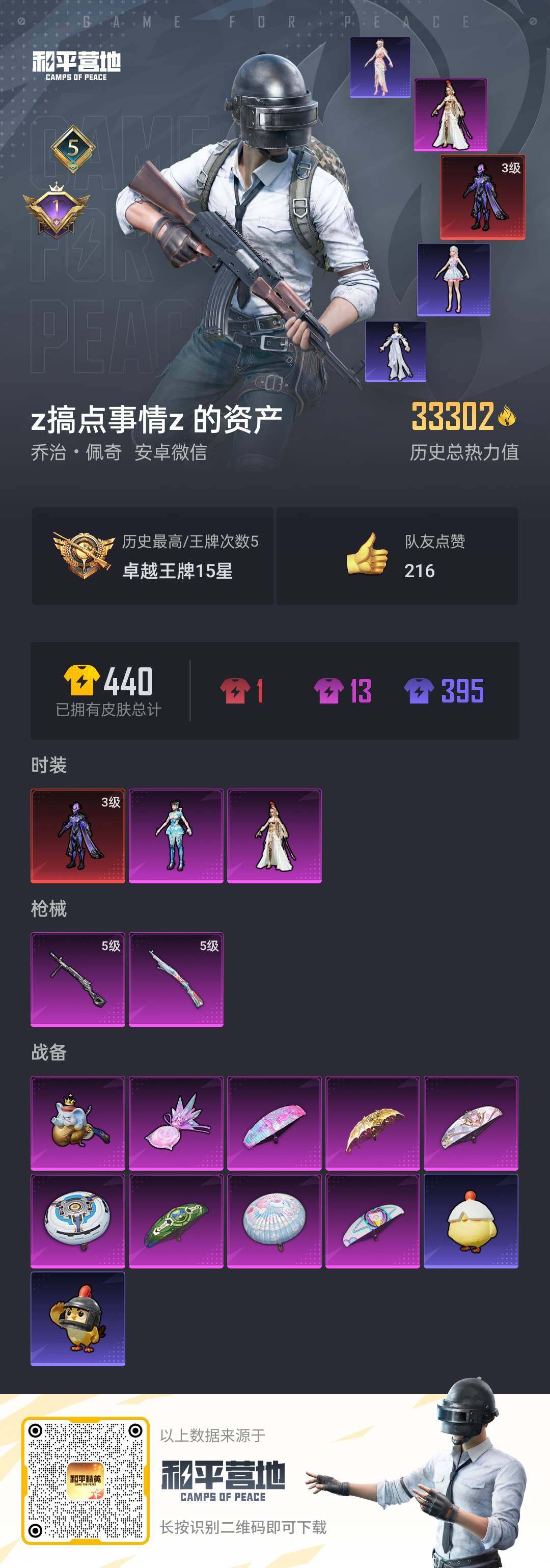 _2300245-可二次-安卓微信-1神装-2粉装-2特效呛-0载具-2粉色飞行器-33302热力值-5王牌印记-85套装-117呛皮 【红色神装等级】:宇宙意志-塞卢姆三级 【红色角色神装】:宇宙意志-塞卢姆 【热门品类】:套装-金羽特工 【粉色套装】:角色-萨利娅,角色-异瞳寒姬 【粉色呛皮等级】:kar98k-巳巳如意五级,dp-28-豹影疾电五级 【粉色呛皮】:kar98k-巳巳如意,dp-28-豹影疾电 【粉色飞行器】:极意拳锋飞行器 【粉色降落伞】:太空嘟嘟降落伞,彩虹甜喵降落伞,精灵梦叶罗丽降落伞,忍者神龟降落伞,未来领航者降落伞,圣域龙灵降落伞 【稀有套装】:套装-巳巳如意,套装-雏菊兔兔,套装-萝兰蝴蝶,套装-小熊娃娃,角色-拉斐尔,角色-多纳泰罗,套装-糖糖葫芦,套装-青团波波,角色-怀庆长公主,套装-燕燕于飞,套装-鱼渊荷华,角色-糖霜甜心,套装-紫幽梦,套装-蓝冰羽,角色-瑰梦爱神,套装-云朵鹅,套装-雪绒豹,角色-乐音,套装-炫彩糖果 【稀有呛皮】:akm-破晓战魂,m16a4-幻世战舞者,m16a4-千金淑猫,scar-l-夜灯,scar-l-炫彩节奏,scar-l-玉兔迎春,m416-红色方程式,aug-耀粉歌者,aug-绝对恒星,m762-天降萌叽,m762-云朵鹅,ac-val-天降萌叽,蜜獾-娇憨猪猪,uzi-娇憨猪猪,uzi-影袭,uzi-月影灵韵,ump45-夜灯,vect-生命誓言,汤姆逊-耀粉歌者,p90-巳巳如意,mini14-千面幻镜,slr-娇憨猪猪,svd-云朵鹅,svd-冷漠罗丽,s686-生命誓言,s686-巳巳如意,s1897-荧海星豚,s12k-破晓战魂,s12k-夜灯,s12k-娇憨猪猪,s12k-幻世战舞者,s12k-智耀战神,dbs-月影灵韵,spas-12-云朵鹅,m249-破晓战魂,m249-糯团青竹,dp-28-彩虹符号,mg3-幻世战舞者,短管霰弹-星穹咏叹调,沙墨之鹦-旋转彩虹,沙墨之鹦-云朵鹅,大砍刀-云朵鹅,破片手留单-巳巳如意 【其他套装】:套装-ss20特训,套装-ss21特训,套装-ss28特训,套装-ss29特训,套装-冷焰舞者,套装-幻世战舞者,套装-战地督导,套装-春日漫步,套装-暗金炫舞,套装-森林游猎者,套装-海岛探路者,套装-海滨突袭者,套装-湖蓝色名流,