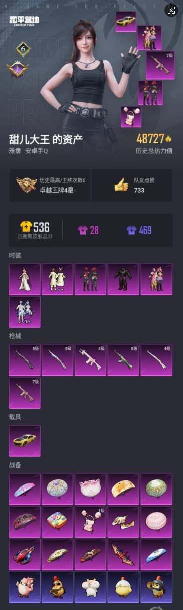 [14487866]安卓 【公主号 粉丝logo/猪妹/未来歌姬/闲梦青缨/满级心之恋语/永恒黄蜂/】手q-6粉装-6特效呛-1载具-4粉色飞行器-48727热力值-6王牌印记-112套装-140呛皮 【热门品类】:粉装-缤纷油彩,套装-ag战队服,套装-粉红小猪 【粉色载具】:永恒黄蜂 【粉色套装】:粉装-缤纷油彩,粉装-放客神游,粉装-未来歌姬,角色-猩猩队长,粉装-闲梦青缨,角色-萨利娅 【粉色呛皮等级】:akm-绿萝繁花五级,m416-心之恋语七级,kar98k-未来歌姬四级,kar98k-巳巳如意五级,m417-第五大道四级,dp-28-豹影疾电五级 【粉色呛皮】:akm-绿萝繁花,m416-心之恋语,kar98k-未来歌姬,kar98k-巳巳如意,m417-第五大道,dp-28-豹影疾电 【粉色飞行器】:变形金刚飞行器,粉樱探戈飞行器,拂晓神骑飞行器 【粉色降落伞】:星之彼岸降落伞,炎氏战神降落伞,未来歌姬降落伞,粉樱探戈降落伞,拂晓神骑降落伞,闲梦青缨降落伞,炫光之旅降落伞,萌酷奶龙降落伞,千金淑猫降落伞,智耀战神降落伞 【稀有套装】:套装-巳巳如意,套装-雏菊兔兔,套装-萝兰蝴蝶,套装-小熊娃娃,套装-糖糖葫芦,套装-青团波波,套装-棉花软糖,套装-燕燕于飞,套装-鱼渊荷华,角色-风玲,套装-紫幽梦,套装-蓝冰羽,套装-星渊小夜曲,套装-云朵鹅,套装-雪绒豹,套装-朱霞炽焰,套装-凌霄紫焰 【稀有呛皮】:akm-2p战斗服款,akm-夜灯,akm-破晓战魂,akm-龙的传人,m16a4-幻世战舞者,m16a4-千金淑猫,scar-l-甜蜜旋律,scar-l-红色方程式,m416-红色方程式,aug-天降萌叽,aug-甜蜜菠萝,q-彩虹符号,q-未来歌姬,m762-云朵鹅,mk47-炫光之旅,ac-val-快闪甜心,蜜獾-天降萌叽,arx-凌霄紫焰,uzi-天降萌叽,ump45-炫光之旅,ump45-金玉无双,vect-彩虹符号,vect-炎氏战神,汤姆逊-耀粉歌者,js9-凌霄紫焰,p90-快闪甜心,p90-甜蜜旋律,p90-巳巳如意,kar98k-六号树人,kar98k-彩虹符号,kar98k-炫彩节奏,m24-拂晓神骑,m24-炫彩节奏,sks-未来歌姬,sks-糯团青竹,mini14-绯穹魔姬,win94-粉樱探戈,m41