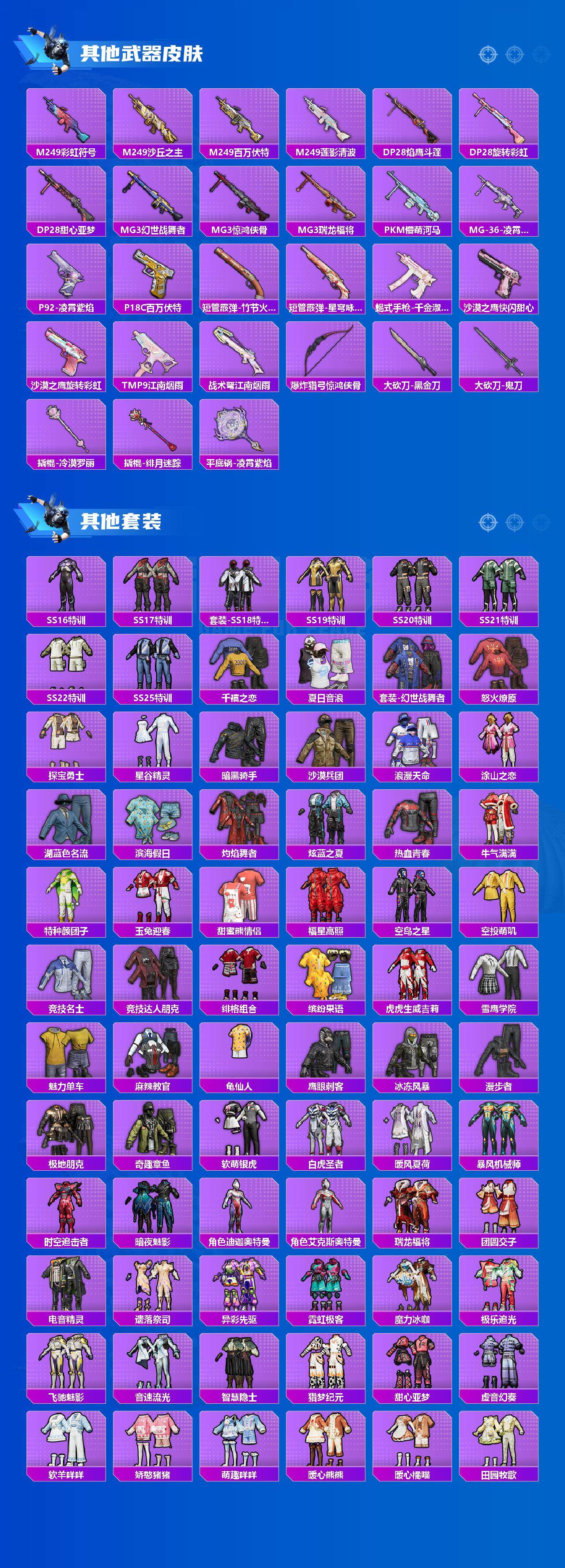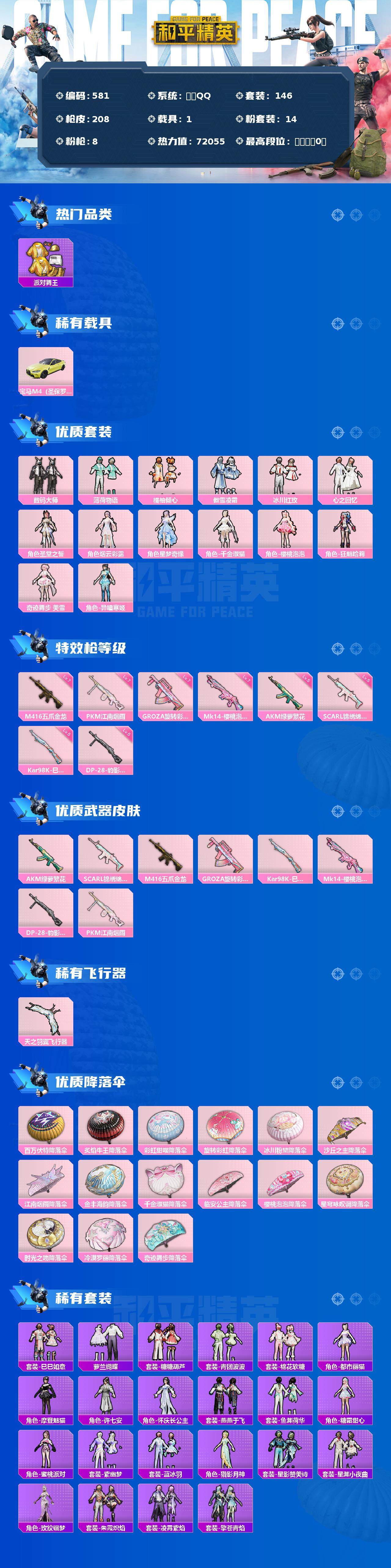 1载具-146套装-208呛皮-146套装/呛械8/装备305/载具1/战备124/热力值72055/五级akm-绿萝繁花/五级scar-l-锦绣绵绵/七级m416-五爪金龙/七级groza-旋转彩虹/五级kar98k-巳巳如意/七级mk14-樱桃泡泡/五级dp-28-豹影疾电/七级pkm-江南烟雨/套装-浪漫天命/派对舞王/套装-龟仙人/宝马m4圣保罗黄/数码大师/薄荷物语/橘柚倾心/傲雪凌霜/冰川红玫/心之回忆/圣堂