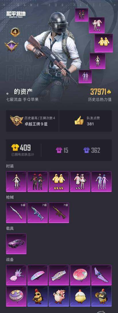 [14488017]苹果 【公主号 放客神游/暗影哥特/彩虹甜喵/圣堂之誓/满级五爪金龙/宾利batur/108扭蛋碎片/】手q-5粉装-3特效呛-1载具-2粉色飞行器-37971热力值-4王牌印记-89套装-111呛皮 【热门品类】:粉装-梦幻火箭,套装-浪漫天命,套装-金羽特工,套装-龟仙人,套装-暗影哥特,套装-粉红小猪 【粉色载具】:宾利batur(极速紫) 【粉色套装】:粉装-梦幻火箭,粉装-放客神游,粉装-彩虹甜喵,粉装-傲傲奶龙,角色-圣堂之誓 【粉色呛皮等级】:akm-梦之光华七级,m416-五爪金龙七级,kar98k-巳巳如意五级 【粉色呛皮】:akm-梦之光华,m416-五爪金龙,kar98k-巳巳如意 【粉色飞行器】:梦幻火箭飞行器 【粉色降落伞】:梦幻火箭降落伞,旋转彩虹降落伞,圣堂之誓降落伞 【稀有套装】:套装-龟仙人,套装-巳巳如意,套装-雏菊兔兔,套装-萝兰蝴蝶,套装-小熊娃娃,角色-多纳泰罗,套装-糖糖葫芦,套装-青团波波,套装-棉花软糖,角色-都市丽猫,角色-怀庆长公主 【稀有呛皮】:akm-影袭,akm-龙的传人,m16a4-幻世战舞者,scar-l-玉兔迎春,m416-红色方程式,groza-影袭,aug-天降萌叽,q-彩虹符号,m762-彩虹符号,ac-val-天降萌叽,ac-val-快闪甜心,ac-val-闲梦青缨,蜜獾-垂柳戏鸭,蜜獾-天降萌叽,蜜獾-娇憨猪猪,uzi-天降萌叽,uzi-娇憨猪猪,uzi-影袭,ump45-蓝色火焰,vect-生命誓言,vect-创世·救赎,汤姆逊-天降萌叽,汤姆逊-炫彩节奏,p90-快闪甜心,kar98k-梦幻火箭,m24-影袭,sks-未来歌姬,vss-彩虹符号,mini14-旋转彩虹,mini14-梦幻火箭,slr-娇憨猪猪,m417-惊鸿侠骨,mk20-h-快闪甜心,m200-惊鸿侠骨,s686-彩虹符号,s686-生命誓言,s1897-炫彩节奏,s12k-玩趣呆呆,s12k-垂柳戏鸭,s12k-娇憨猪猪,m249-彩虹符号,m249-糯团青竹,dp-28-未来战士,mg3-幻世战舞者,mg3-惊鸿侠骨,蝎式手呛-闲梦青缨,沙墨之鹦-快闪甜心,tmp-9-未来歌姬,爆炸猎弓-惊鸿侠骨,破片手留单-巳巳如意 【其他套装】:套装-ss21特训,套装-ss22特训,套装-ss23特训