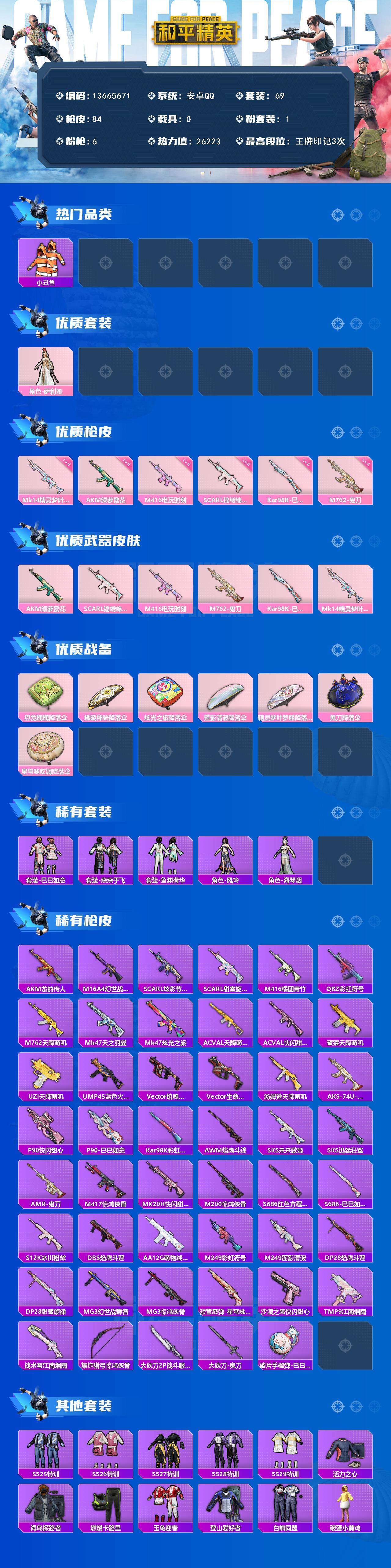 5750 【 迅捷狂鲨1粉装【6特效呛】 萨利娅 scar-l-锦绣绵绵 5级 m416-电玩时刻 5级 akm-绿萝繁花 5级 kar98k-巳巳如意 5级 m762-鬼刀 4级 mk14-精灵梦叶罗丽 6级26223热力值 3王牌印记 历史卓越王牌13星 67套装 84呛皮 【4热门】 龟仙人 呆萌铁蟹 迅捷狂鲨 破蛋小黄鸡 营地id:
