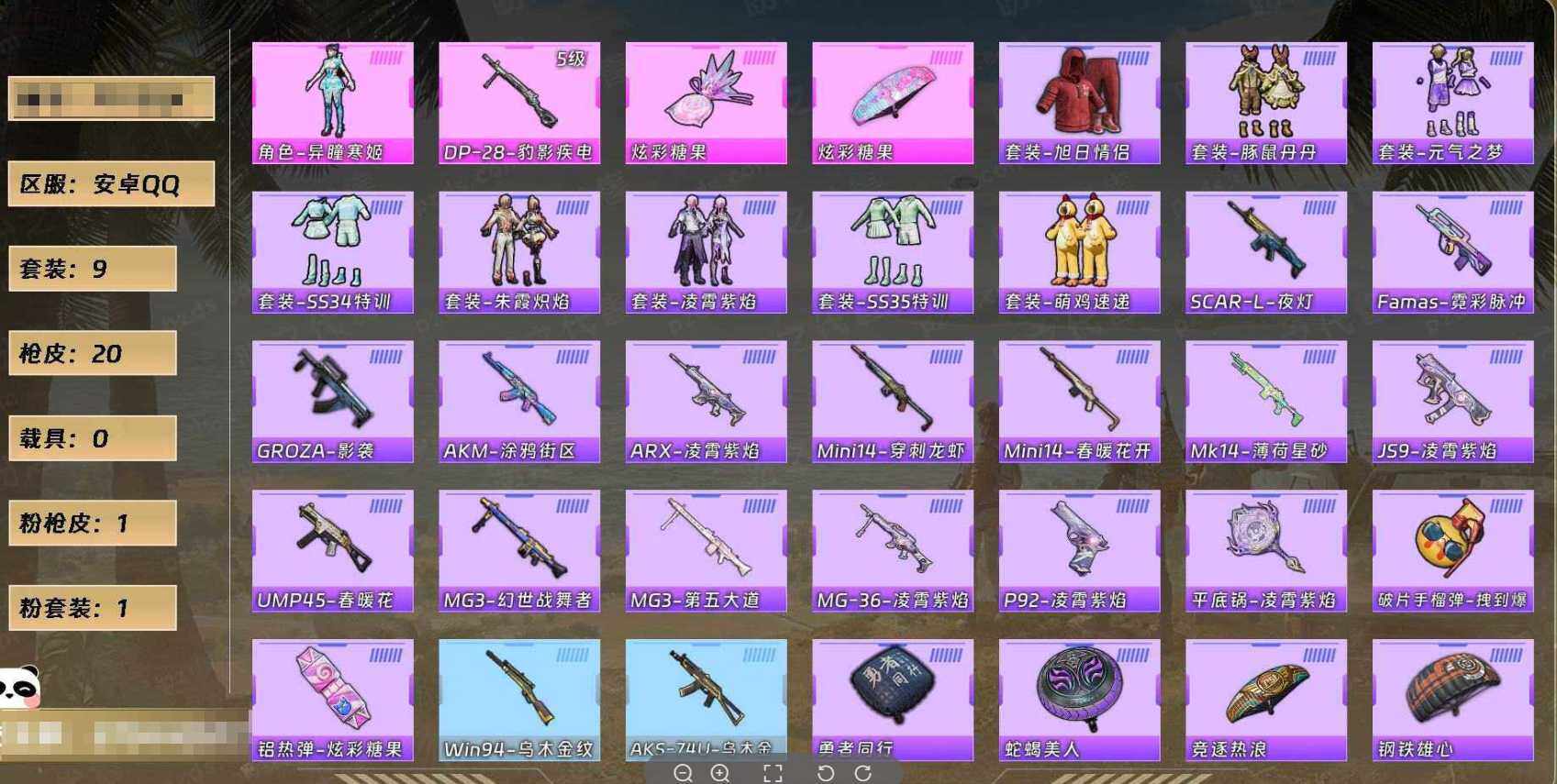 [14488675]安卓 【小号 1粉装-1特效呛】手q-1粉装-1特效呛-0载具-1粉色飞行器-5367热力值-1王牌印记-9套装-20呛皮 【粉色套装】:角色-异瞳寒姬 【粉色呛皮等级】:dp-28-豹影疾电五级 【粉色呛皮】:dp-28-豹影疾电 【稀有套装】:套装-朱霞炽焰,套装-凌霄紫焰 【稀有呛皮】:scar-l-夜灯,groza-影袭,arx-凌霄紫焰,ump45-春暖花开,js9-凌霄紫焰,mini14-春暖花开,mini14-穿刺龙虾,mg3-幻世战舞者,mg3-第五大道,mg-36-凌霄紫焰,p92-凌霄紫焰,平底锅-凌霄紫焰 【其他套装】:套装-旭日情侣,套装-豚鼠丹丹 【稀有背包】:深海小丑鱼背包(1级) 【营地id】:1026531652