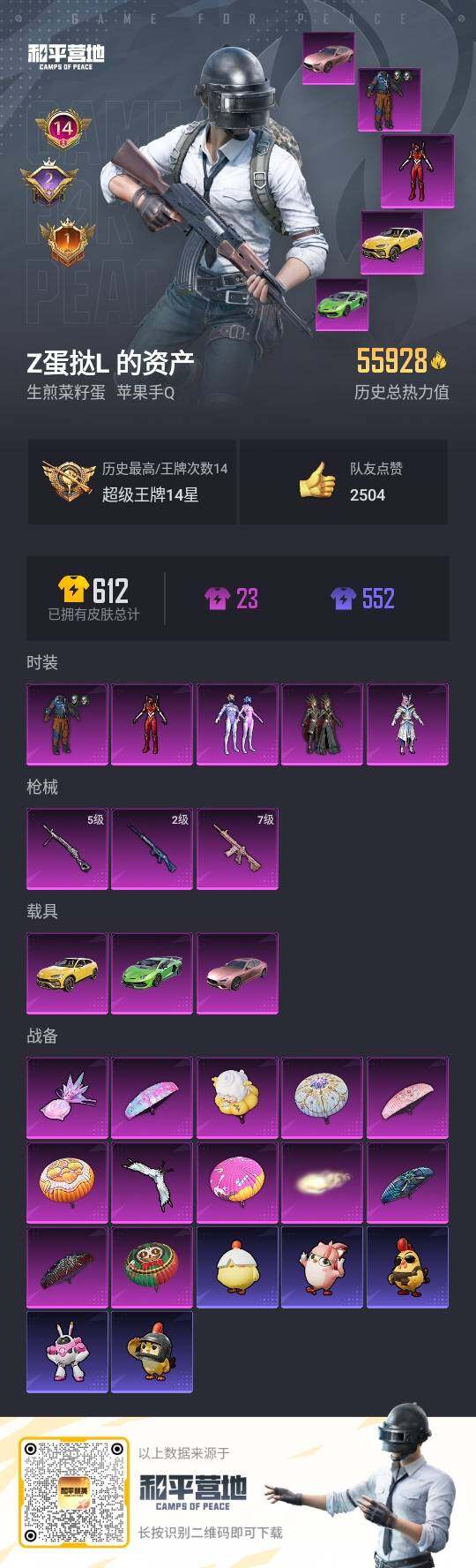 [14488956]苹果【素材号/14王牌印记/怪诞乔克/梦幻火箭/2号机款机体服/冥河战士/暗影哥特/】 手q-5粉装-3特效呛-3载具-3粉色飞行器-55928热力值-14王牌印记-142套装-144呛皮 【热门品类】:粉装-怪诞乔克,粉装-梦幻火箭,套装-浪漫天命,套装-冥河战士,套装-龟仙人,套装-暗影哥特,小丑红鼻头 【粉色载具】:兰博基尼aventad svj(翡翠绿),兰博基尼urus(明艳黄),玛莎拉蒂ghibli(粉) 【粉色套装】:粉装-怪诞乔克,粉装-深渊皇后,粉装-梦幻火箭,粉装-铁血龙王,角色-2号机款机体服 【粉色呛皮等级】:m416-心之恋语七级,slr-暗夜玫瑰二级,dp-28-豹影疾电五级 【粉色呛皮】:m416-心之恋语,slr-暗夜玫瑰,dp-28-豹影疾电 【粉色飞行器】:齐天大圣飞行器,天之羽翼飞行器 【粉色降落伞】:凝视深渊降落伞,怪笑疯兔降落伞,暗夜玫瑰降落伞,蓝莓炮弹降落伞,橘柚倾心降落伞,临安公主降落伞,智耀战神降落伞,喜羊羊与灰太狼降落伞 【稀有套装】:套装-龟仙人,套装-糖糖葫芦,套装-青团波波,套装-粉恋花,套装-紫幽梦,套装-蓝冰羽,套装-星渊小夜曲,套装-极速光影,套装-彩虹兔,套装-云朵鹅,套装-雪绒豹,套装-朱霞炽焰,套装-凌霄紫焰,套装-擎苍青焰,玩偶服-懒羊羊,套装-炫彩糖果 【稀有呛皮】:aug-冰晶雪宝,akm-彩虹符号,akm-影袭,akm-灼热熔岩,akm-破晓战魂,akm-萌趣颜团子,akm-虎虎生威,akm-霓虹街区,akm-龙的传人,m16a4-冥河战士,m16a4-凝视深渊,scar-l-凝视深渊,scar-l-红色方程式,m416-夜灯,m416-红色方程式,m416-绯红前夜,m416-蓝色火焰,groza-异彩先驱,groza-影袭,groza-青春物语,aug-凝视深渊,aug-耀粉歌者,q-彩虹符号,q-飞驰魅影,m762-天降萌叽,m762-彩虹符号,m762-瑞龙福将,m762-云朵鹅,g36c-时空追击者,g36c-暗夜玫瑰,蜜獾-天降萌叽,arx-凌霄紫焰,uzi-啾咪啾咪,uzi-天降萌叽,uzi-影袭,uzi-炫彩节奏,ump45-时空追击者,ump45-生命誓言,vect-暗夜玫瑰,汤姆逊-天降萌叽,汤姆逊-异彩先驱,汤姆逊-炫彩节奏,汤姆逊-耀粉歌