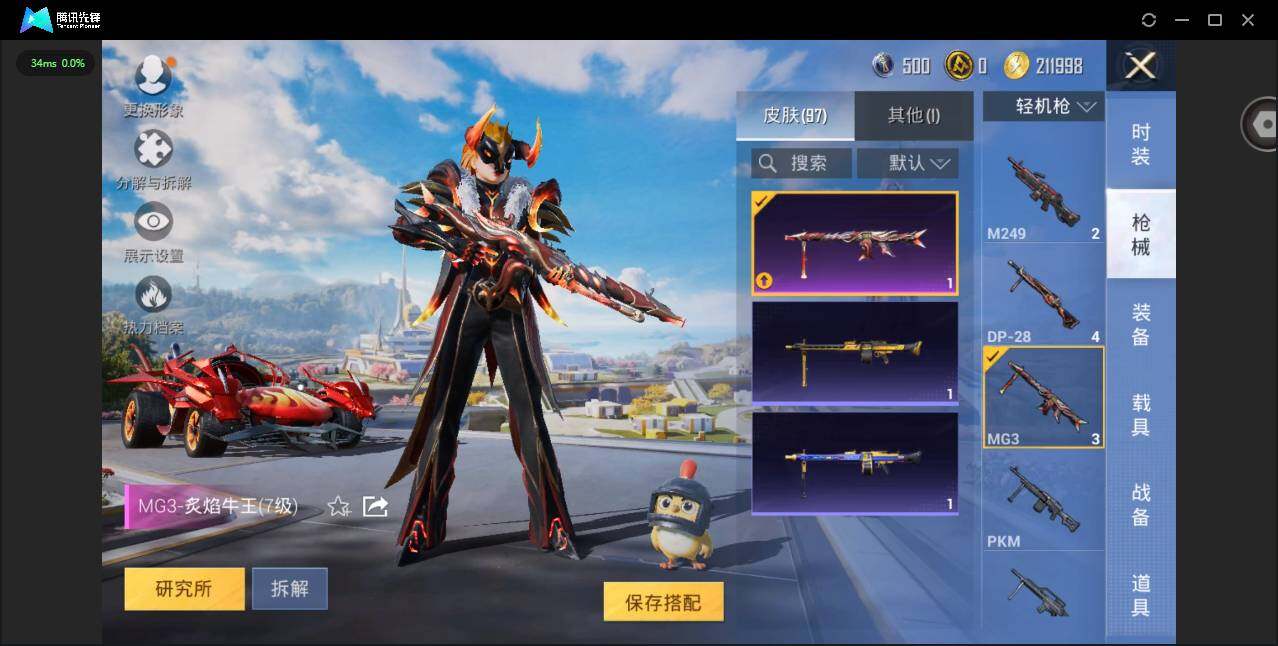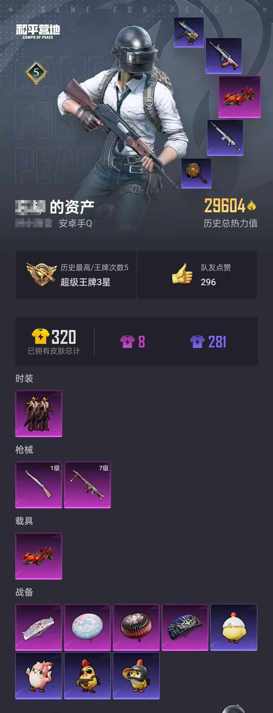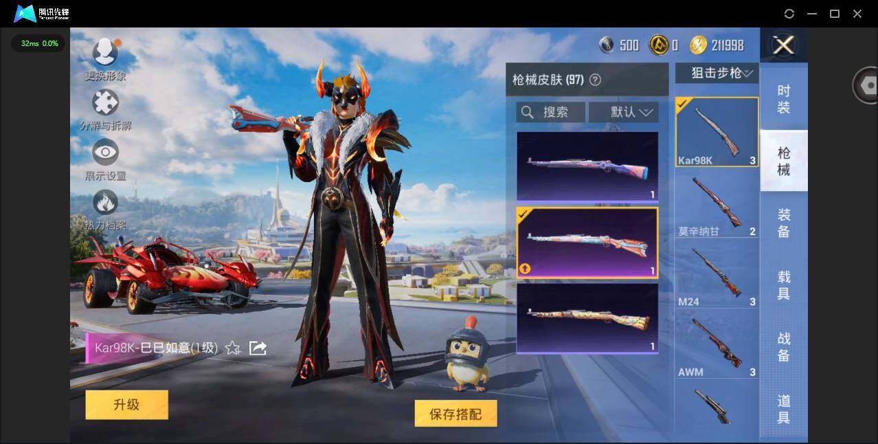 1载具-286套装-97呛皮-【和平精英连体王者荣耀】实名: 可修改 时装数: 74 载具数: 1 呛械数: 97 战备数: 67 热门装扮: 炙焰牛王 载具: 焰龙咆哮 稀有呛皮: kar98k-巳巳如意一级,mg3-炙焰牛王七级