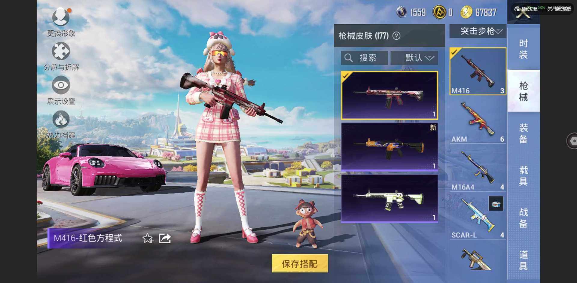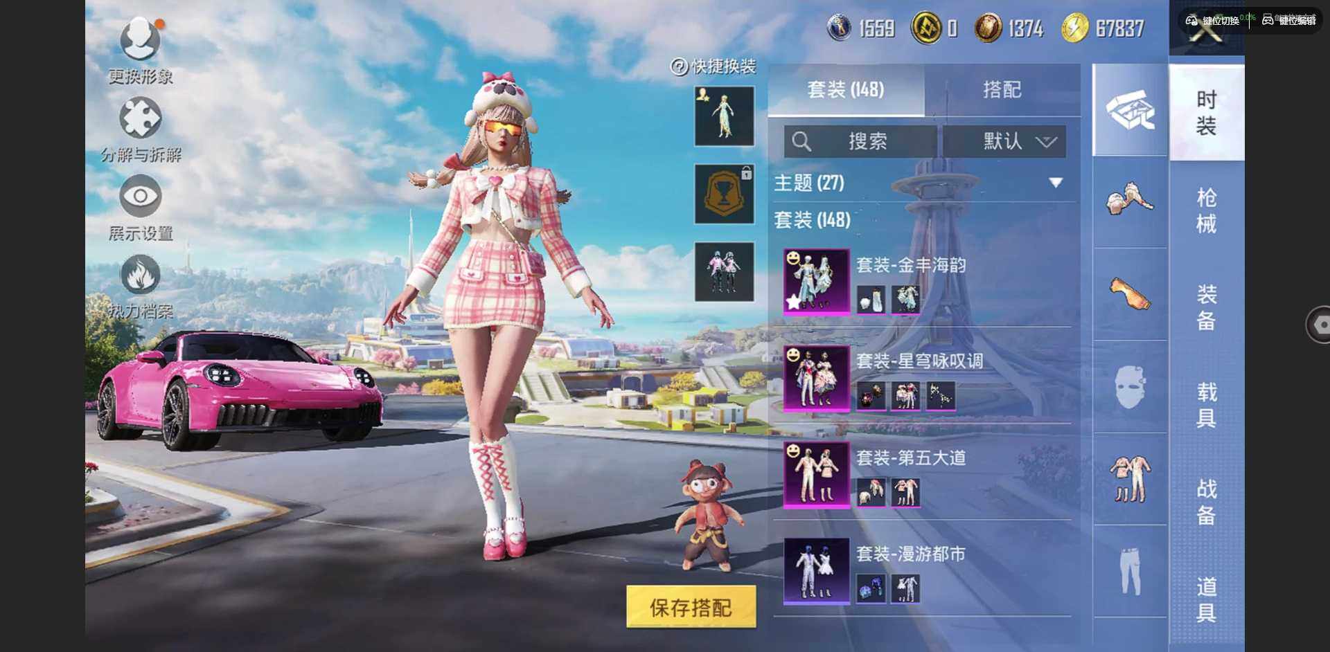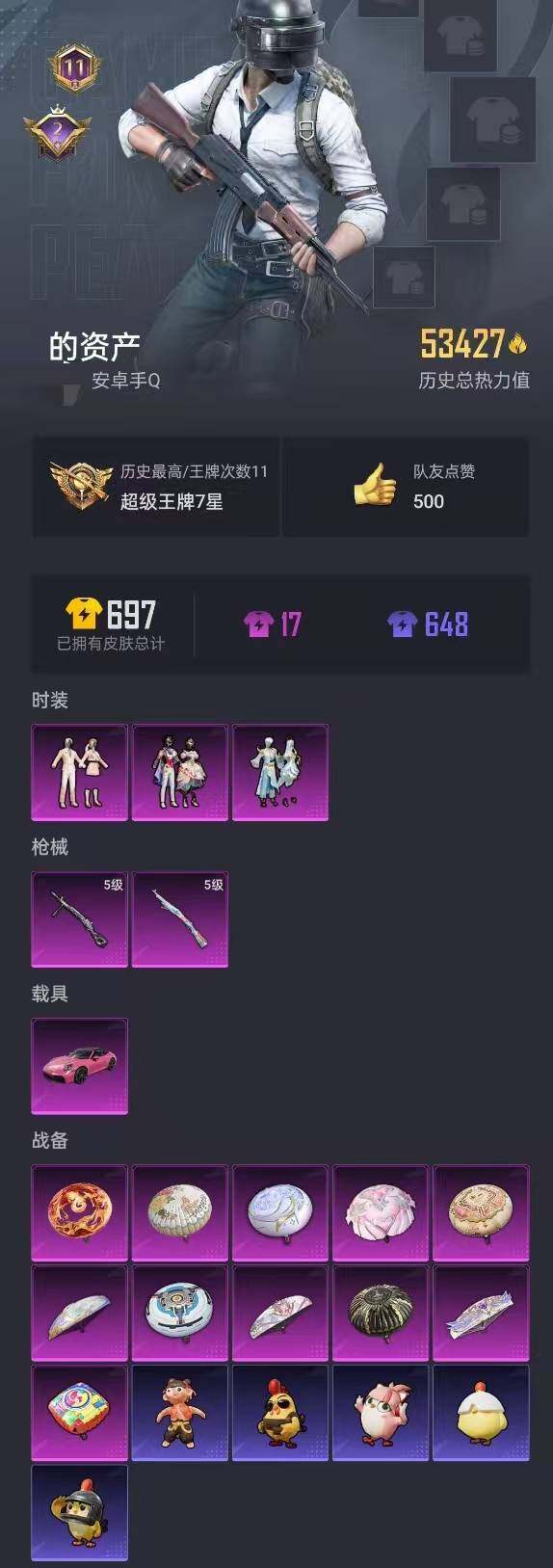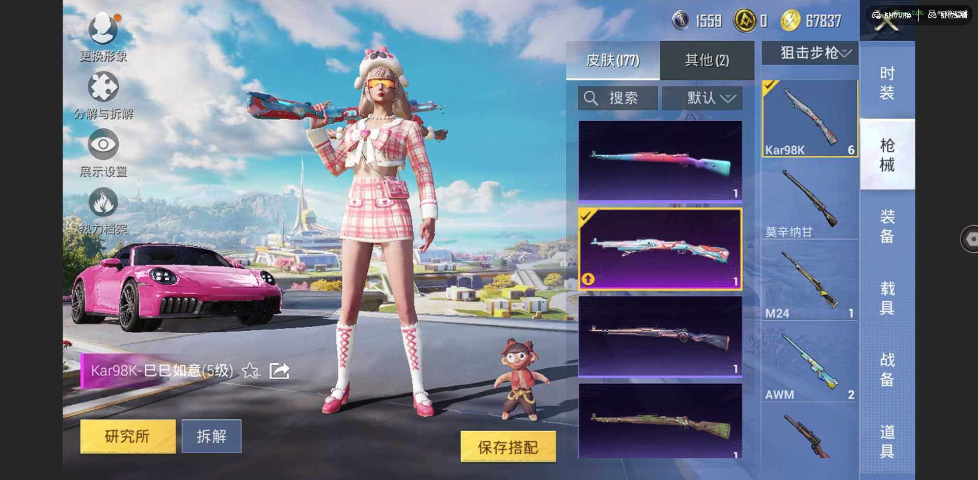1载具-546套装-177呛皮-【和平精英连体王者荣耀】实名: 可修改 时装数: 148 载具数: 1 呛械数: 177 战备数: 146 热门装扮: 第五大道金丰海韵星穹咏叹调 载具: 保时捷911敞篷版星珀红 稀有呛皮: 五级kar98k-巳巳如意五级dp-28-豹影疾电