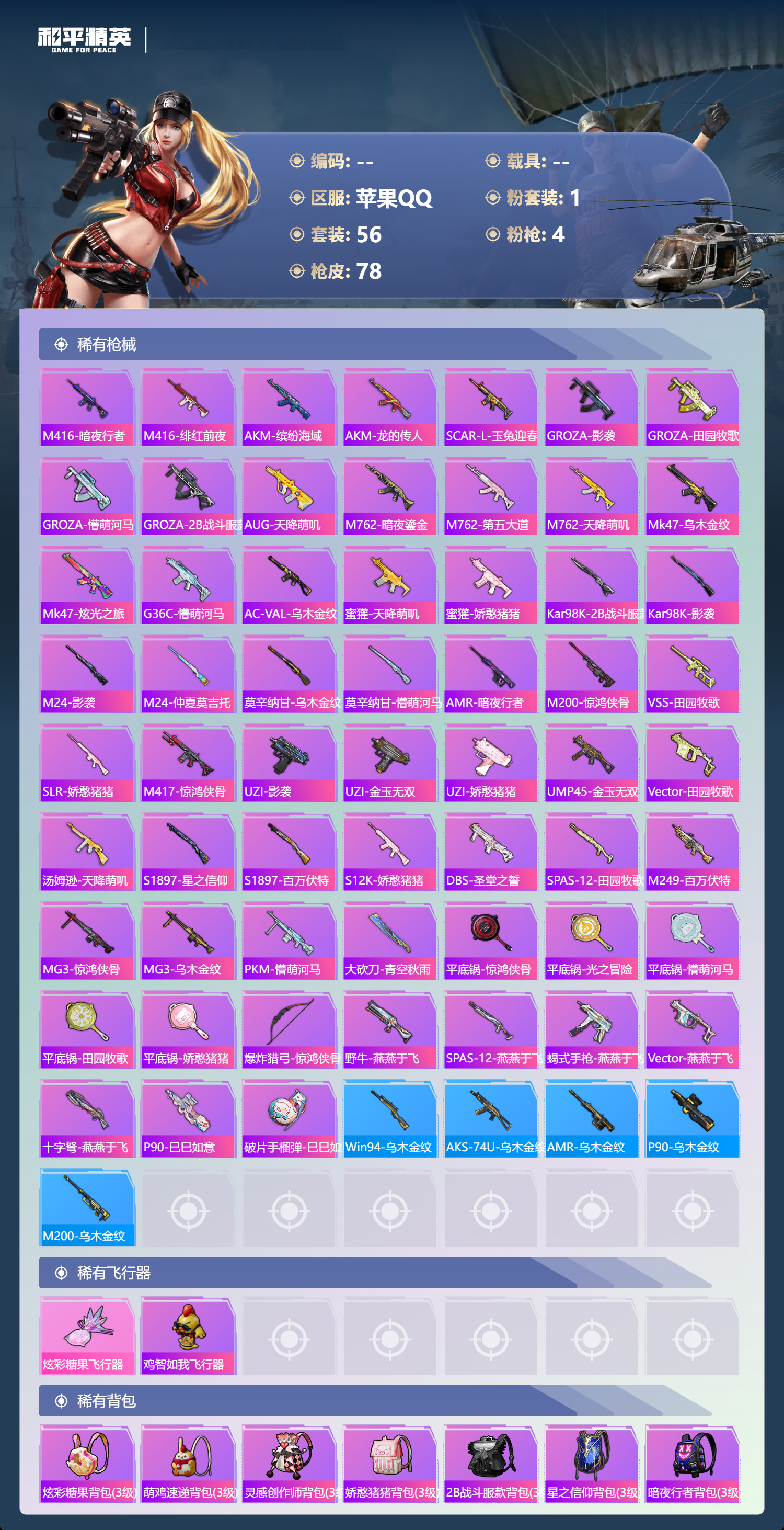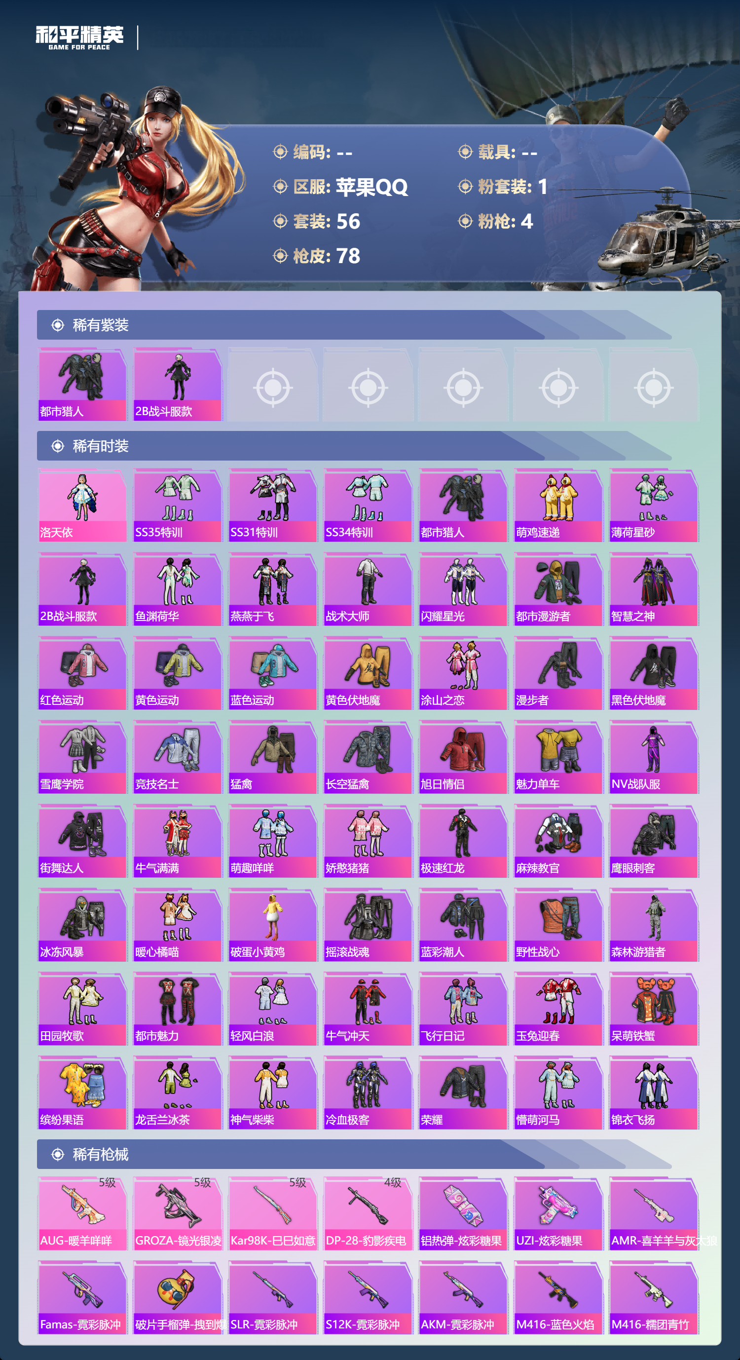 0载具-56套装-78呛皮-【极品词组id饲料】苹果手q-2王牌印记-1粉装-4特效呛-20691热力值-56套装-78呛皮-1卓越印记【1粉装】角色-洛天依【4特效呛】aug-暖羊咩咩/5级groza-镜光银凌/5级kar98k-巳巳如意/5级dp-28-豹影疾电/4级【2稀有紫装】都市猎人2b战斗服款【56稀有时装】洛天依ss35特训ss31特训ss34特训都市猎人萌