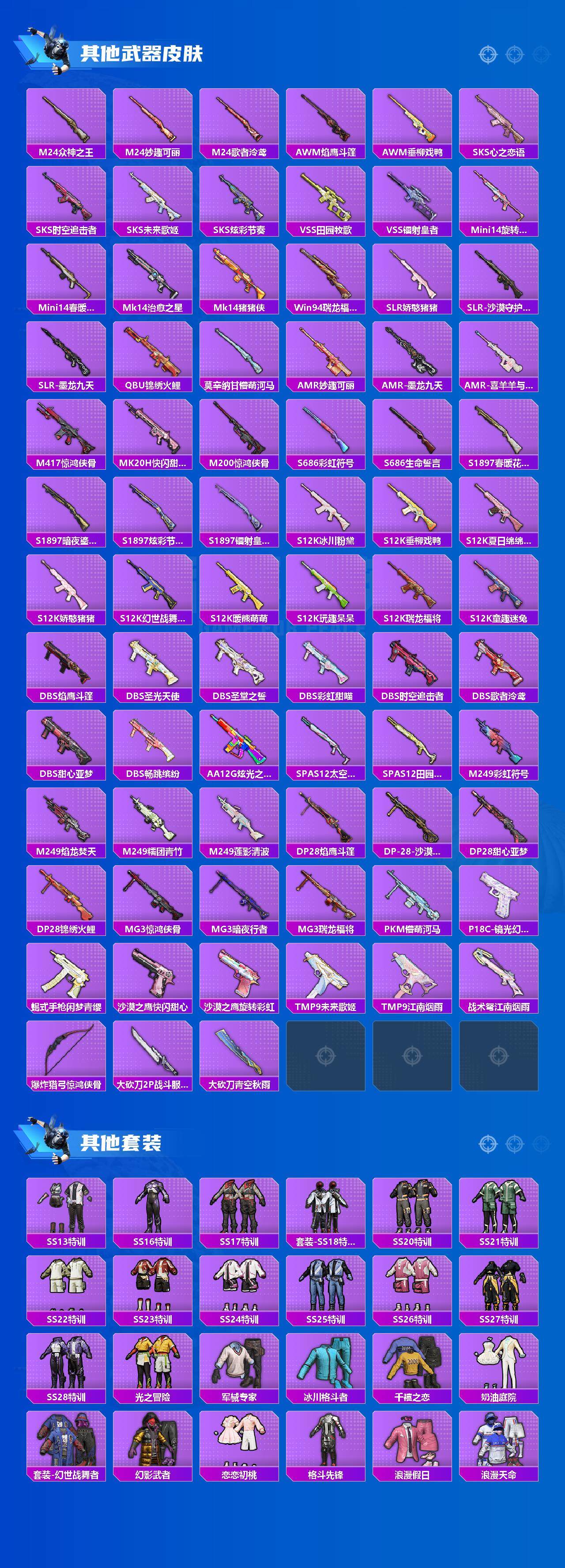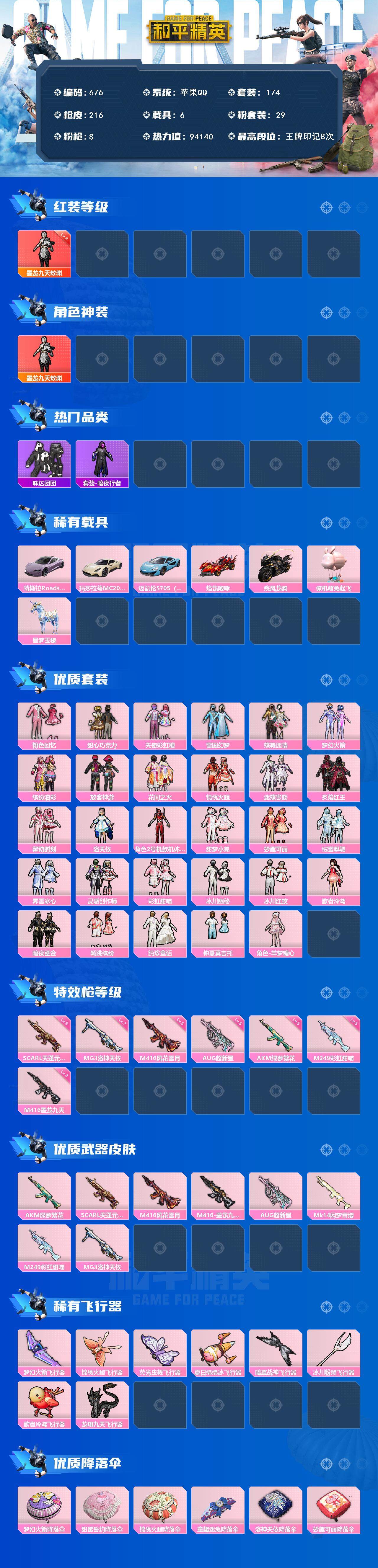 6载具-174套装-216呛皮-174套装/呛械8/装备356/载具6/战备171/王牌印记8/热力值94140/五级akm-绿萝繁花/九级scar-l-天蓬元帅/五级m416-风花雪月/三级m416-墨龙九天/五级aug-超新星/五级m249-彩虹甜喵/七级mg3-洛神天依/二级墨龙九天-敖渊/墨龙九天-敖渊/粉装-雪国幻梦/粉装-梦幻火箭/粉装-畅跳缤纷/粉装-缤纷油彩/套装-浪漫天命/胖达团团/沙漠守护者/暗夜行者/2