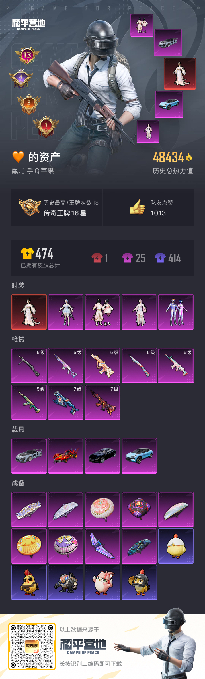 _2294809-133]ky316-苹果q-满天赋1红装4载具3粉装8特效呛7热门95套装132呛皮48434热力值13印记历史传奇王牌16星【1红装】盛世惊鸿-云鸾2级【4载具】路特斯el蓝色玛莎拉蒂q蓝色迈凯伦塞纳冷萃蓝焰龙咆哮【3粉装】梦幻火箭烟云彩露桃粉嫣然【8特效呛】scar-l-锦绣绵绵5级akm-绿萝繁花5级kar98k-巳巳如意5级dp-28-豹影疾电5级aug-暖羊咩咩5级mk14-甜梦熊击5级m416-风花雪月7级vect-环太平洋7级【7热门】mark.06龟仙人醒狮腾龙团圆交子瑞龙福将军刀雅典娜m762-瑞龙福将【1飞行器】梦幻火箭飞行器【1头盔】梦幻火箭头盔【2背包】梦幻火箭背包幻影战神背包营地id: