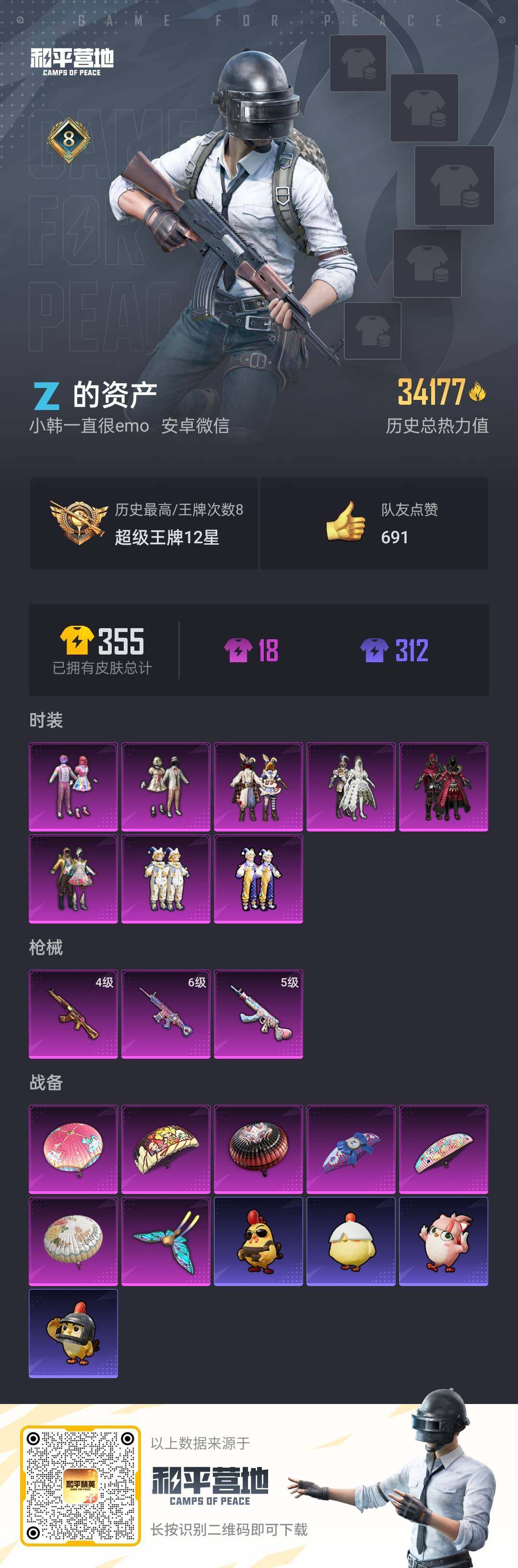 _2295079-可二次-安卓微信-8粉装-3特效呛-老木乃伊-0载具-1粉色飞行器-34177热力值-8王牌印记-80套装-101呛皮 【热门品类】:粉装-童趣迷兔,套装-冥河战士,套装-小丑鱼,套装-潮萌小黄鸭,套装-粉红小猪 【粉色套装】:粉装-宝贝奶油派,粉装-天使彩虹糖,粉装-蝶舞迷情,粉装-冰霜白皇,粉装-童趣迷兔,粉装-炙焰红王,粉装-精灵娃娃,粉装-酣梦娃娃 【粉色呛皮等级】:akm-甜心宝贝四级,scar-l-童趣迷兔六级,m762-甜心娃娃五级 【粉色呛皮】:akm-甜心宝贝,scar-l-童趣迷兔,m762-甜心娃娃 【粉色飞行器】:春暖花开飞行器 【粉色降落伞】:甜心宝贝降落伞,春暖花开降落伞,童趣迷兔降落伞,甜心娃娃降落伞,炙焰牛王降落伞,旋转彩虹降落伞 【稀有呛皮】:akm-夜灯,akm-春暖花开,akm-灼热熔岩,akm-破晓战魂,akm-萌趣颜团子,akm-霓虹街区,akm-龙的传人,m16a4-冥河战士,m16a4-幻世战舞者,m16a4-甜心亚梦,scar-l-玉兔迎春,scar-l-红色方程式,m416-动感兔斯基,m416-圣诞惊喜,m416-红色方程式,m416-蓝色火焰,groza-异彩先驱,groza-彩虹符号,groza-春暖花开,aug-天降萌叽,aug-青春冒险家,q-彩虹符号,q-洛神天依,q-飞驰魅影,m762-瑞龙福将,m762-甜心宝贝,mk47-百万伏特,mk47-青春冒险家,ac-val-甜心亚梦,蜜獾-娇憨猪猪,uzi-娇憨猪猪,uzi-炫彩节奏,ump45-春暖花开,ump45-蓝色火焰,vect-夜灯,vect-彩虹符号,vect-生命誓言,汤姆逊-异彩先驱,野牛-夜灯,野牛-青春冒险家,mp5k-异彩先驱,p90-飞驰魅影,kar98k-炫彩节奏,kar98k-飞驰魅影,m24-炫彩节奏,sks-炫彩节奏,sks-迅猛狂鲨,vss-彩虹符号,mini14-异彩先驱,mini14-旋转彩虹,mini14-春暖花开,mini14-炫彩节奏,mini14-甜心娃娃,mk14-童趣迷兔,win94-瑞龙福将,slr-娇憨猪猪,qbu-青春冒险家,莫辛纳甘-炙焰牛王,s1897-春暖花开,s1897-炫彩节奏,s1897-飞驰魅影,s12k-玩趣呆呆,s12k-瑞龙福将,