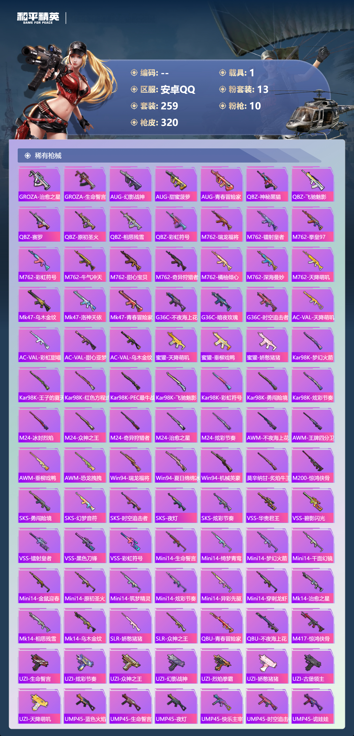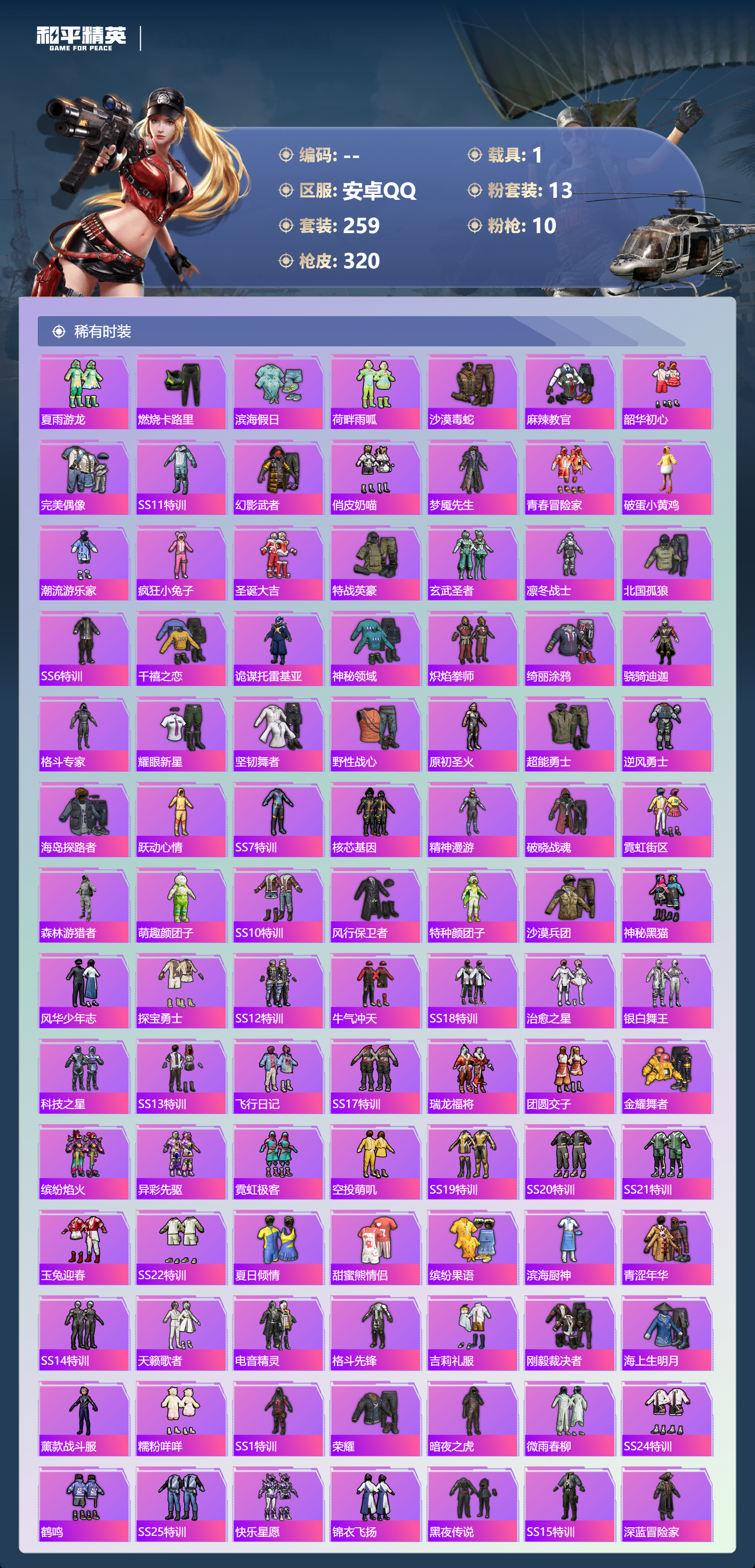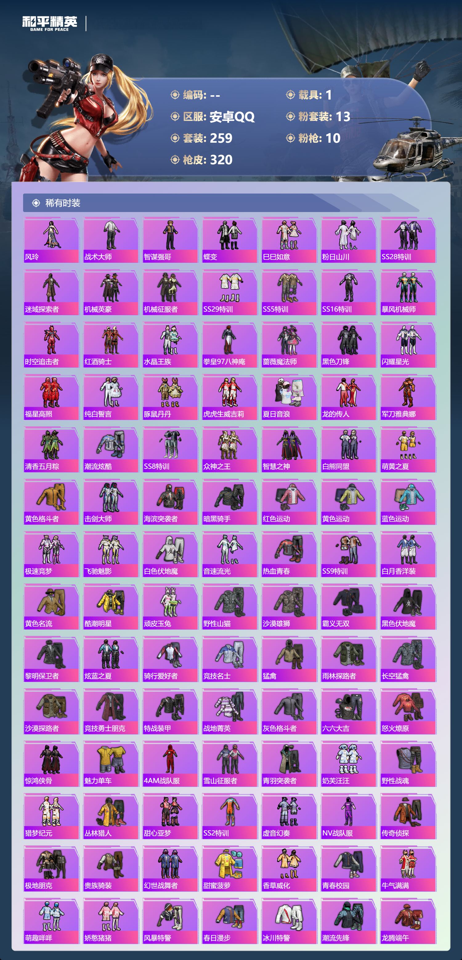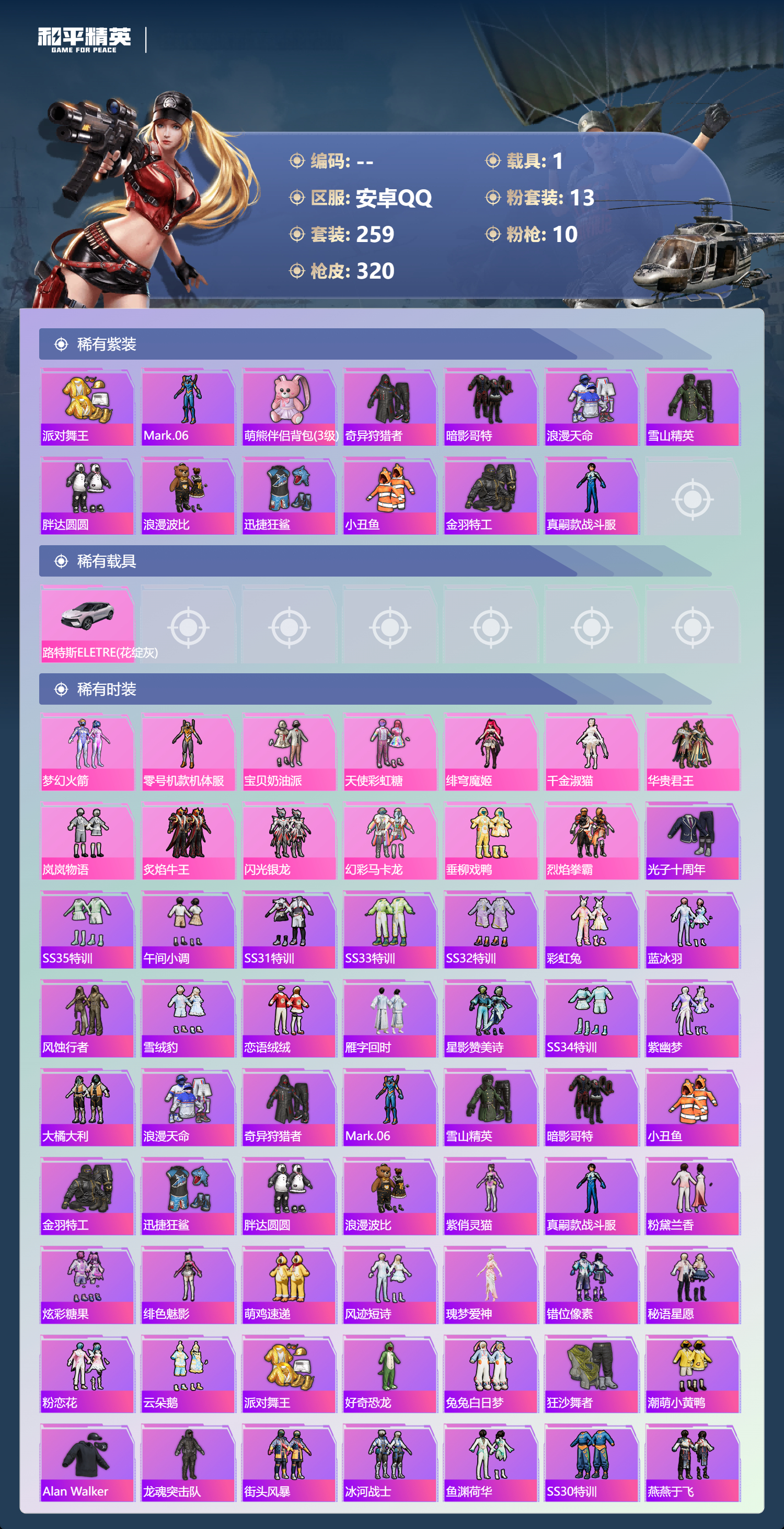 1载具-259套装-320呛皮-【哥特金鞋黄螳螂火箭 9升级呛1载具 】安卓手q-16王牌印记-13粉装-10特效呛-1载具-热力值-259套装-320呛皮-2卓越印记-1传奇印记【13粉装】套装-梦幻火箭角色-千金淑猫角色-零号机款机体服套装-岚岚物语套装-天使彩虹糖套装-炙焰牛王角色-绯穹魔姬套装-华贵君王套装-宝贝奶油派套装-垂柳戏鸭套装-幻彩马卡龙套装-闪光银龙套装-烈焰拳