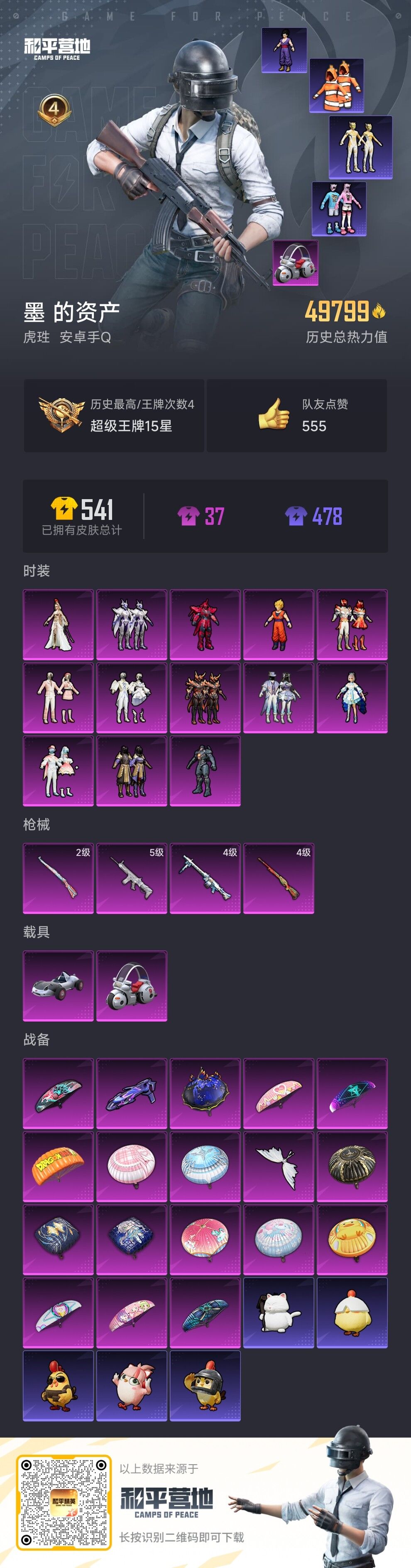 0载具-0套装-0呛皮-热力值:49799,13粉装,4粉呛,2载具,18粉色战备,109套装,133呛械,193装备,4滑翔尾翼,47降落伞;等级:lv.65 历史最高段位:超级王牌15星 当前段位:英勇.黄金ⅲ;王牌印记4次; 【热门套装】:套装-小丑鱼,角色-军刀雅典娜,套装-龟仙人;【粉色套装】:粉装-甜梦冰蝶,粉