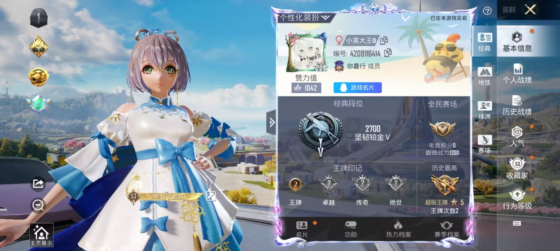 0载具-0套装-0呛皮-热力值:48665,11粉装,5粉呛,3载具,8粉色战备,102套装,122呛械,138装备,2滑翔尾翼,33降落伞;等级:lv.64 历史最高段位:超级王牌5星 当前段位:坚韧.铂金ⅴ;王牌印记2次; 【热门套装】:套装-浪漫天命,套装-小丑鱼,套装-浪漫波比,小恶魔头饰;【粉色套装】:粉装-王牌