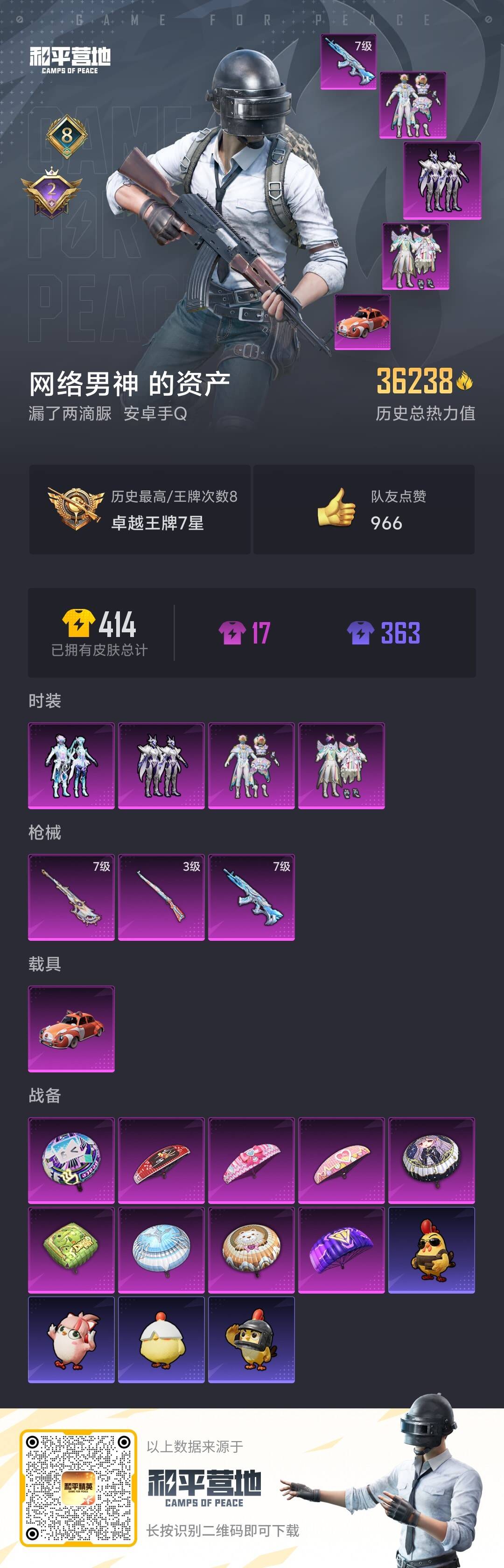 0载具-0套装-0呛皮-热力值:36238,4粉装,3粉呛,1载具,9粉色战备,99套装,114呛械,109装备,3滑翔尾翼,43降落伞;等级:lv.63 历史最高段位:卓越王牌7星 当前段位:坚韧.铂金ⅴ;王牌印记8次 卓越印记2次; 【热门套装】:套装-龟仙人;【粉色套装】:粉装-彩虹鹿灵,粉装-山涧鹿灵,粉装-紫电风