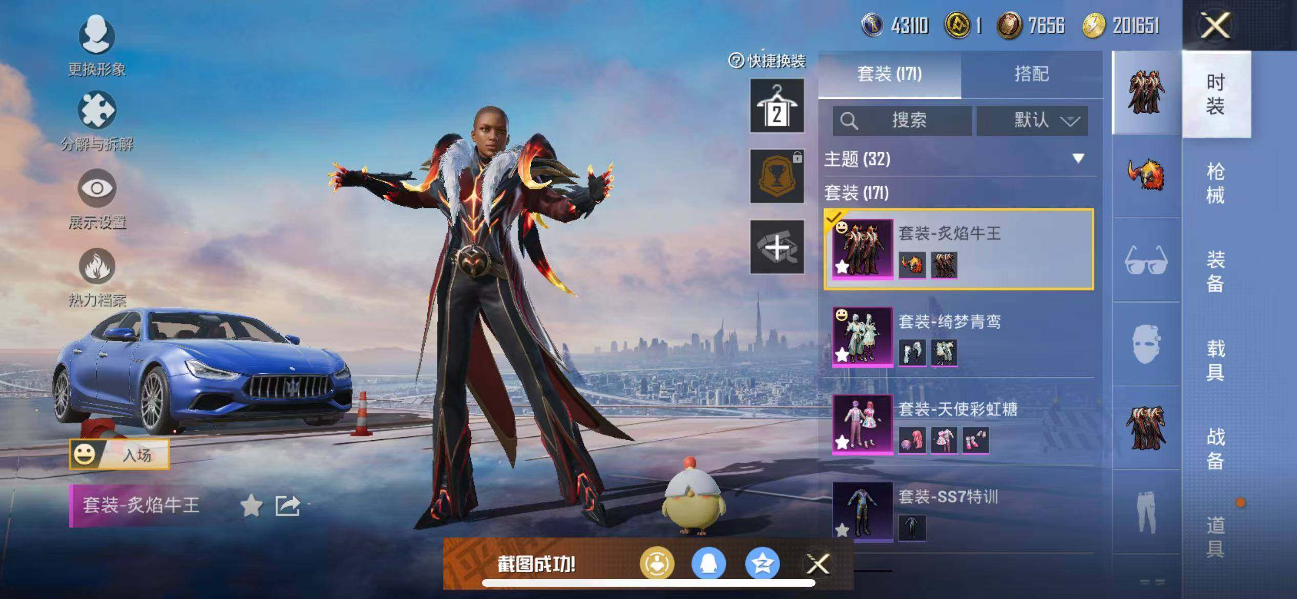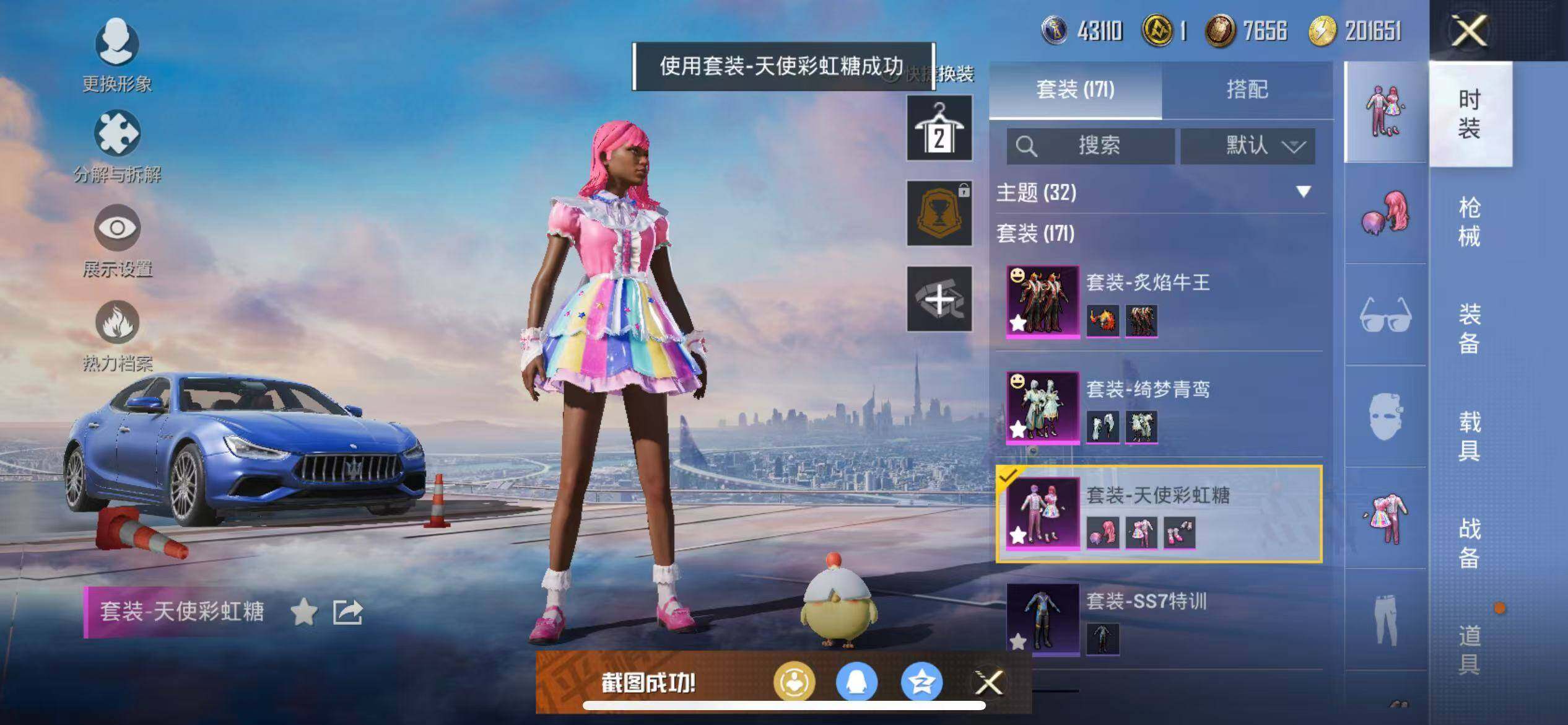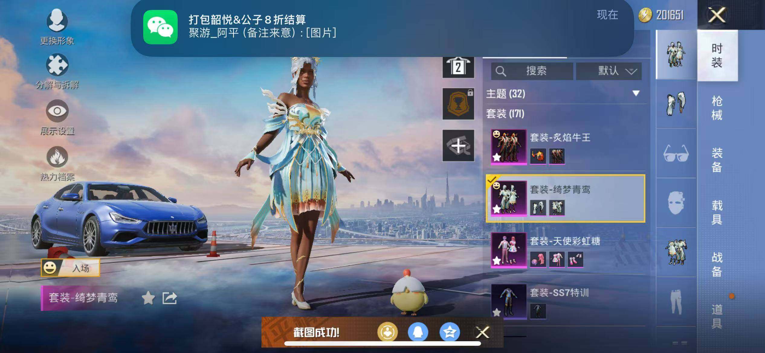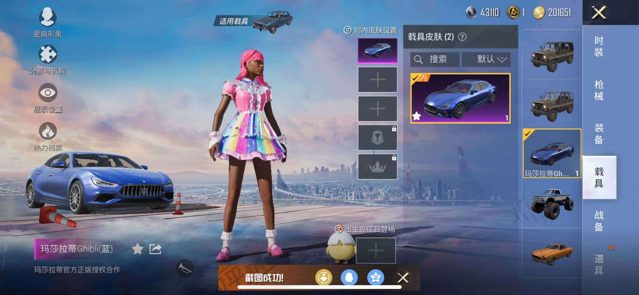 2载具-170套装-168呛皮-【战神框 两载具小号】:苹果 手q-3粉装-1特效呛-2载具-52850热力值-12印记-170套装-168呛皮 【稀有载具】:阿斯顿马丁dbx(蓝),玛莎拉蒂ghibli(蓝) 【特效呛等级】:m416-心之恋语六级 【优质套装】:粉装-天使彩虹糖,粉装-绮梦青鸾,粉装-炙焰牛王 【稀有套装】:套装-龟仙人,套装-粉恋花,套装-紫幽梦,套装-蓝冰羽,套装-星影赞美诗 【优质武器皮肤】:m