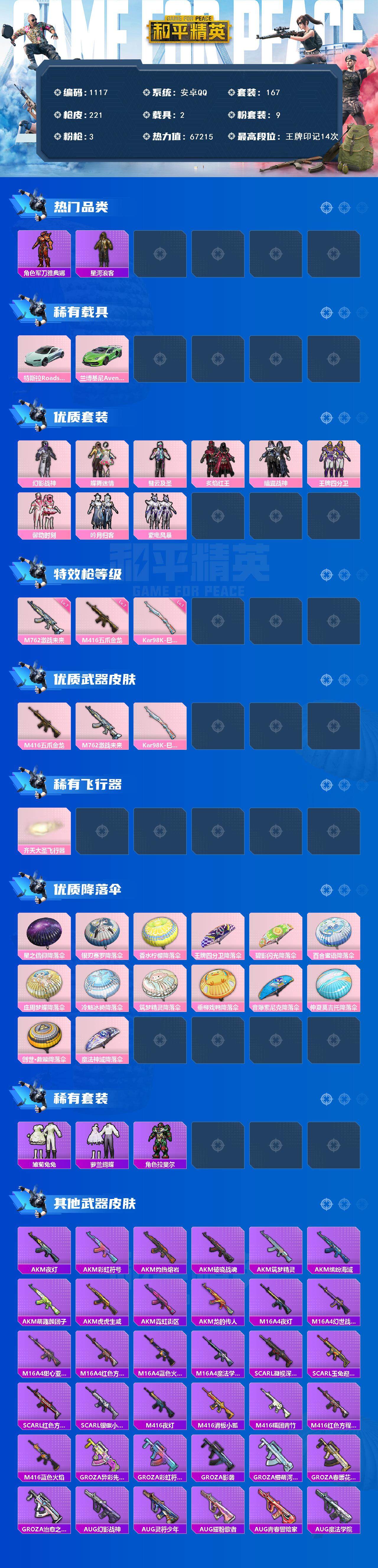 2载具-167套装-221呛皮-167套装/呛械3/装备263/载具2/战备139/王牌印记14/热力值67215/七级m416-五爪金龙/七级m762-激战未来/kar98k-巳巳如意/军刀雅典娜/星河浪客/套装-龟仙人/套装-暗影哥特/角色-mark.06/特斯拉roadster水滴蓝/兰博基尼aventad svj翡翠绿/幻影战神/蝶舞迷情/彗云及圣/炙焰红王/暗翼战神/王牌四分卫/馨动时刻/粉装-吟月归客