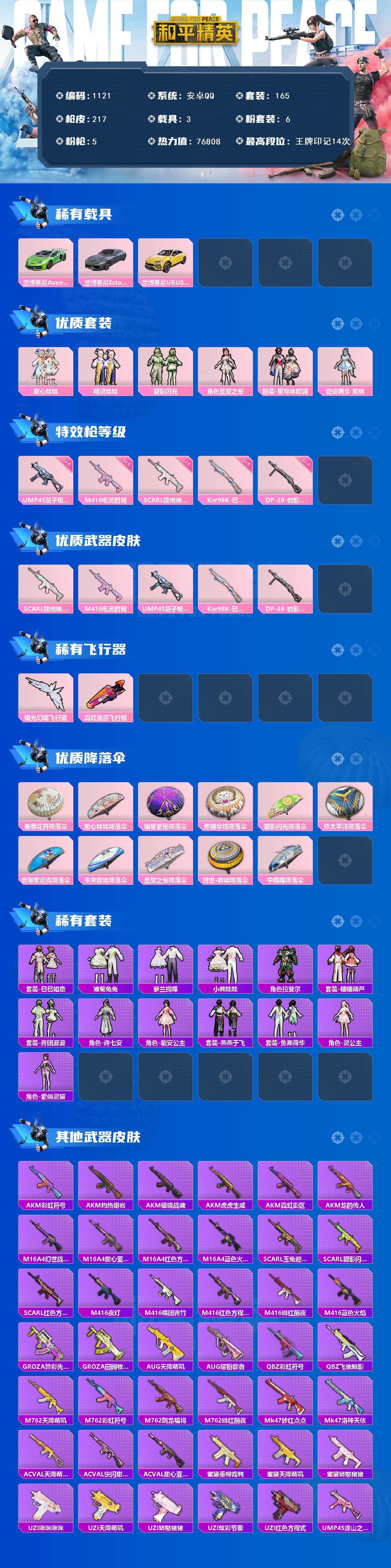 3载具-165套装-217呛皮-165套装/呛械5/装备315/载具3/战备183/王牌印记14/热力值76808/五级scar-l-锦绣绵绵/五级m416-电玩时刻/五级ump45-量子极限/五级kar98k-巳巳如意/四级dp-28-豹影疾电/套装-龟仙人/兰博基尼aventad svj翡翠绿/兰博基尼estoque银翼灰/兰博基尼urus明艳黄/甜心娃娃/精灵娃娃/碧影闪光/圣堂之誓/粉装-星穹咏叹调/