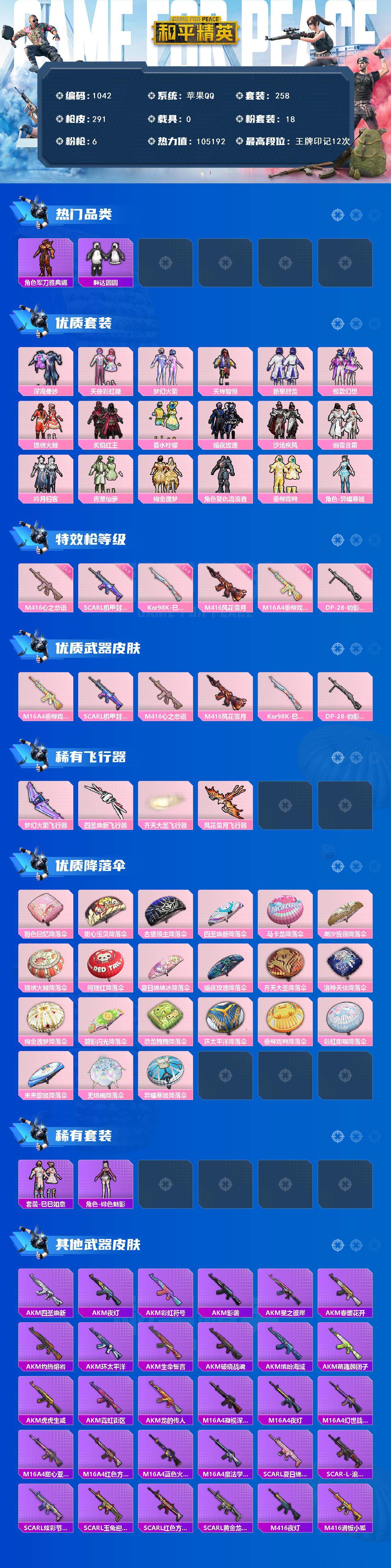 0载具-258套装-291呛皮-258套装/呛械6/装备396/战备219/王牌印记12/热力值/四级m16a4-垂柳戏鸭/五级scar-l-机甲封神/七级m416-心之恋语/四级m416-风花雪月/五级kar98k-巳巳如意/四级dp-28-豹影疾电/粉装-梦幻火箭/套装-浪漫天命/奇异狩猎者/军刀雅典娜/胖达圆圆/浪客战士/套装-龟仙人/套装-潮萌小黄鸭/套装-暗影哥特/套装-粉红小猪/深海曼妙/天使彩虹糖/