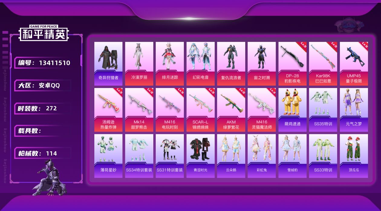 0载具-70套装-114呛皮-yzj11539-可二次-安卓q-1稀有5粉装9特效呛3热门70套装114呛皮 36686热力值 精氪号 特效呛多 3级m416灵猫魔法师 绯月迷踪 冷漠罗丽 奇异狩猎者 复仇流浪者 彩虹兔 云朵鹅 雪绒豹 9升级呛8满级 灵猫魔法师飞行器 4印记 历史卓越王牌15星 【1稀有】 奇异狩猎者 【5粉装】 绯月迷踪 冷漠罗丽 宙之时溯 幻彩电音 复仇流浪者 【9特效呛】 scar-l-锦绣绵绵