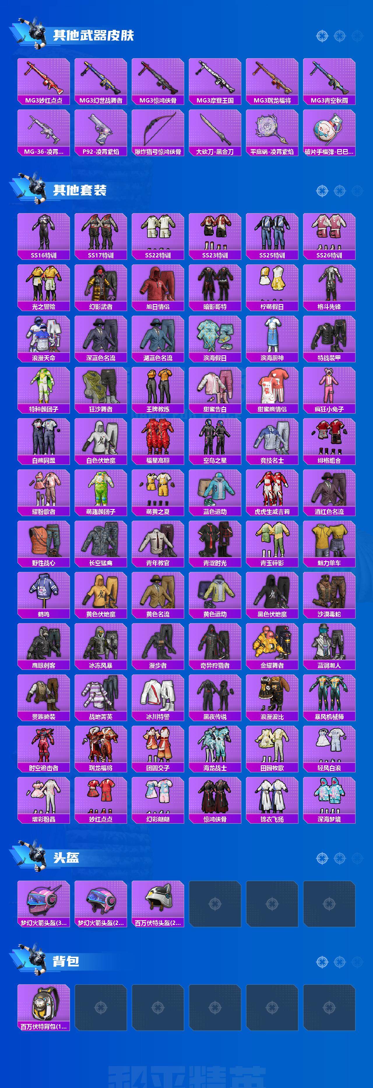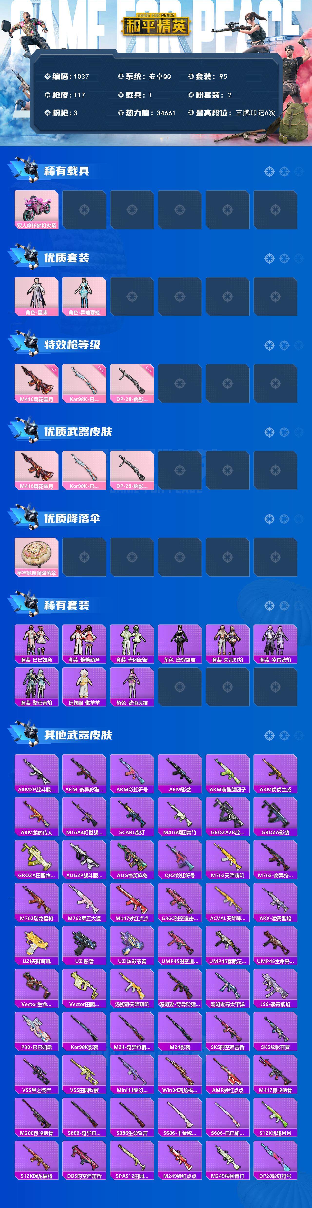 1载具-95套装-117呛皮-95套装/呛械3/装备105/载具1/战备90/王牌印记6/热力值34661/七级m416-风花雪月/五级kar98k-巳巳如意/五级dp-28-豹影疾电/套装-浪漫天命/奇异狩猎者/套装-暗影哥特/套装-浪漫波比/双人摩托-梦幻火箭/角色-星渊/角色-异瞳寒姬/m416-风花雪月/kar98k-巳巳如意/dp-28-豹影疾电/星穹咏叹调降落伞/巳巳如意/套装-糖糖葫芦/套装-青团波波/摩登魅