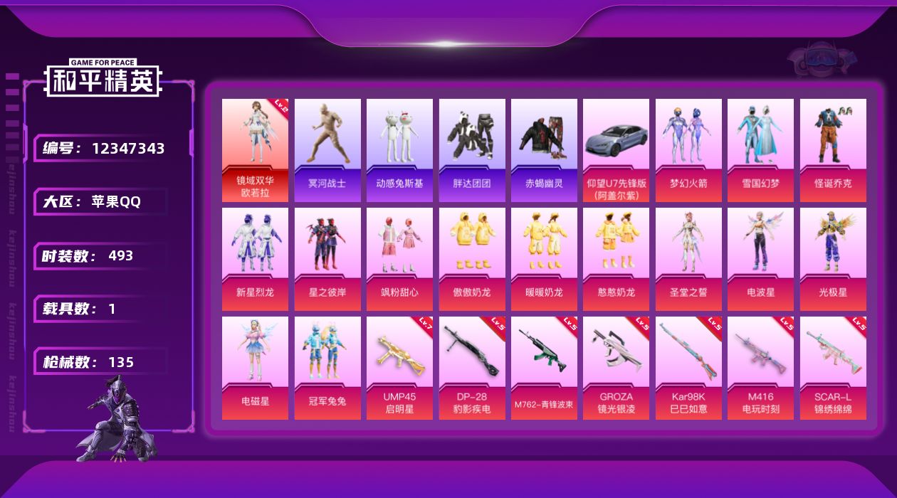 1载具-131套装-135呛皮-yzj10942-可二次-苹果q-1红装3稀有1载具14粉装7特效呛10热门131套装135呛皮 51792热力值 6印记1卓越1传奇 精品素材号 2级欧若拉 梦幻火箭 雪国幻梦 小丑 木乃伊 赤蝎 天命 小白龙 胖达 红眼罩 历史超级王牌11星 【1红装】 镜域双华-欧若拉 2级 【3稀有】 木乃伊 赤蝎幽灵 浪漫天命 【1载具】 仰望u7先锋版阿盖尔紫 【14粉装】 圣堂之誓 梦幻
