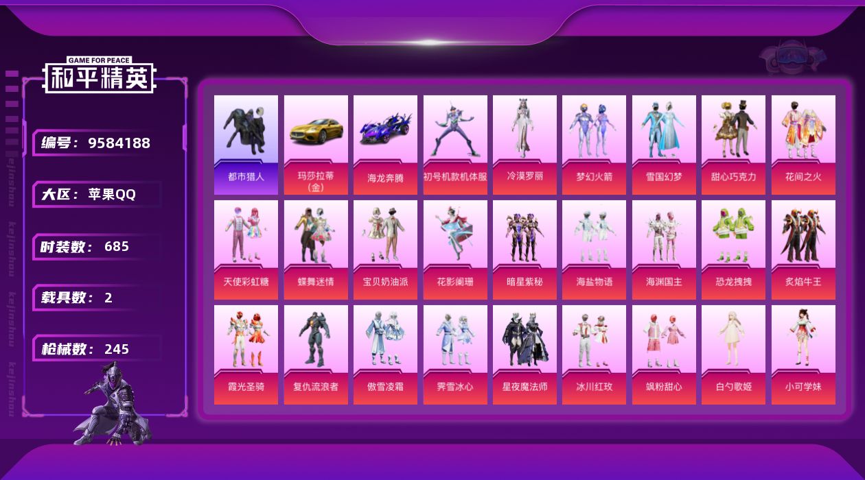 2载具-197套装-245呛皮yzj9654 可二次 苹果q-96775热力值 8王牌印记 历史无敌战神 194套装 紫螳螂 梦幻火箭 雪国 巧克力三姐妹 小可学妹 小番茄 小丑鱼 都市 迅捷狂鲨 天命 红眼罩 粉熊背包 满级m416-暖熊萌萌 245呛皮 【2载具】 玛莎拉蒂金色 海龙奔腾 【2稀有】 都市猎人 浪漫天命 【26粉装】 紫螳螂 梦幻火箭 蝶舞迷情 小蓝 美琪 雪国幻梦 宝贝奶油派 天使彩虹