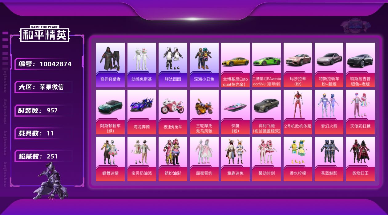 11载具-250套装-252呛皮-yzj9858-可二次社交限制-苹果v-热力值 12王牌印记 历史传奇王牌19星 梦幻 猪脸 红螳螂 发光眼罩 两姐妹 深海小丑鱼 鲨鱼裤 小可学妹 白芍歌姬 馨动时刻 童趣迷兔 粉熊包 粉玛莎 5级五爪 4级心之恋语 34粉6特10载2僚机1快艇 250套装 251呛皮 【13载具】 兰博轿车金色 宾利飞驰布罗德盖棕双色 玛莎拉蒂粉色 兰博svj绿色 阿斯顿马丁s绿色 特斯拉