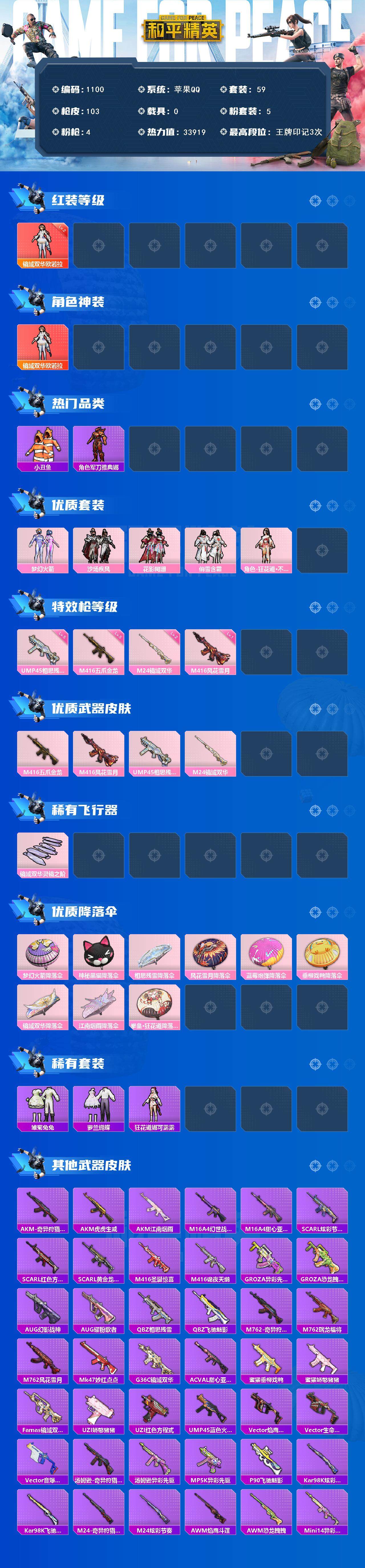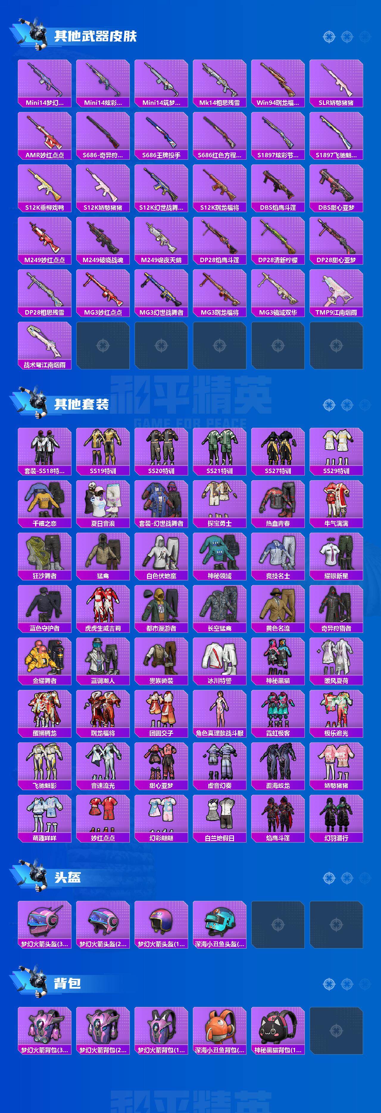 0载具-59套装-103呛皮-59套装/呛械4/装备105/战备64/王牌印记3/热力值33919/五级m416-五爪金龙/m416-风花雪月/五级ump45-相思残雪/二级m24-镜域双华/二级镜域双华-欧若拉/欧若拉/粉装-梦幻火箭/小丑鱼/奇异狩猎者/军刀雅典娜/梦幻火箭/沙场疾风/花影阑珊/粉装-俏雪含霜/角色-狂花道·不知火舞/m416-五爪金龙/ump45-相思残雪/m24-镜域双华/镜域双华-灵镜之阶/梦幻火