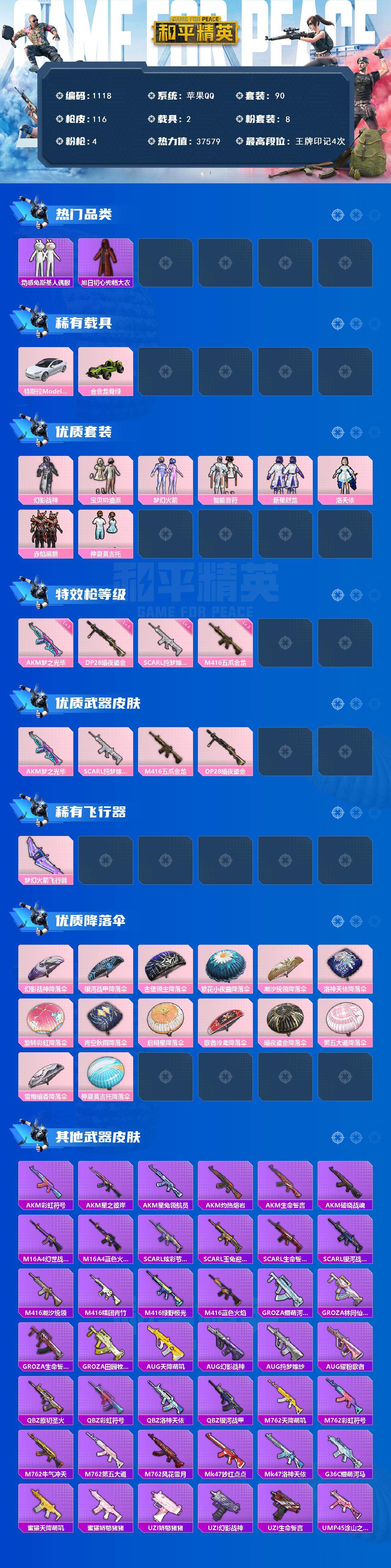 2载具-90套装-116呛皮-90套装/呛械4/装备132/载具2/战备101/王牌印记4/热力值37579/五级akm-梦之光华/四级scar-l-纯梦嫁纱/三级m416-五爪金龙/五级dp-28-暗夜鎏金/粉装-梦幻火箭/套装-浪漫天命/奇异狩猎者/动感兔斯基人偶服/旭日初心兜帽大衣/套装-龟仙人/套装-暗影哥特/特斯拉model 3珍珠白/合金龙骨(绿)/幻影战神/宝贝奶油派/梦幻火箭/智能音符/新星烈龙/洛天依