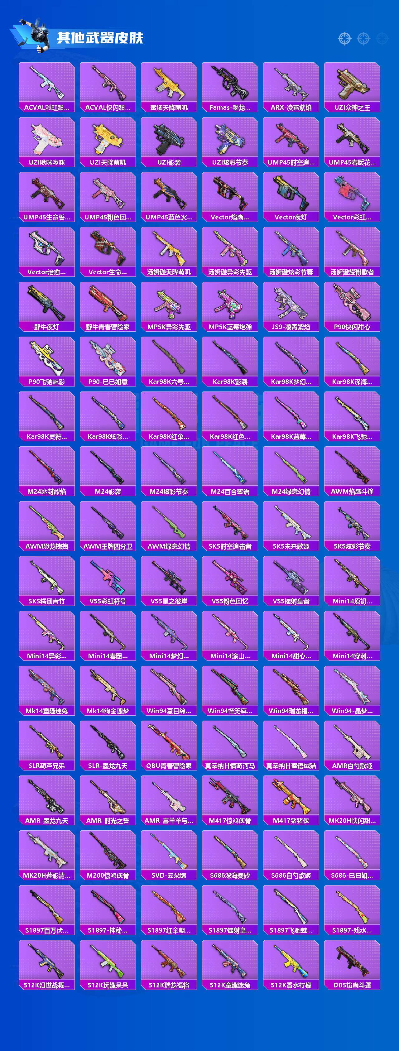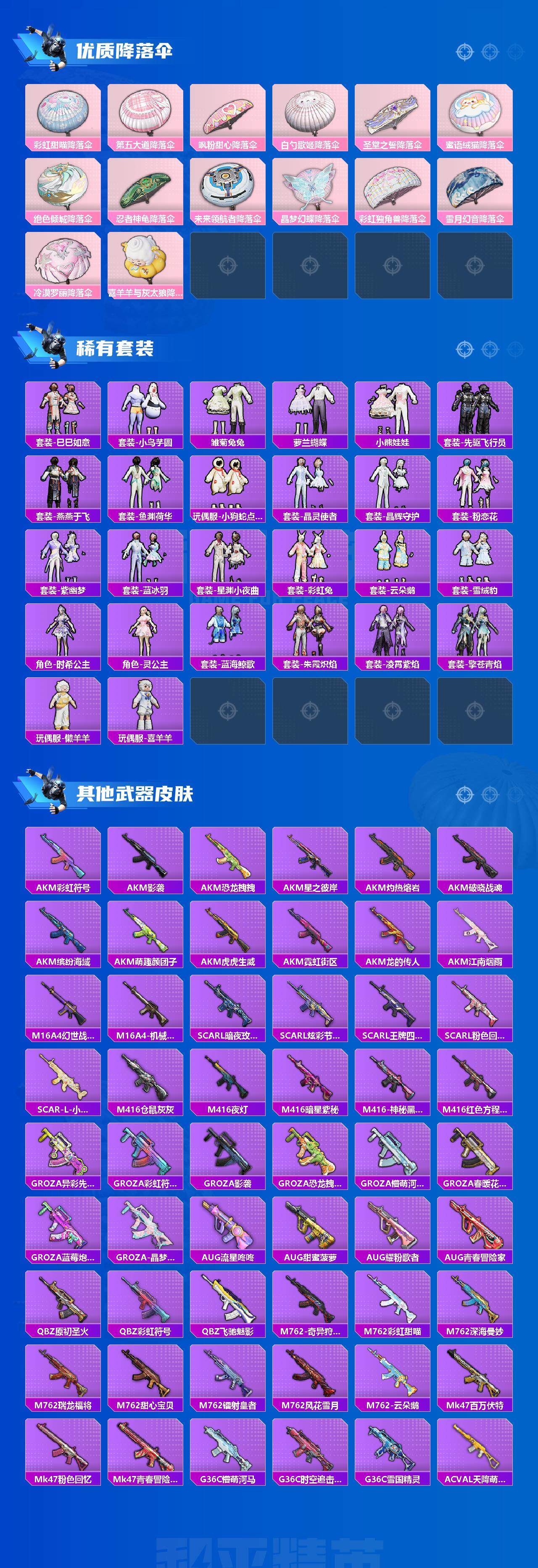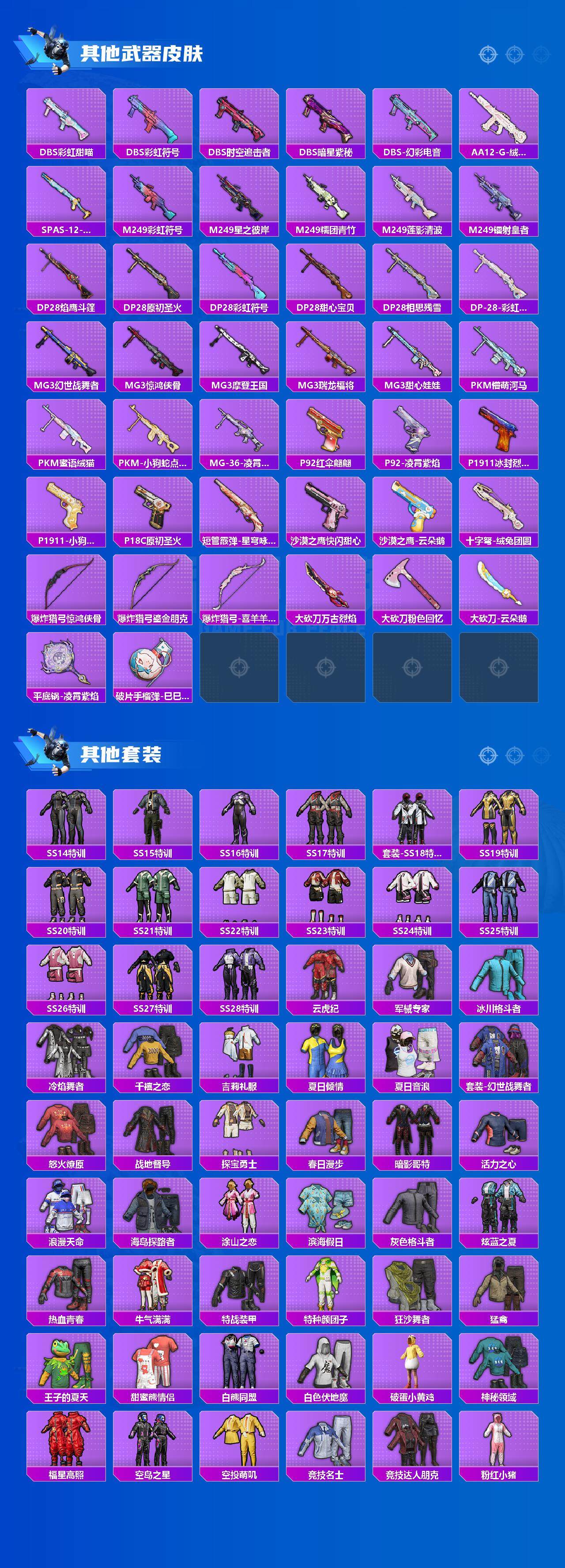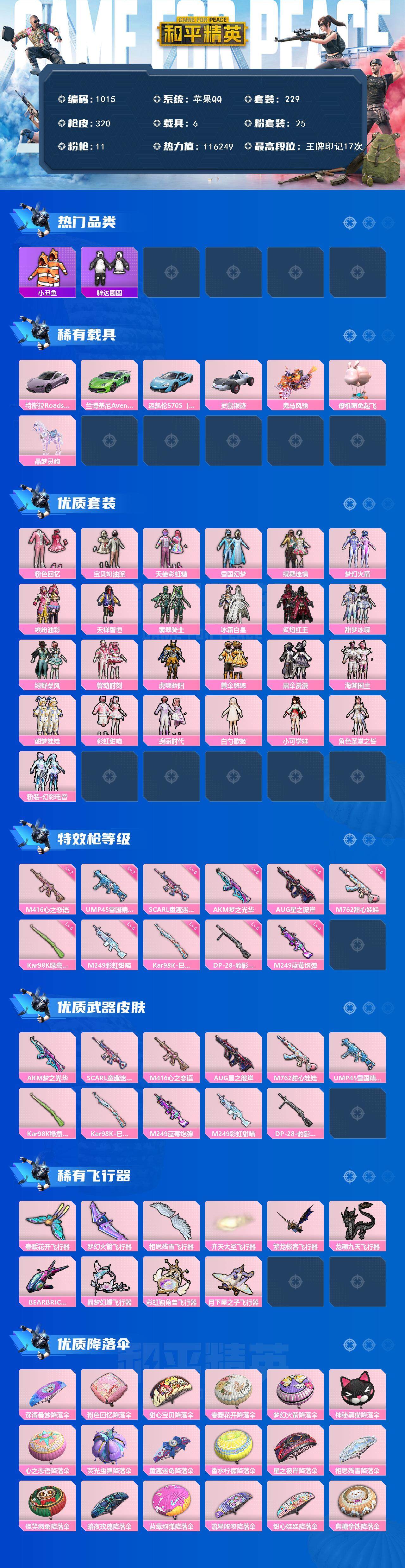 6载具-229套装-320呛皮-229套装/呛械11/装备436/载具6/战备222/王牌印记17/热力值/五级akm-梦之光华/六级scar-l-童趣迷兔/七级m416-心之恋语/五级aug-星之彼岸/五级m762-甜心娃娃/七级ump45-雪国精灵/五级kar98k-绿意幻情/五级kar98k-巳巳如意/三级m249-蓝莓炮弹/五级m249-彩虹甜喵/五级dp-28-豹影疾电/粉装-雪国幻梦/粉装-梦幻火箭/