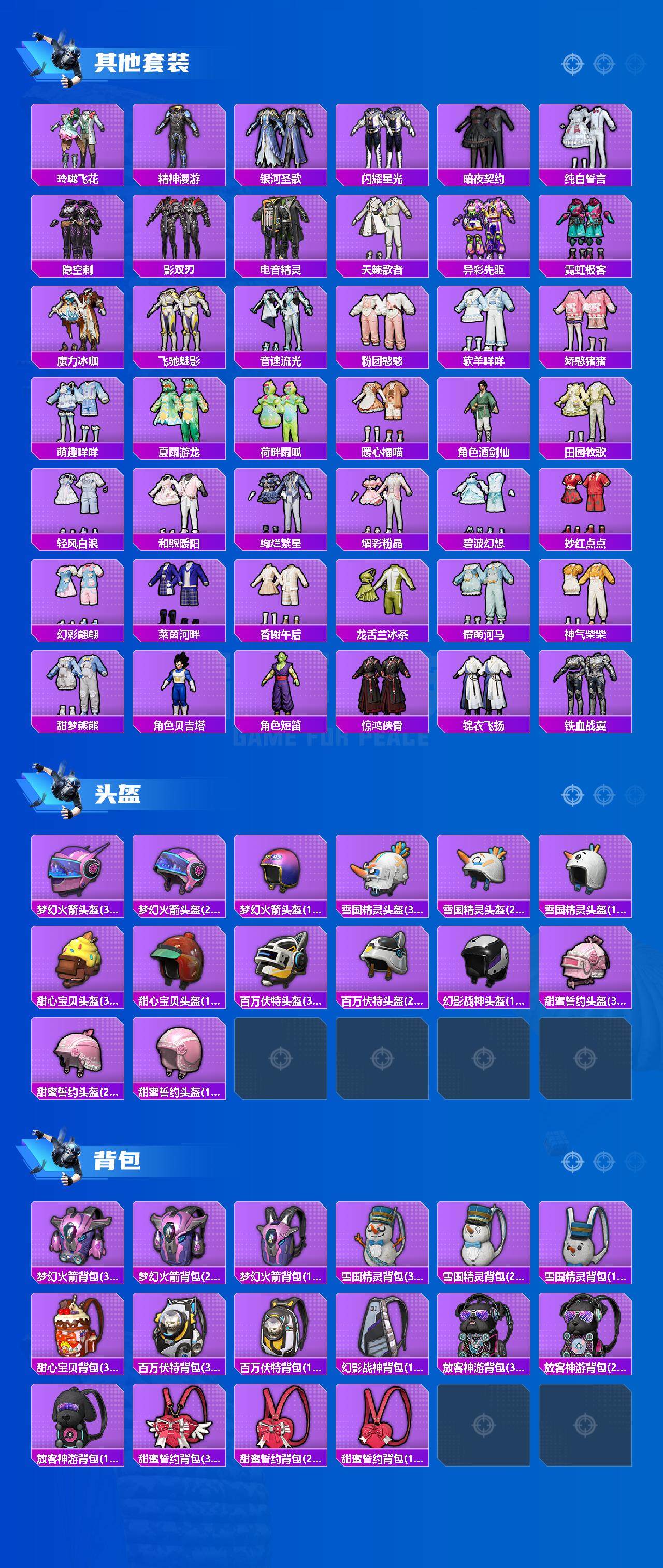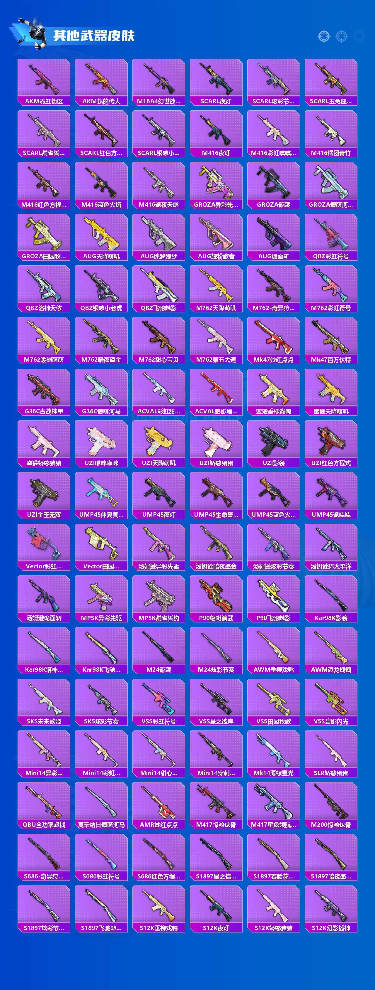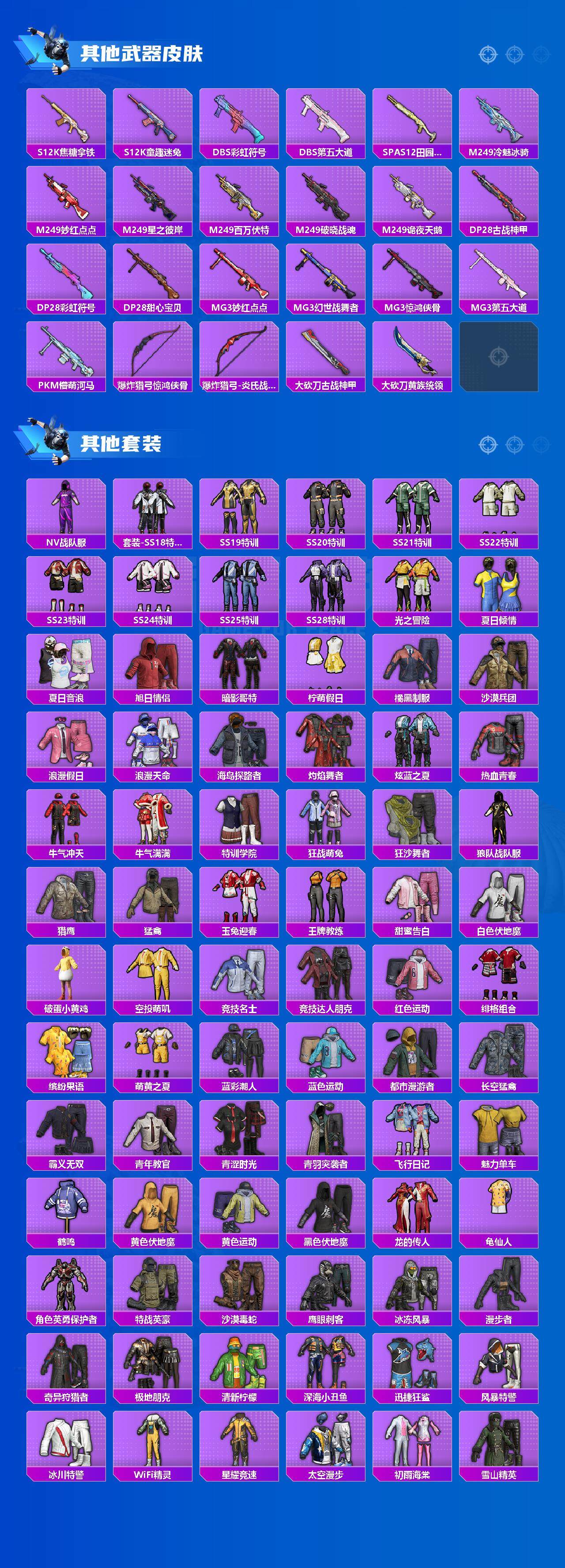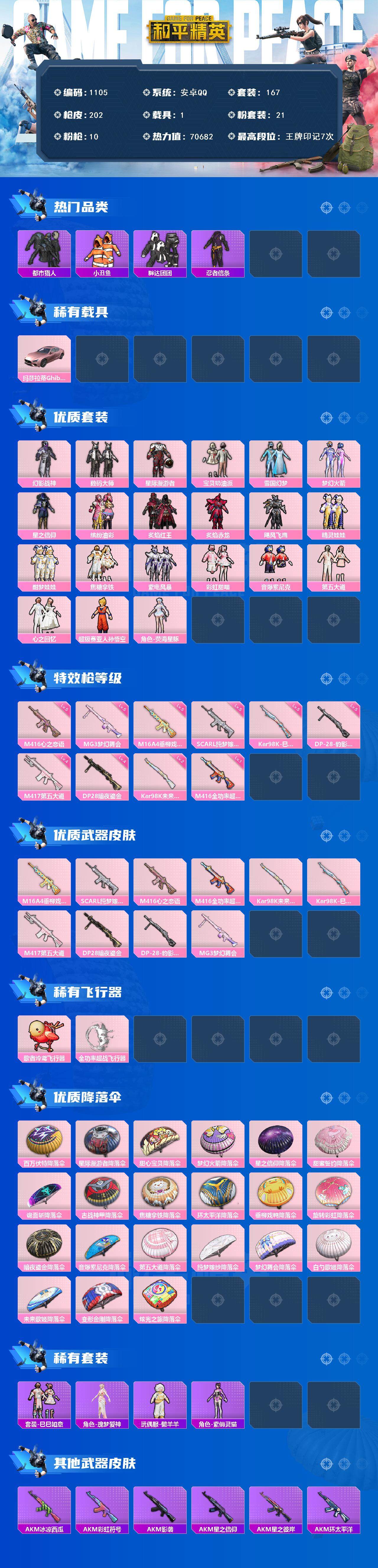 1载具-167套装-202呛皮-167套装/呛械10/装备285/载具1/战备123/王牌印记7/热力值70682/五级m16a4-垂柳戏鸭/五级scar-l-纯梦嫁纱/五级m416-心之恋语/m416-全功率超战/二级kar98k-未来歌姬/五级kar98k-巳巳如意/四级m417-第五大道/四级dp-28-暗夜鎏金/五级dp-28-豹影疾电/五级mg3-梦幻舞会/粉装-雪国幻梦/粉装-梦幻火箭/粉装-音爆索尼克/粉装-缤