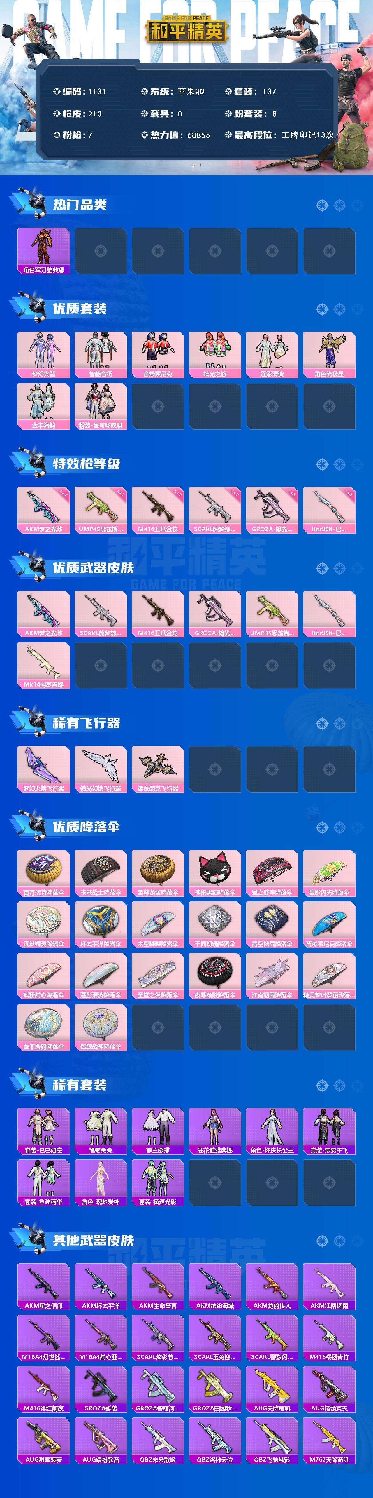0载具-137套装-210呛皮-137套装/呛械7/装备276/战备139/王牌印记13/热力值68855/七级akm-梦之光华/七级scar-l-纯梦嫁纱/七级m416-五爪金龙/五级groza-镜光银凌/七级ump45-恐龙拽拽/五级kar98k-巳巳如意/粉装-梦幻火箭/粉装-音爆索尼克/奇异狩猎者/军刀雅典娜/2b战斗服款/套装-龟仙人/角色-8号机/角色-mark.06/梦幻火箭/智能音符/音爆索尼克/炫光之旅/莲