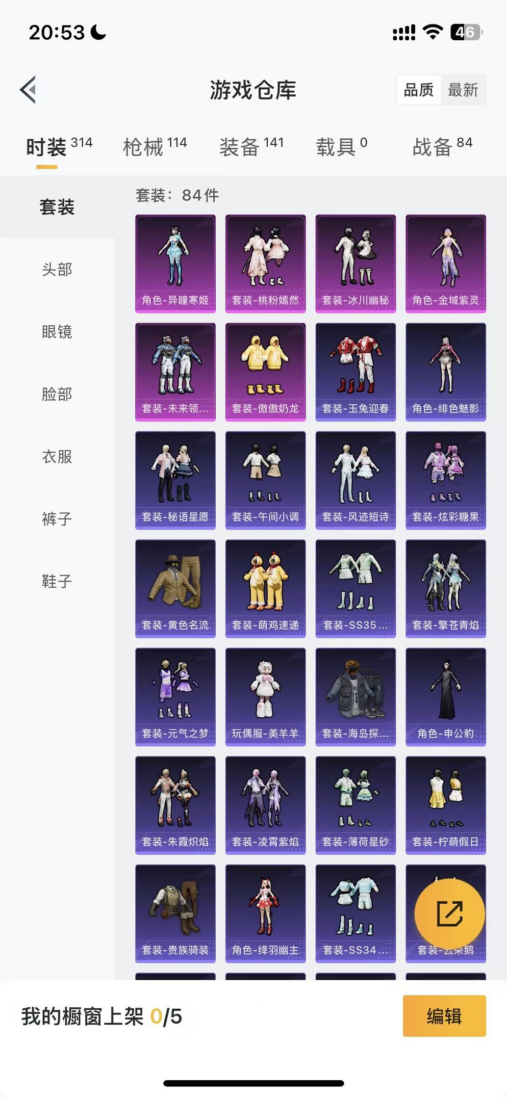 0载具-84套装-114呛皮-【满级心之恋语 6粉装5特效呛 可秒换绑】 苹果q区-37248热力值-5印记-84套装-114呛皮 【6粉装】 傲傲奶龙 冰川幽秘 桃粉嫣然 角色-金域紫灵 套装-未来领航者 角色-异瞳寒姬【5特效呛】 scar-l-锦绣绵绵5级 m416-心之恋语7级 groza-镜光银凌5级 kar98k-巳巳如意5级 dp-28-豹影疾电5级【14热门】 m416-