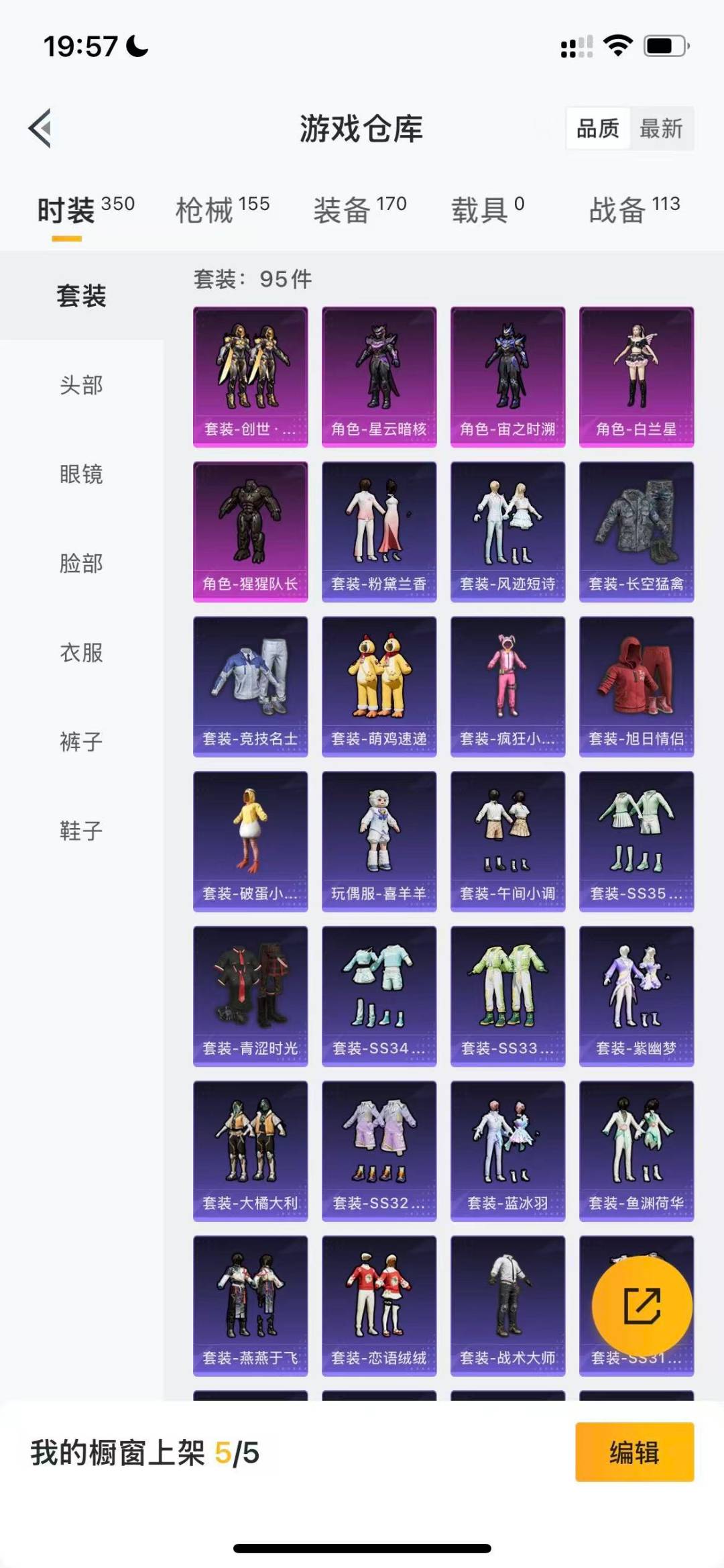 0载具-95套装-137呛皮-5粉装 6特效呛 7印记 可二次 可修改实名 【热门装扮】:猩猩队长白兰星宙之时溯星云暗核创世·救赎 【稀有呛皮】:12-雪月幻音kar98k-巳巳如意ump45量子极限dp-28-豹影疾电m416心之恋语scar-l 万古烈焰 【七级特效呛】:七级m416-心之恋语七级m