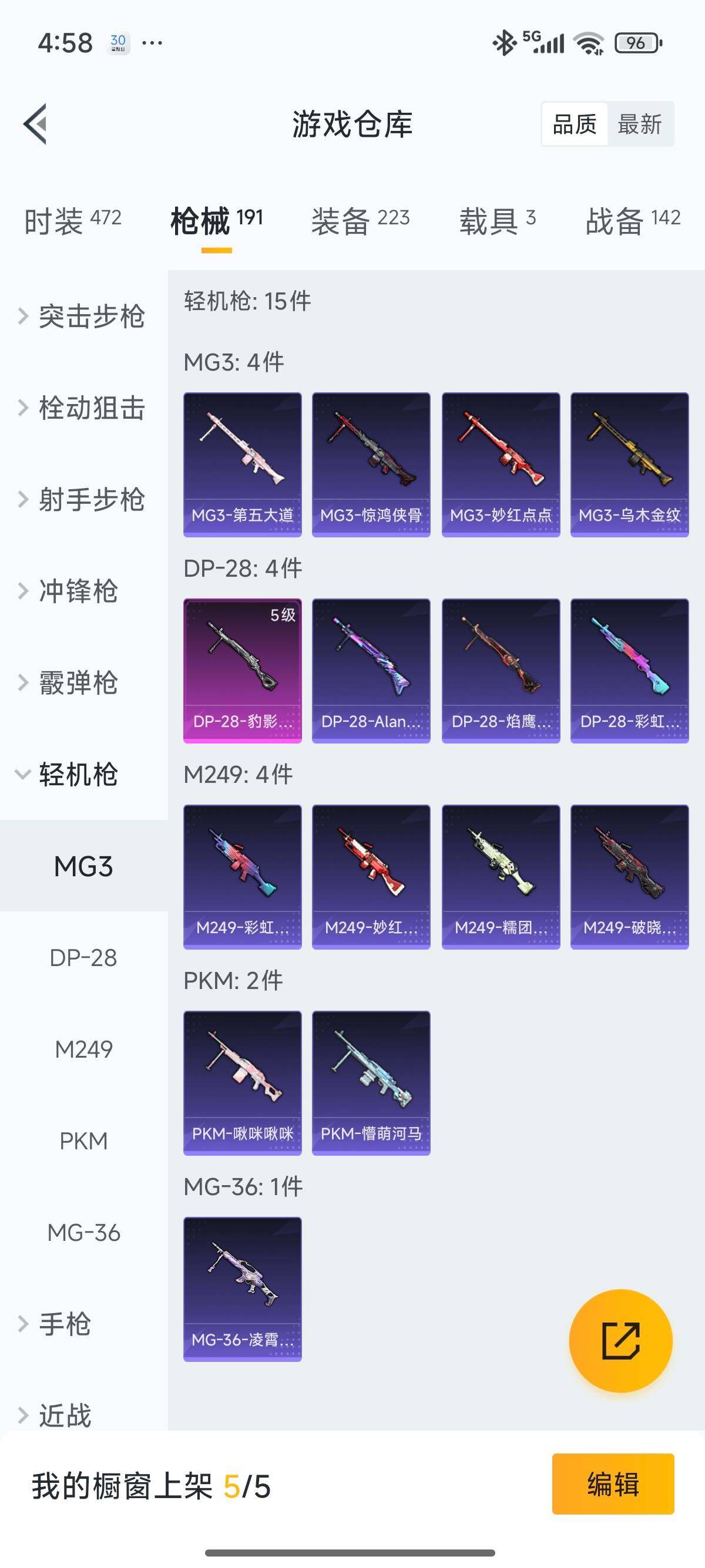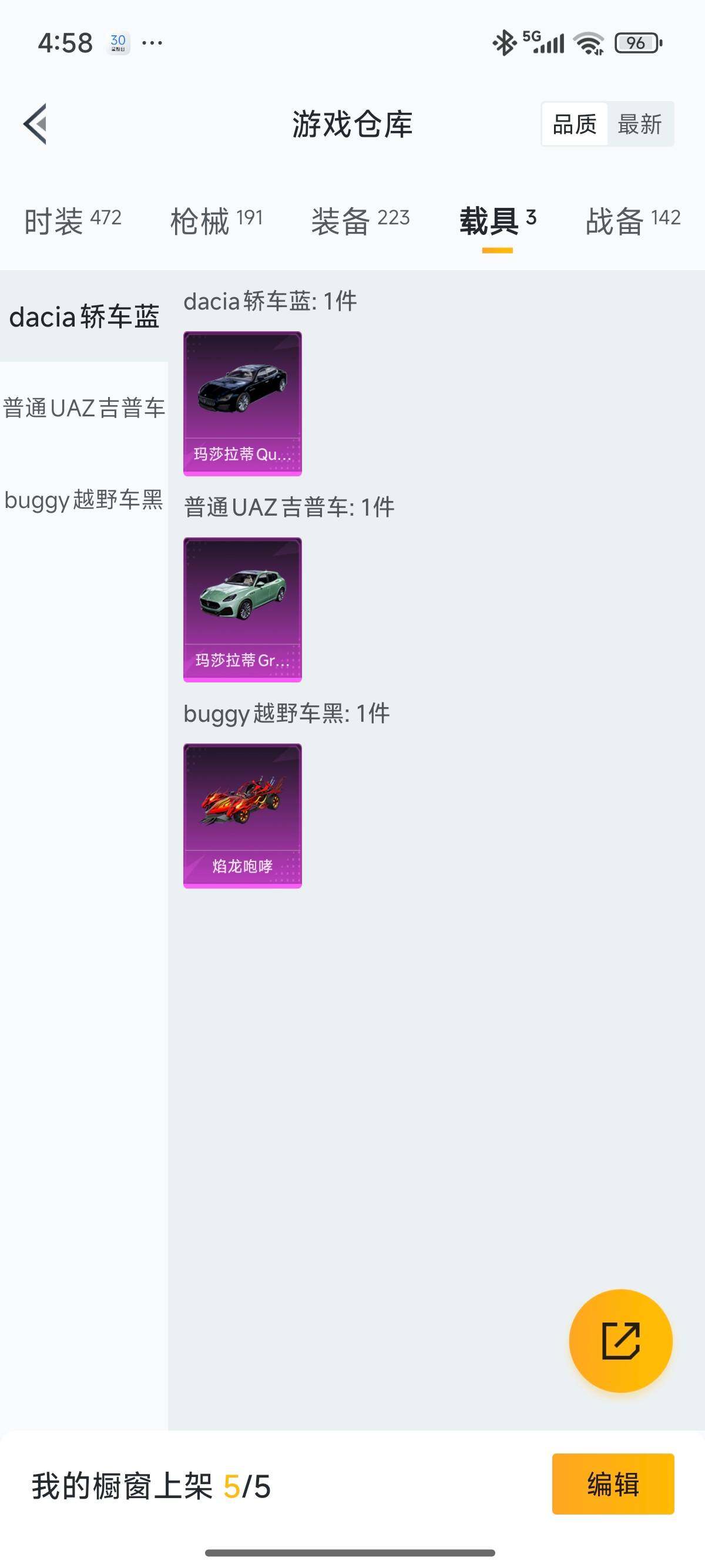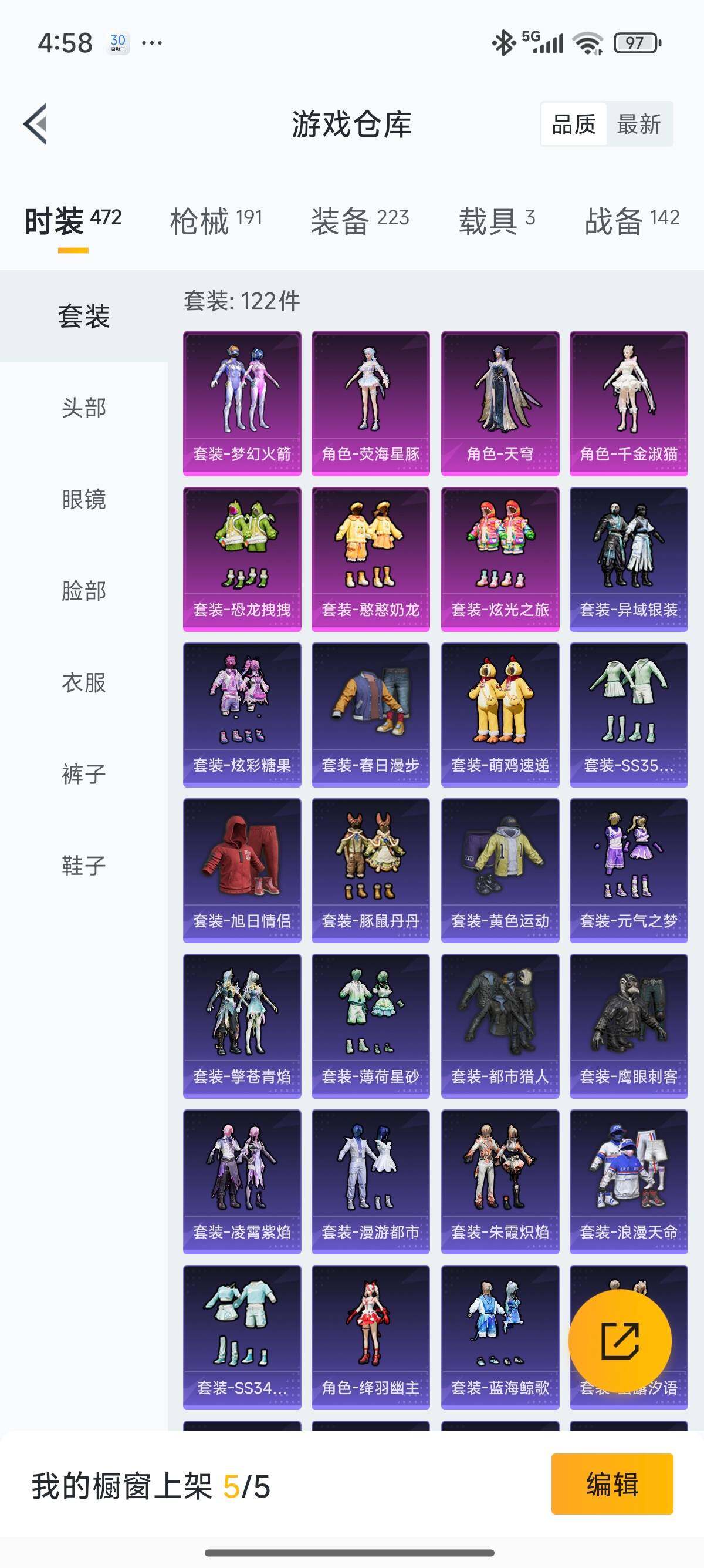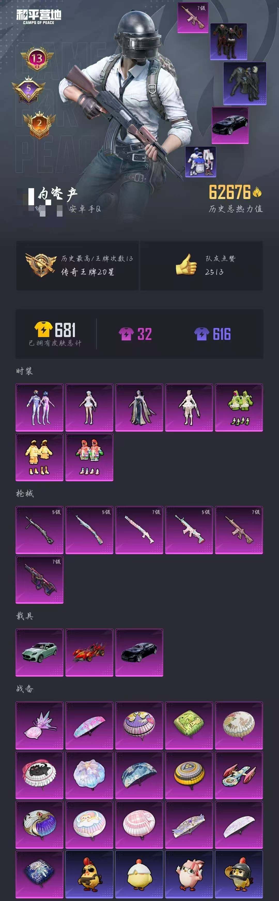 3载具-472套装-191呛皮-实名: 可修改 时装数: 122 载具数: 3 呛械数: 191 战备数: 142 热门装扮: 恐龙拽拽炫光之旅憨憨奶龙千金淑猫天穹荧海星豚 载具: 焰龙咆哮玛莎拉蒂grecale薄荷绿玛莎拉蒂quattropte夜幕蓝 稀有呛皮: scar-l-锦绣绵绵五级,m416