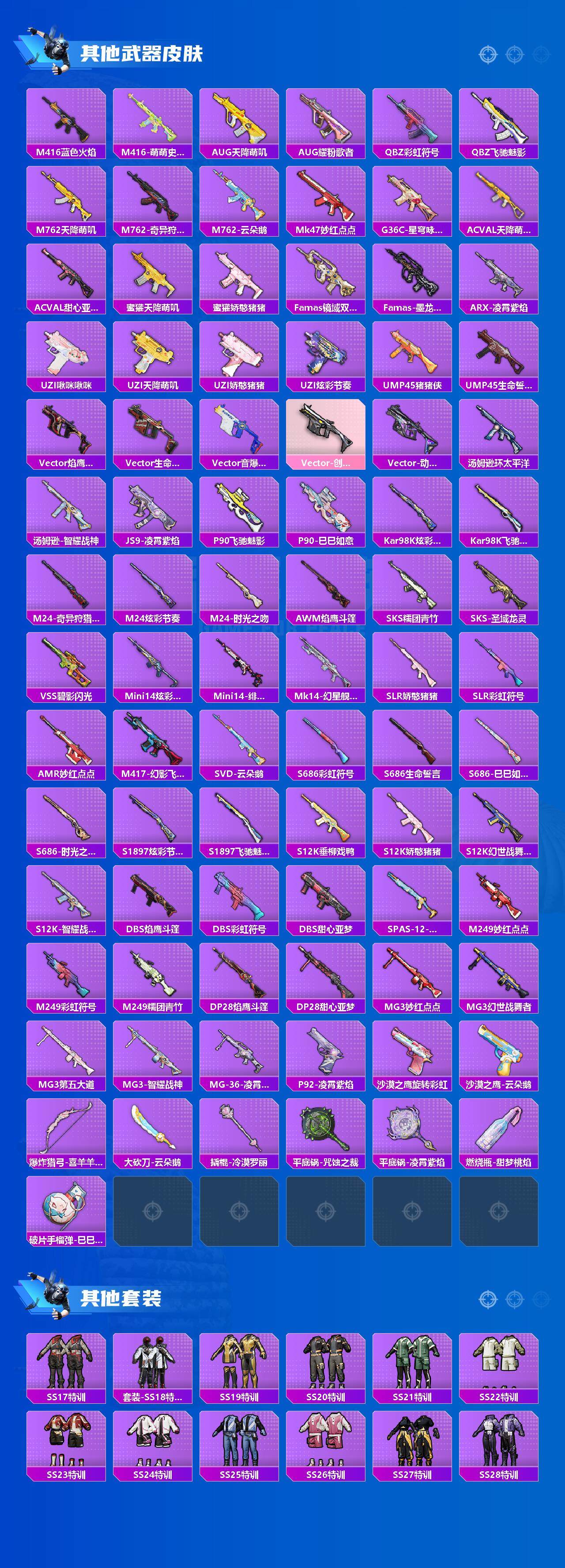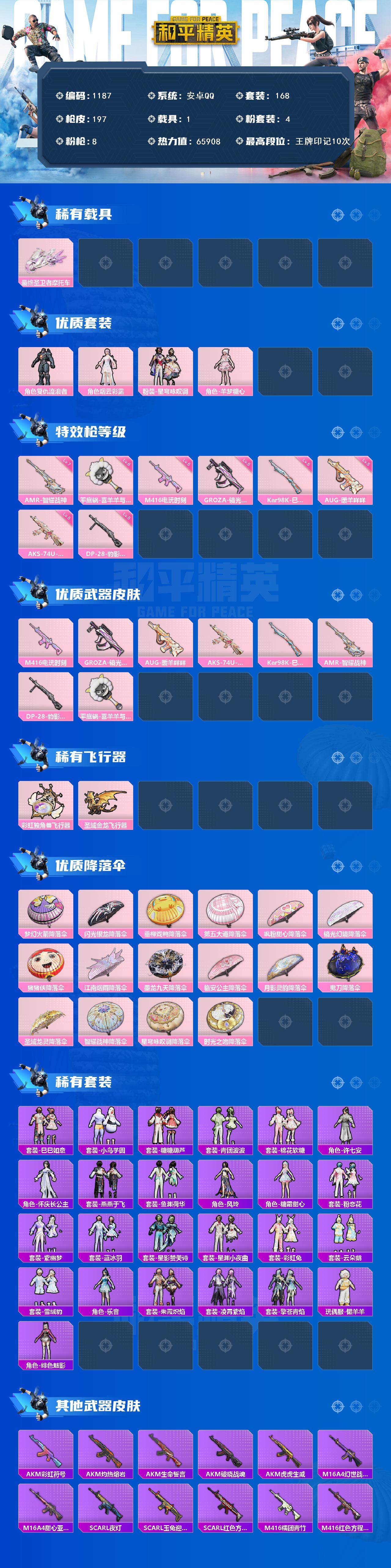 1载具-168套装-197呛皮-168套装/呛械8/装备286/载具1/战备147/王牌印记10/热力值65908/五级m416-电玩时刻/五级groza-镜光银凌/五级aug-暖羊咩咩/五级aks-74u-星穹咏叹调/五级kar98k-巳巳如意/七级amr-智耀战神/五级dp-28-豹影疾电/六级平底锅-喜羊羊与灰太狼/奇异狩猎者/套装-龟仙人/最终圣卫者摩托车/复仇流浪者/烟云彩露/粉装-星穹咏叹调/角色-羊梦糖心/m4