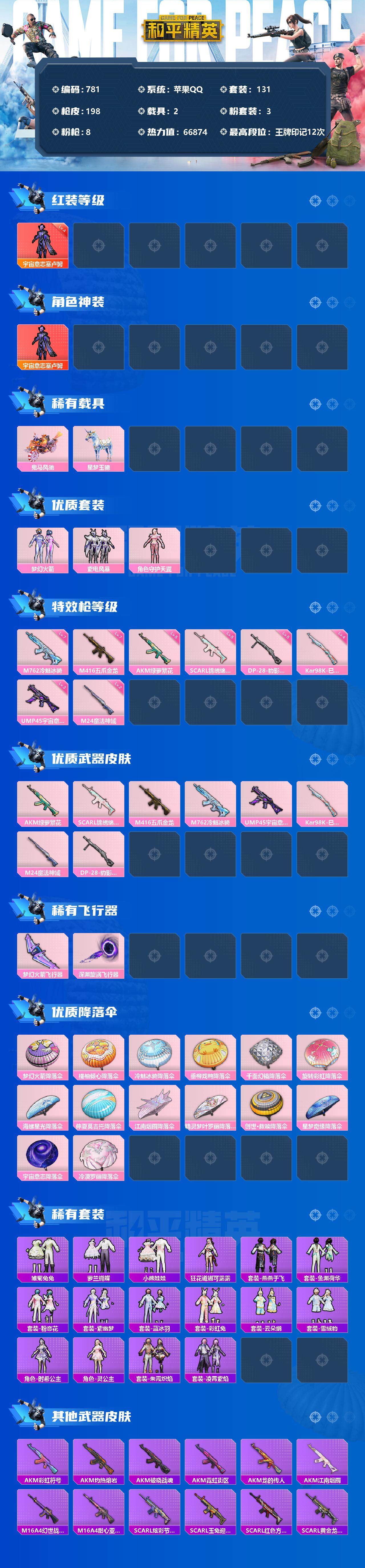 2载具-131套装-198呛皮-df苹果 【4级红,稀有特价,可议价】手q-1神装-3粉装-8特效呛-2载具-2粉色飞行器-66874热力值-12王牌印记-131套装-198呛皮 【红色神装等级】:宇宙意志-塞卢姆四级 【红色角色神装】:宇宙意志-塞卢姆 【热门品类】:粉装-梦幻火箭,套装-龟仙人,套装-粉红小猪,角色-mark.06 【粉色载具】:鬼马风驰,星梦玉骢 【粉色套装】:粉装-梦幻火箭,粉装-紫电风暴,角色-