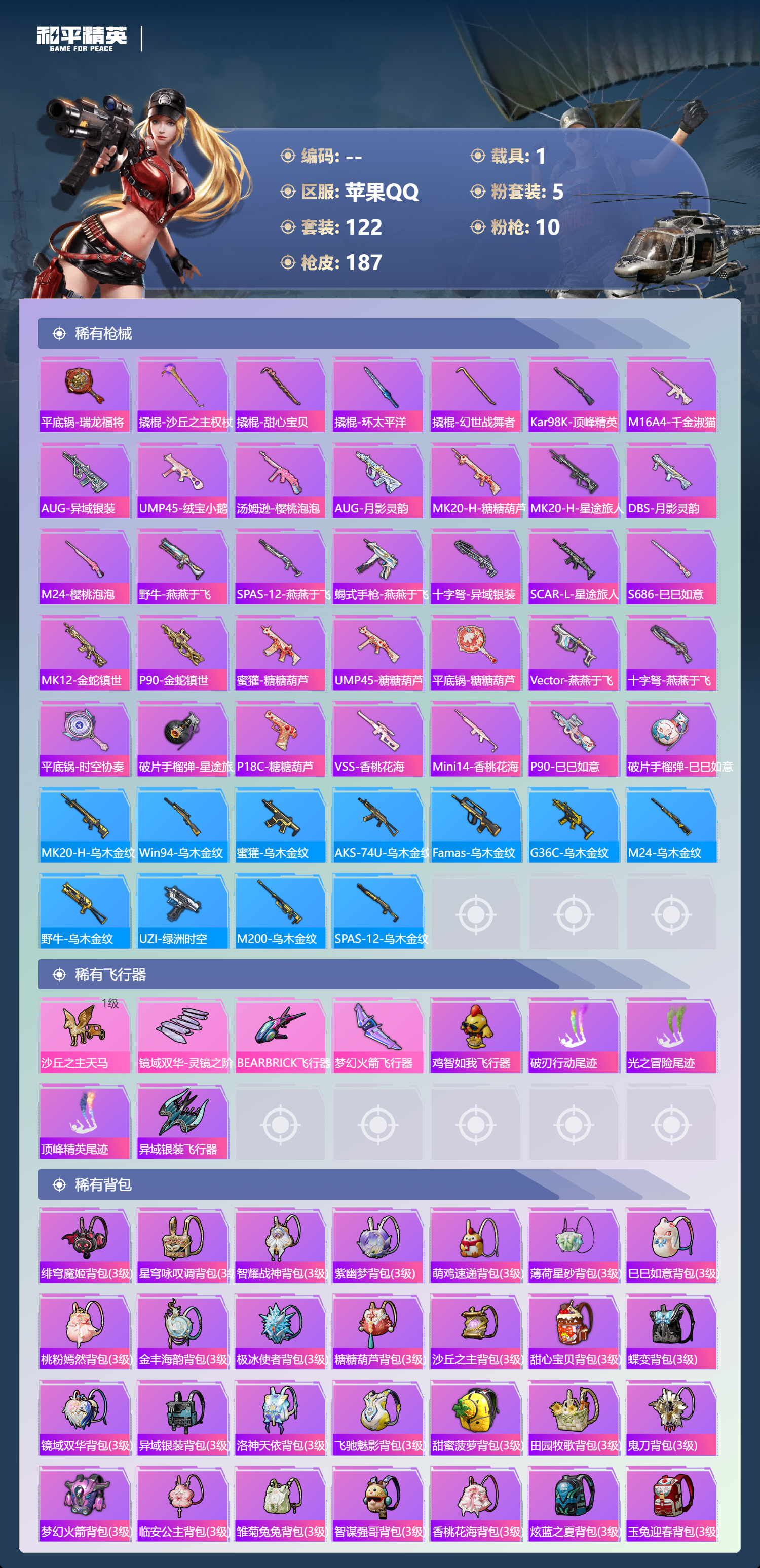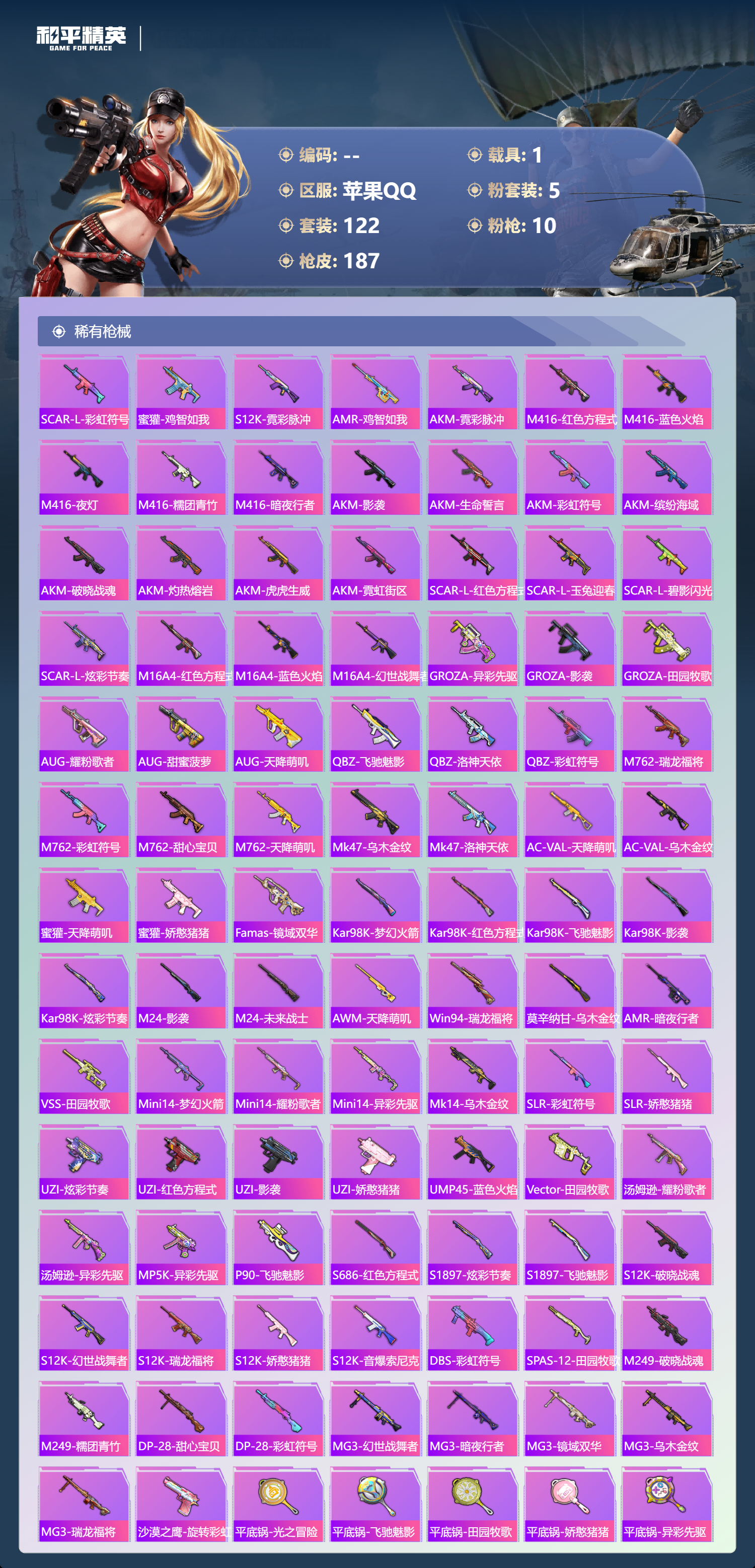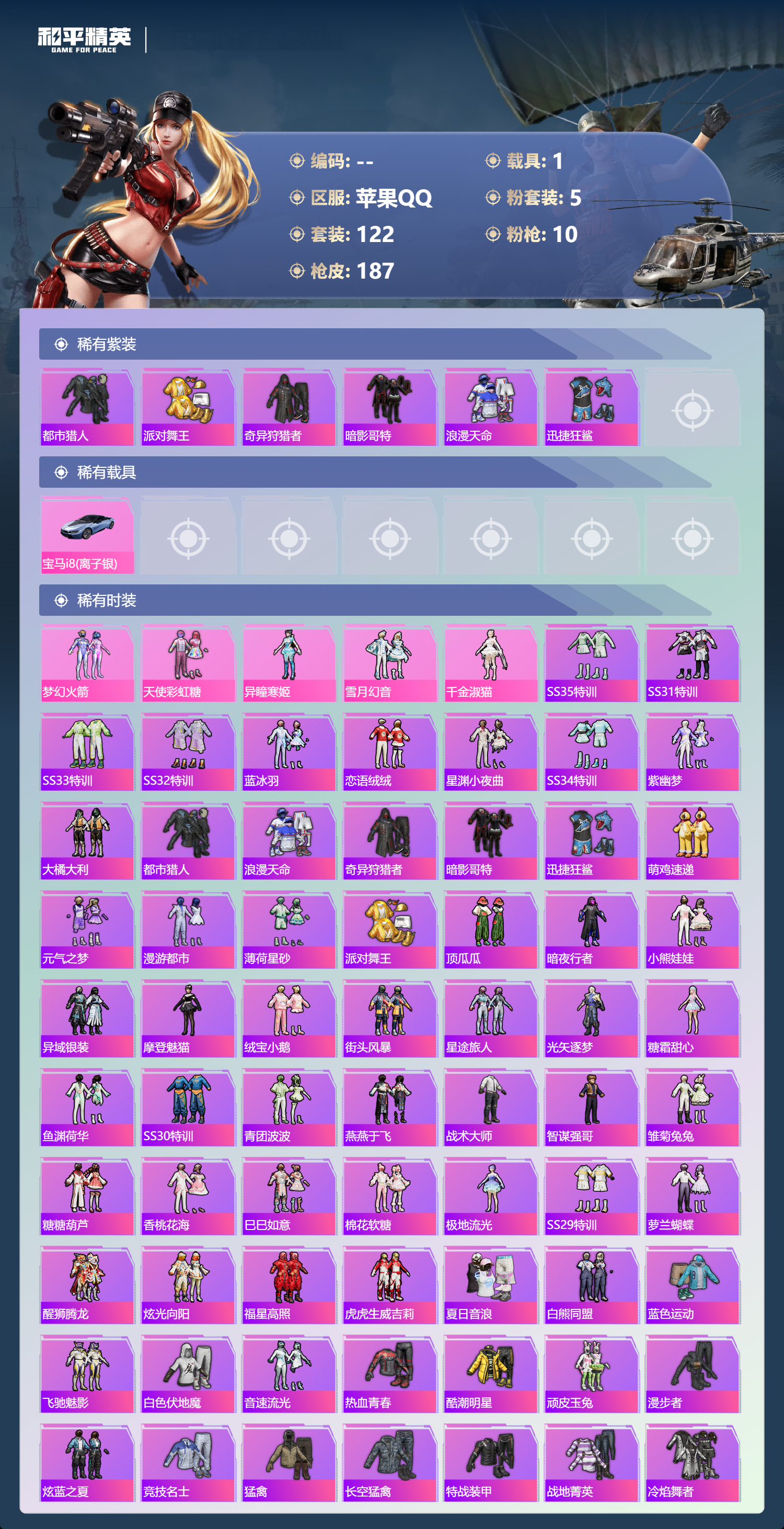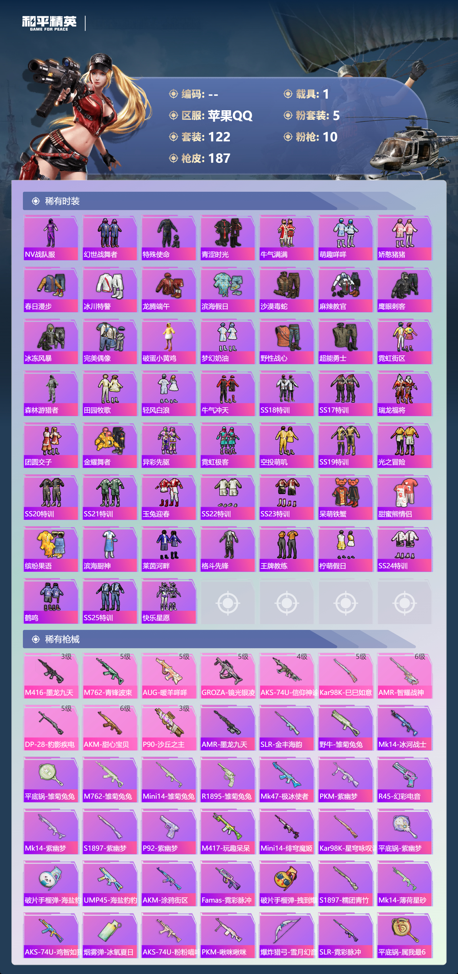 1载具-122套装-187呛皮【火箭10特效带载具都市哥特金鞋】苹果手q-11王牌印记-5粉装-10特效呛-1载具-58748热力值-122套装-187呛皮-5卓越印记-4传奇印记【5粉装】角色-千金淑猫角色-异瞳寒姬套装-天使彩虹糖套装-梦幻火箭套装-雪月幻音【10特效呛】kar98k-巳巳如意/5级groza-镜光银凌/5级aks-74u-信仰神谕/4级m762-青锋波束