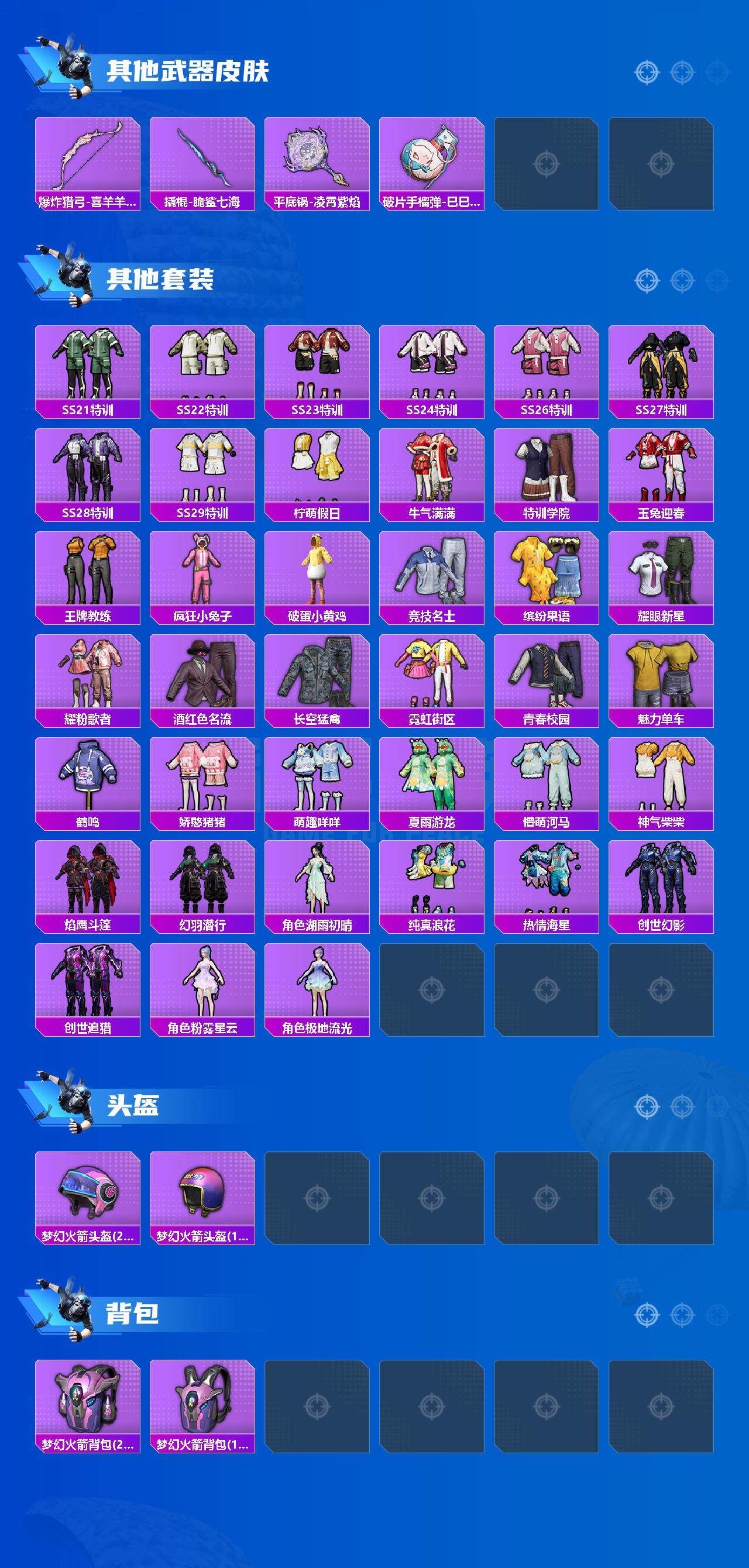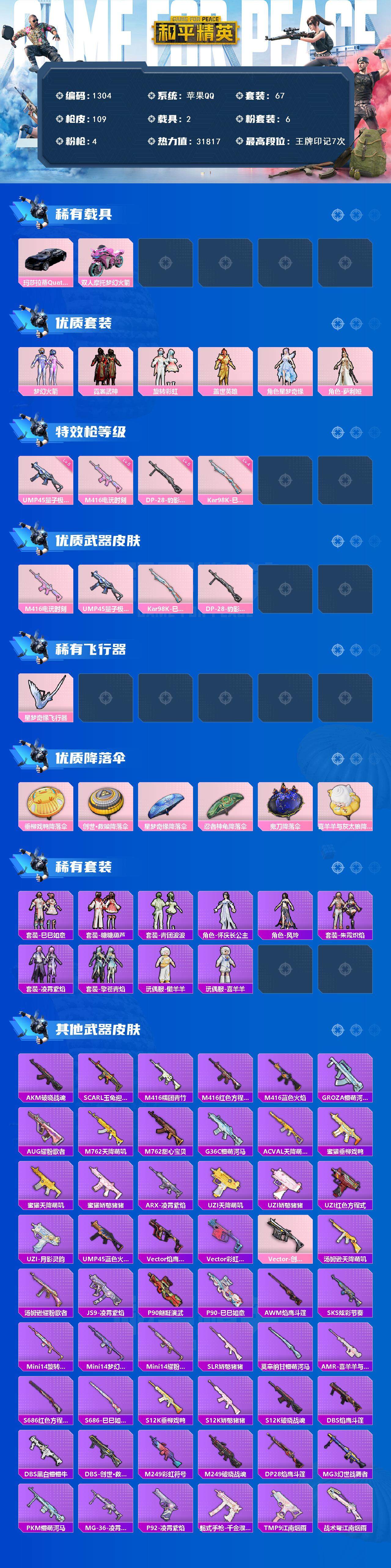 2载具-67套装-109呛皮-67套装/呛械4/装备127/载具2/战备57/王牌印记7/热力值31817/五级m416-电玩时刻/五级ump45-量子极限/四级kar98k-巳巳如意/五级dp-28-豹影疾电/粉装-梦幻火箭/玛莎拉蒂quattropte夜幕蓝/双人摩托-梦幻火箭/梦幻火箭/霓裳武神/旋转彩虹/盖世英雄/星梦奇缘/萨利娅/m416-电玩时刻/ump45-量子极限/kar98k-巳巳如意/dp-28