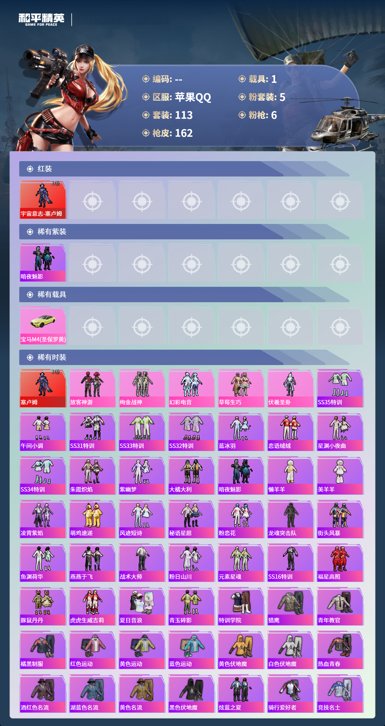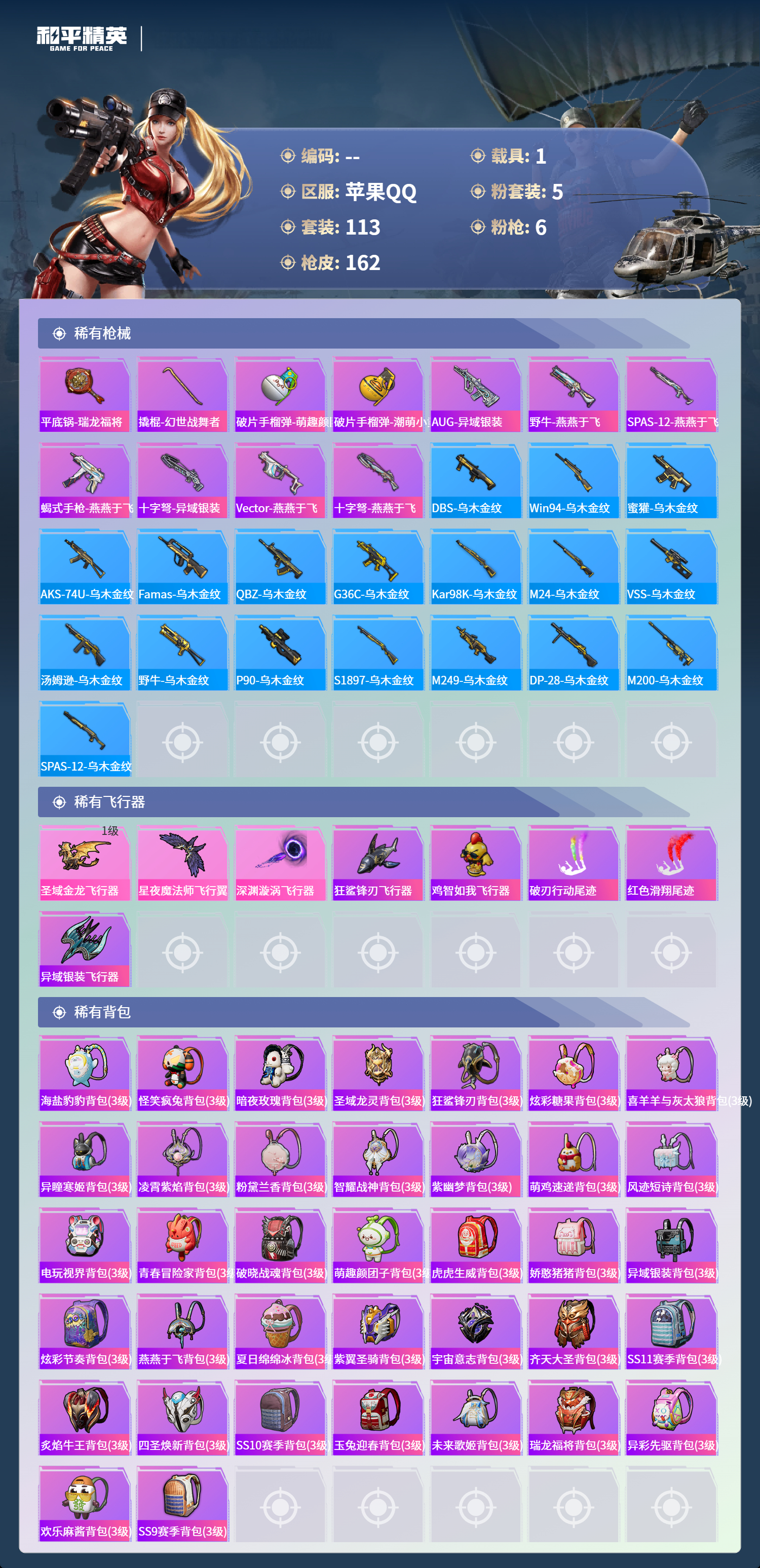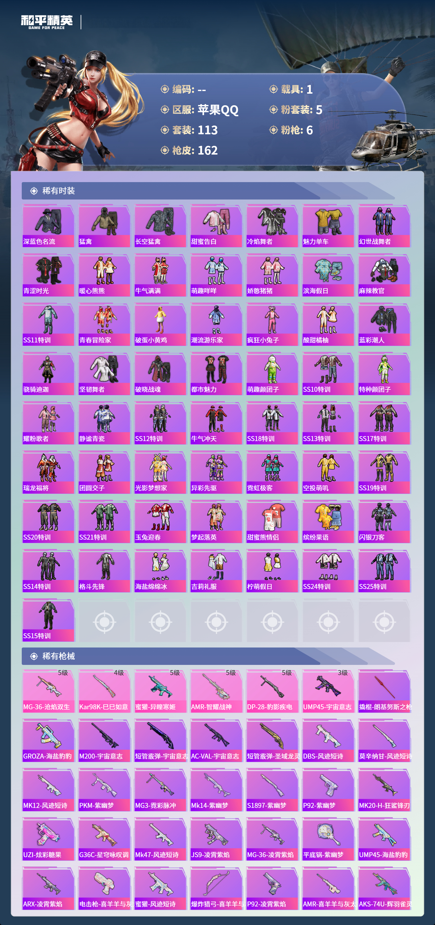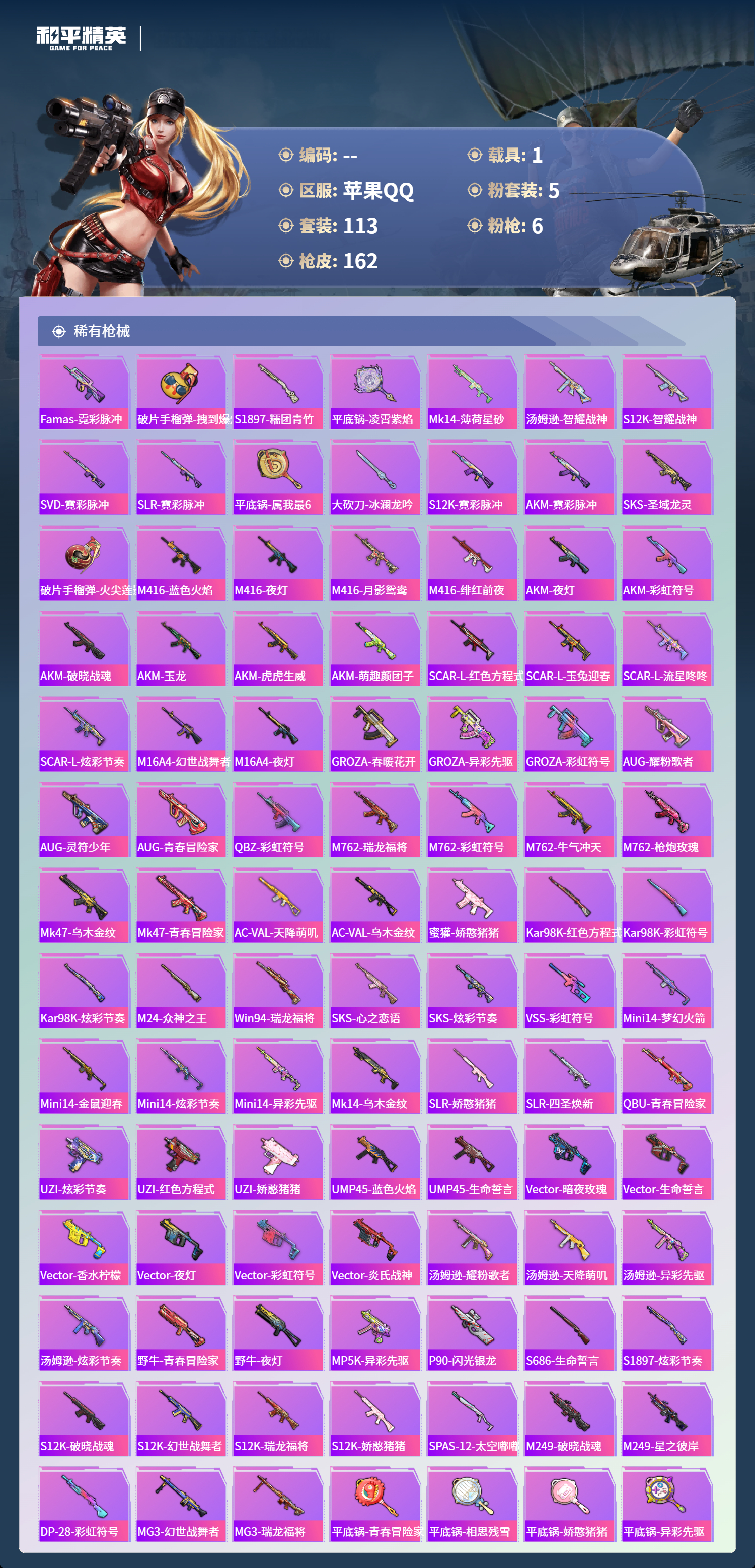 1载具-113套装-162呛皮-苹果手q-10王牌印记-1红装-5粉装-6特效呛-1载具-54937热力值-113套装-162呛皮【1红装】宇宙意志-塞卢姆/3级【5粉装】角色-伏羲圣卦套装-幻彩电音套装-草莓生巧套装-放客神游套装-绚金战神【6特效呛】kar98k-巳巳如意/4级dp-28-豹影疾电/5级蜜獾-异瞳寒姬/5级amr-智耀战神/5级mg-36-沧焰双生/5级ump45-宇宙意志/3级【1红装】宇