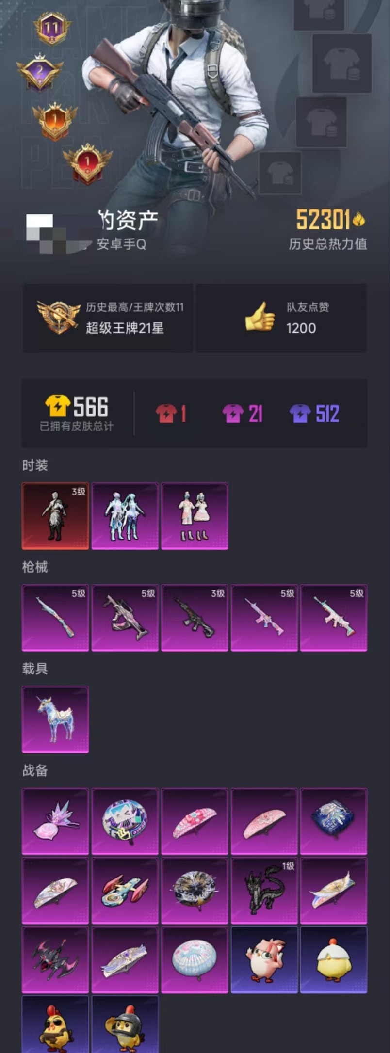 1载具-115套装-157呛皮-【3级敖渊 2粉装5特效呛1载具 可秒换绑】 安卓q区-52301热力值-11印记-115套装-157呛皮 【1红装】 墨龙九天-敖渊3级【1载具】 星梦玉骢【2粉装】 蜜语绒猫 幻彩电音【5特效呛】 scar-l-锦绣绵绵5级 m416-电玩时刻5级 m416-墨龙九天3级 groza-镜光银凌5级 kar98k-巳巳如意5级【29热门】 m416-蓝