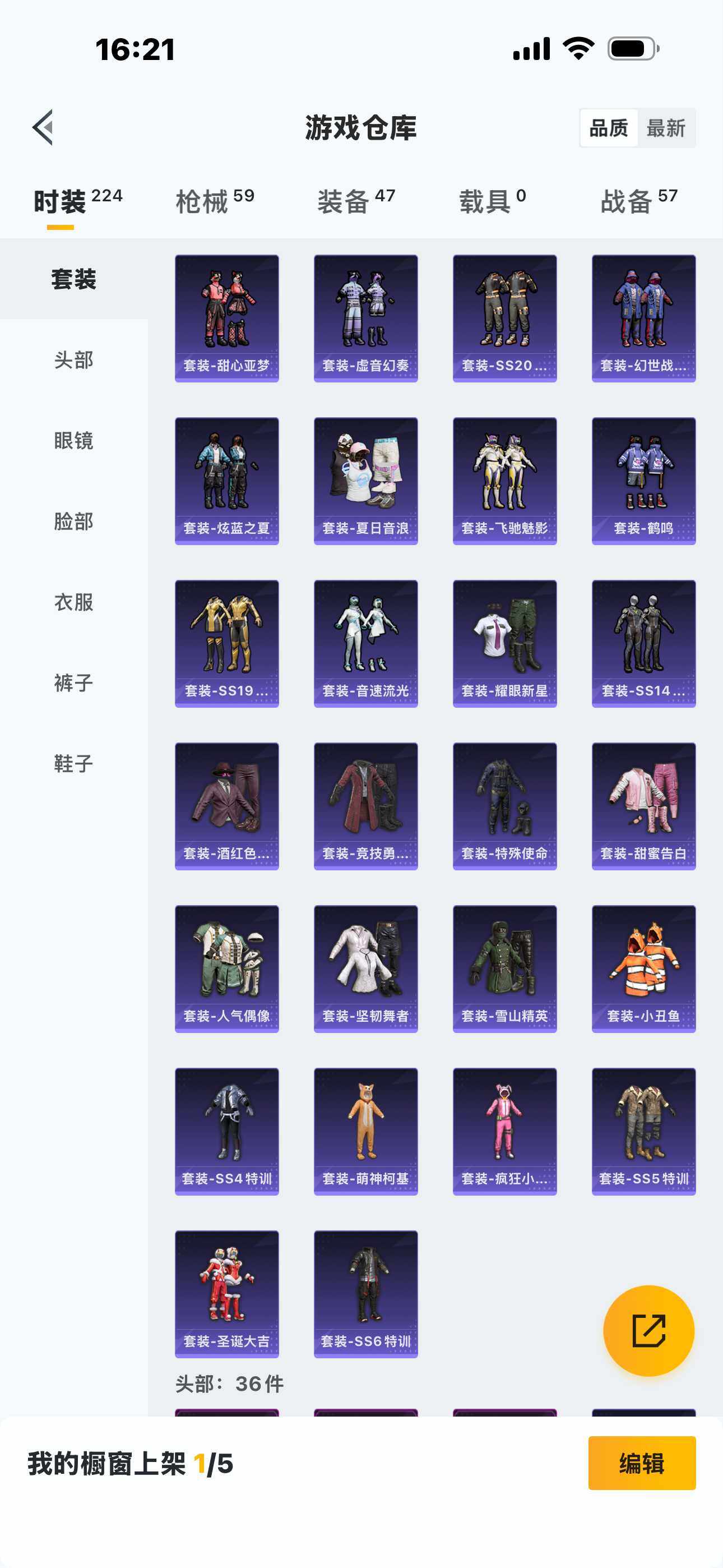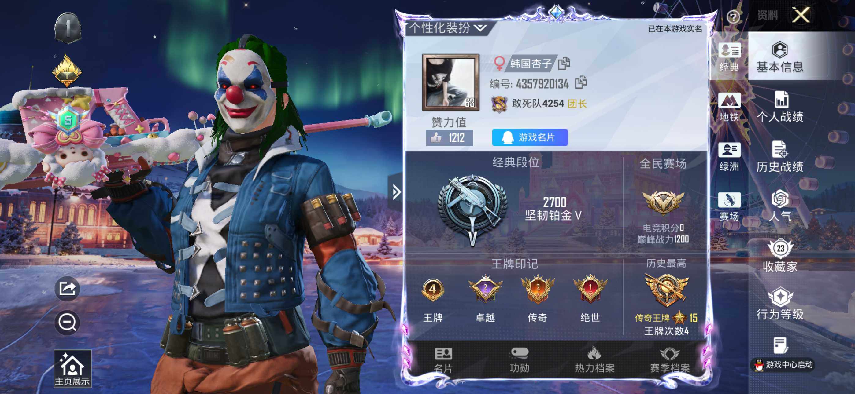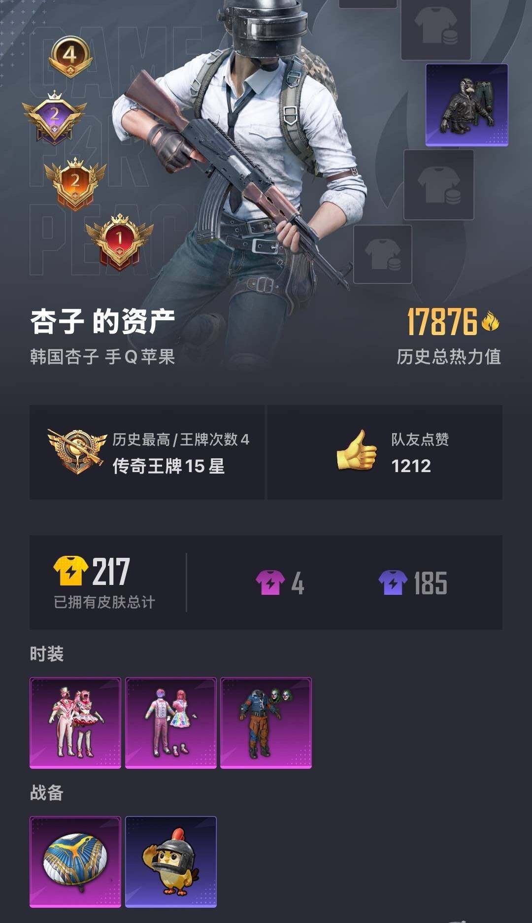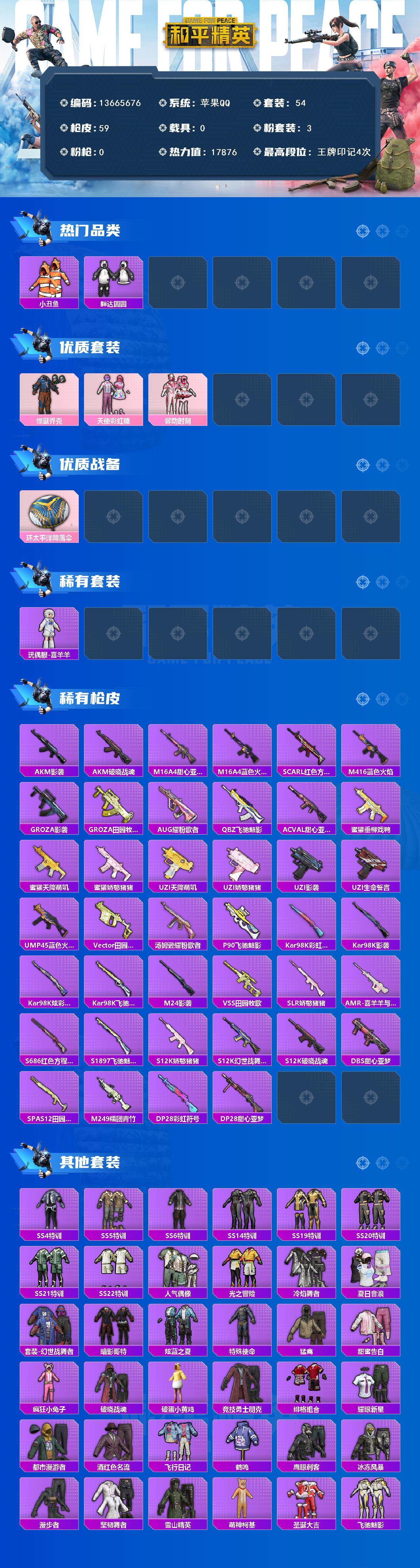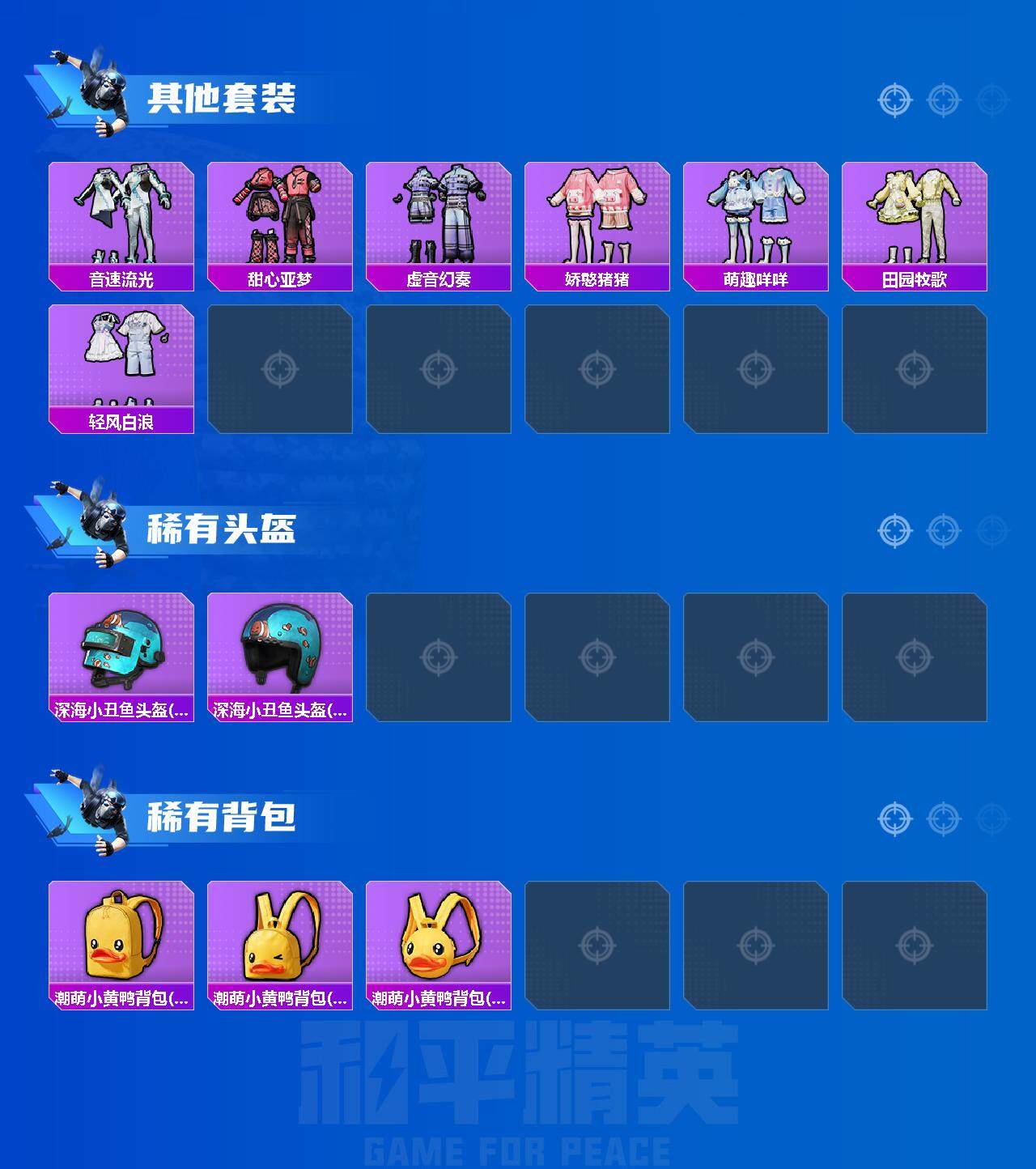 6099-3粉装-0特效呛-0载具-0粉色飞行器-17876热力值-4王牌印记-54套装-59呛皮 【热门品类】:粉装-怪诞乔克,套装-小丑鱼,套装-胖达圆圆,套装-暗影哥特 【粉色套装】:粉装-怪诞乔克,粉装-天使彩虹糖,粉装-馨动时刻 【粉色降落伞】:环太平洋降落伞 【稀有套装】:玩偶服-喜羊羊 【稀有呛皮】:akm-影袭,akm-破晓战魂,m16a4-甜心亚梦,m16a4-蓝色火焰,