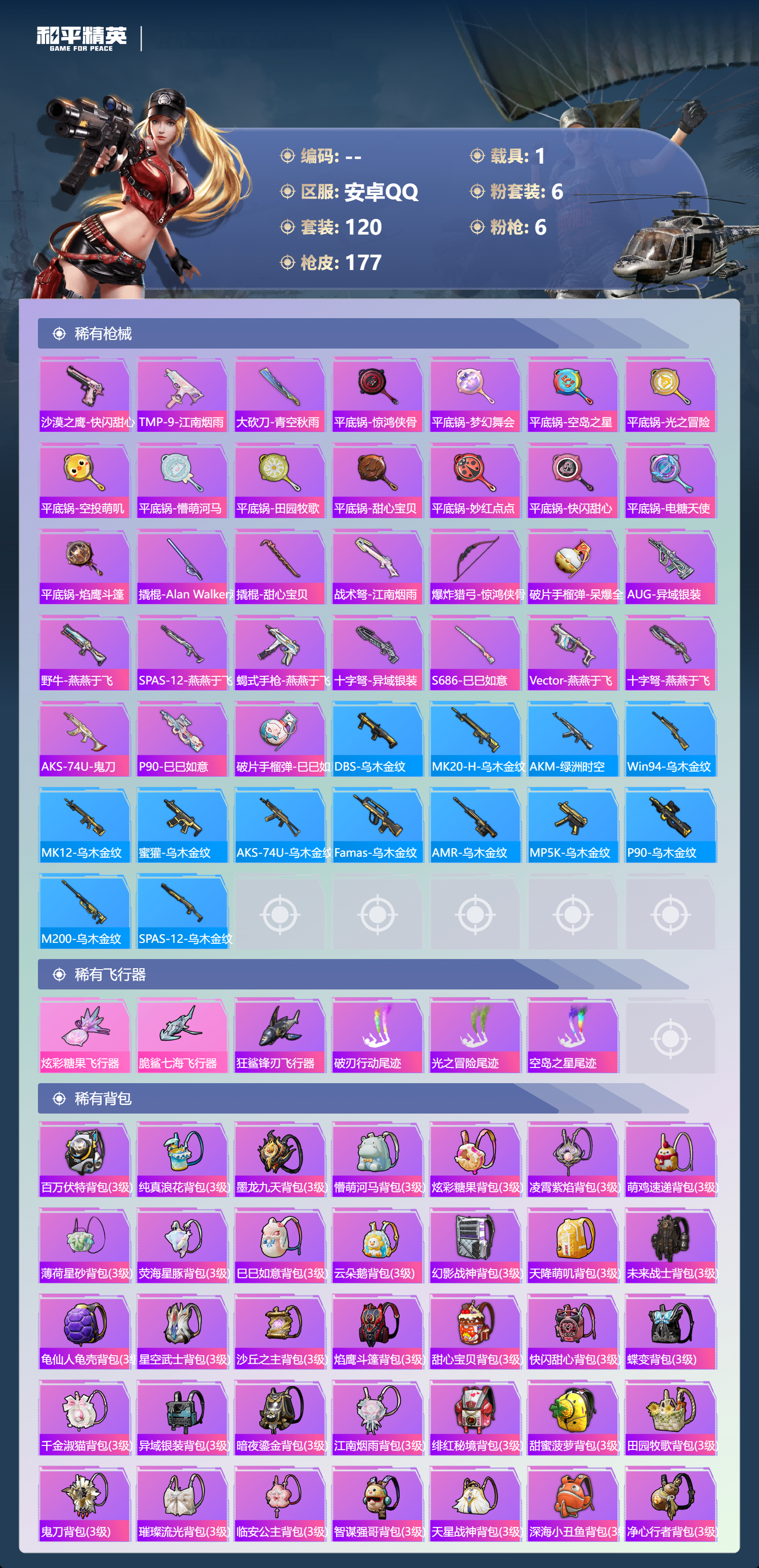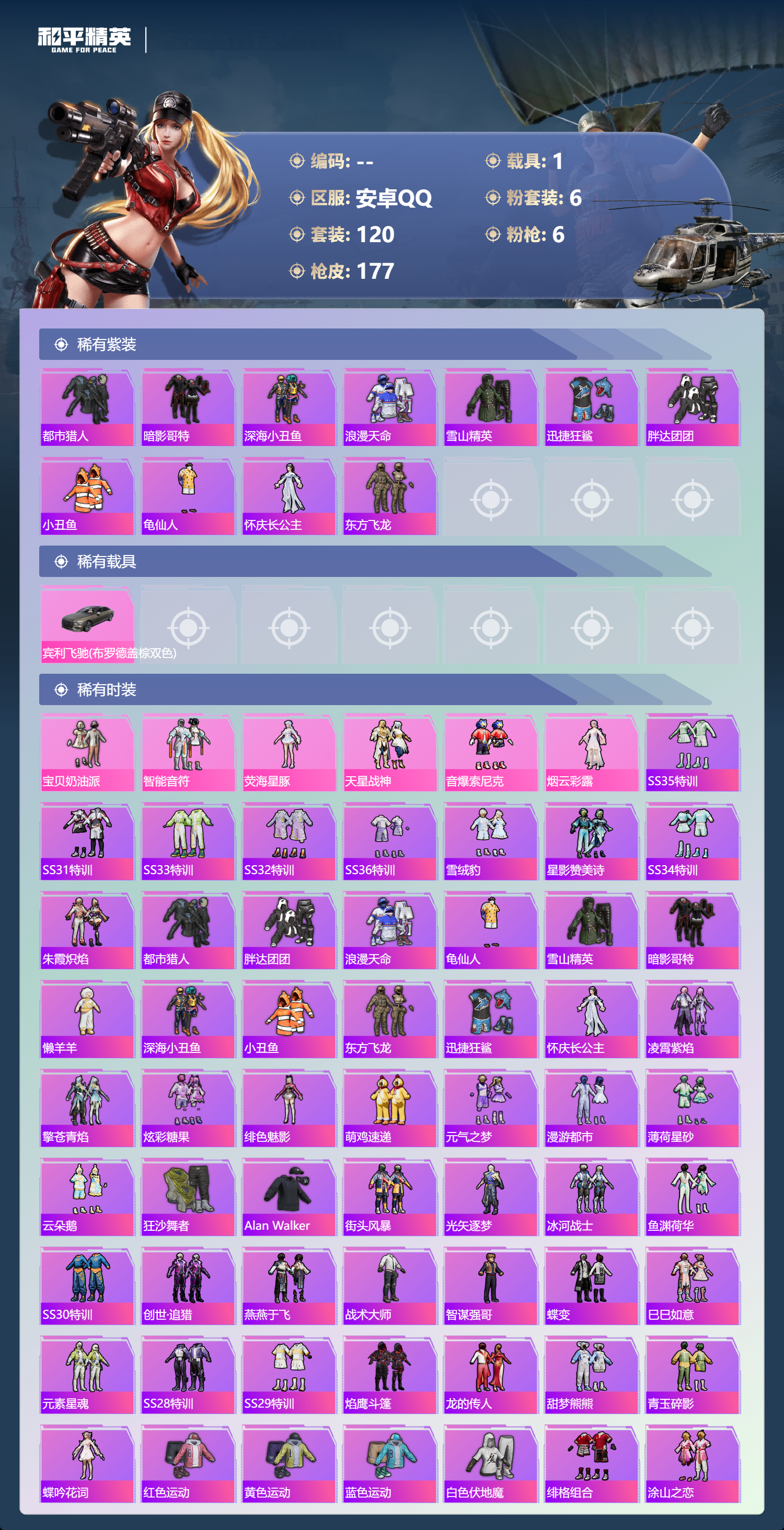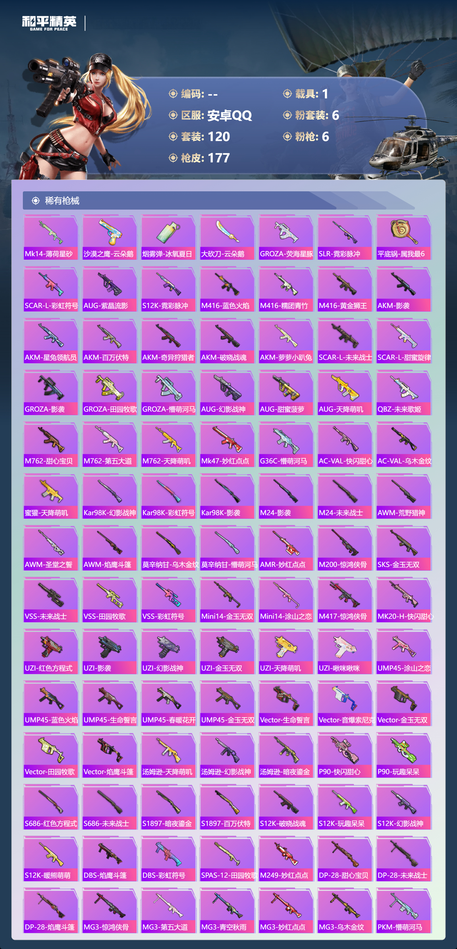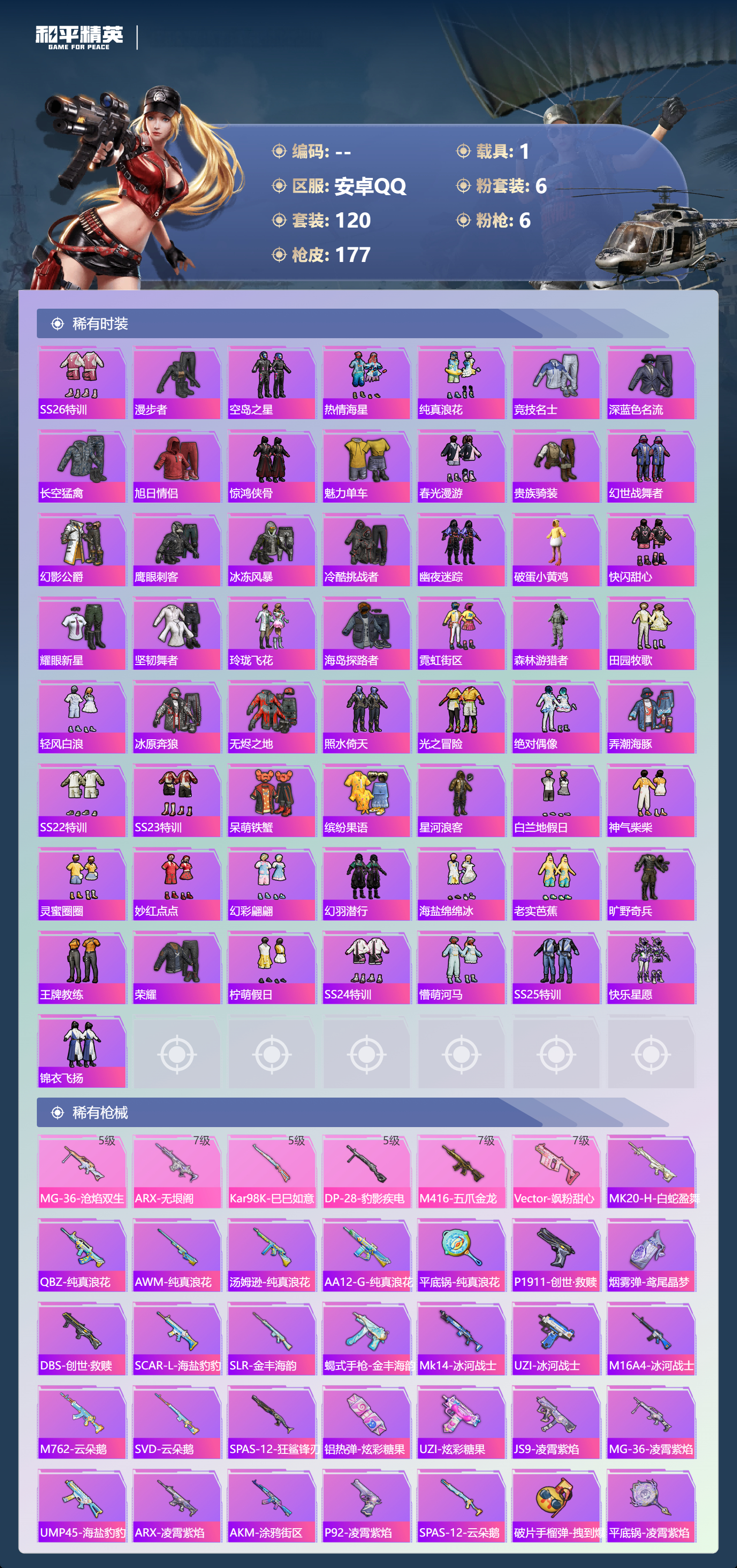 1载具-120套装-177呛皮-安卓手q-11王牌印记-6粉装-6特效呛-1载具-58545热力值-120套装-177呛皮-3卓越印记-1传奇印记【6粉装】套装-天星战神套装-宝贝奶油派套装-音爆索尼克角色-烟云彩露角色-荧海星豚套装-智能音符【6特效呛】arx-无垠阁/7级dp-28-豹影疾电/5级kar98k-巳巳如意/5级vect-飒粉甜心/7级mg-36-沧焰双生/5级m416-五爪金龙/7级【1