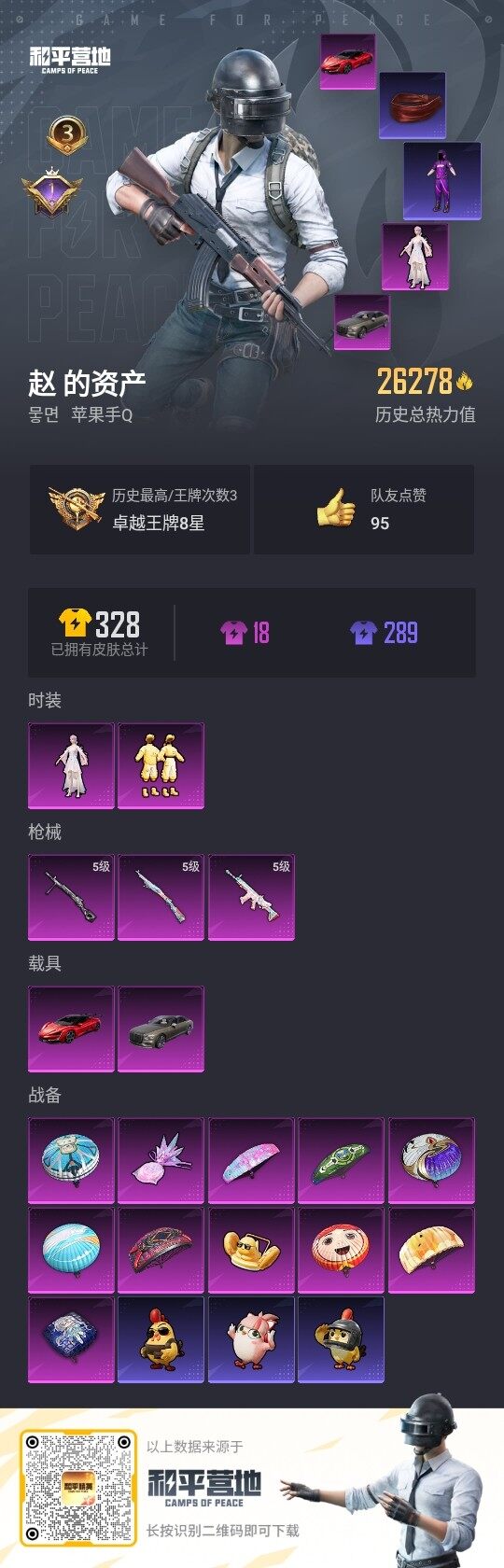 [14503879]苹果 手q-2粉装-3特效呛-2载具-2粉色飞行器-26278热力值-3王牌印记-56套装-67呛皮 【热门品类】:套装-浪漫天命,套装-龟仙人,套装-暗影哥特 【粉色载具】:宾利飞驰(布罗德盖棕双色),仰望u9(赤霞丹朱) 【粉色套装】:粉装-暖暖奶龙,角色-烟云彩露 【粉色呛皮等级】:scar-l-锦绣绵绵五级,kar98k-巳巳如意五级,dp-28-豹影疾电五级 【粉色呛皮】:scar-l-锦绣绵绵,kar98k-巳巳如意,dp-28-豹影疾电 【粉色飞行器】:萌酷奶龙飞行器 【粉色降落伞】:星之彼岸降落伞,洛神天依降落伞,仲夏莫吉托降落伞,萌酷奶龙降落伞,猪猪侠降落伞,星空武士降落伞,忍者神龟降落伞,异瞳寒姬降落伞 【稀有套装】:套装-龟仙人,套装-巳巳如意,角色-摩登魅猫,套装-极速光影,角色-绯色魅影,套装-炫彩糖果 【稀有呛皮】:m416-红色方程式,groza-影袭,aug-耀粉歌者,g36c-镜域双华,蜜獾-天降萌叽,famas-镜域双华,uzi-天降萌叽,ump45-夜灯,vect-焰鹰斗篷,汤姆逊-炫彩节奏,aks-74u-鬼刀,kar98k-彩虹符号,awm-焰鹰斗篷,m200-酷泡奶龙,s12k-智耀战神,dbs-焰鹰斗篷,m249-彩虹符号,dp-28-焰鹰斗篷,mg3-镜域双华,tmp-9-江南烟雨 【其他套装】:套装-nv战队服,套装-ss27特训,套装-ss28特训,套装-ss29特训,套装-暗影哥特,套装-森林游猎者,套装-浪漫天命,套装-海岛探路者,套装-湖蓝色名流,套装-特殊使命,套装-猛禽,套装-王牌教练,套装-白色伏地魔,套装-破蛋小黄鸡,套装-缤纷果语,套装-都市魅力,套装-魅力单车,套装-黄色名流,套装-黄色运动,套装-黑色伏地魔,套装-龟仙人,套装-梦之呓语,套装-童真绒兔,套装-焰鹰斗篷,套装-幽夜迷踪,套装-幻羽潜行,角色-蝶吟花词,角色-银尘,套装-纯真浪花,套装-热情海星,套装-曼妙人鱼 【稀有头盔】:梦幻火箭头盔1级,深海小丑鱼头盔1级 【稀有背包】:深海小丑鱼背包3级 【营地id】:967284651