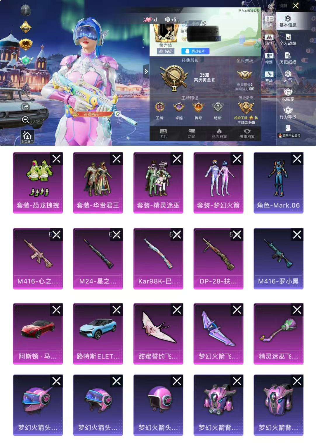 2载具-153套装-181呛皮-hm6248苹果q区-4粉装-4特效呛-2载具3飞行器-62962热力值-10王牌印记-153套装-181呛皮-可二次【优质套装】: 梦幻火箭 恐龙拽拽 精灵迷巫 华贵君王 潮萌小黄鸭 浪漫波比 mark.06新蓝螳螂 【优质载具皮肤】 阿斯顿·马丁dbs红 路特斯eletre冰川蓝【特效呛等级】:m416-心之恋语五级m416-心之恋语kar98k-巳巳如
