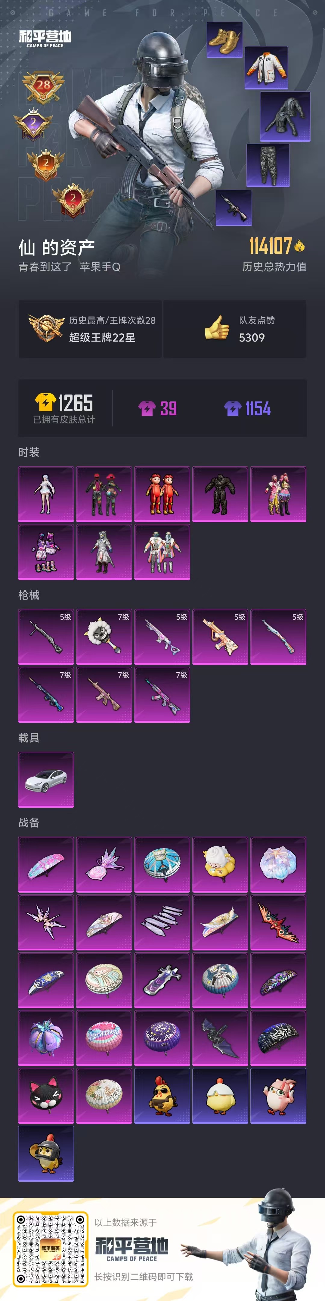 1载具-939套装-345呛皮-精氪素材号-11w热力值-28印记-都市-寒蝎-金鞋-巡查衣-星际m4-放克神游-胖达头盔-猫包-猪妹-浪漫天命 实名: 可修改 时装数: 939 载具数: 1 呛械数: 345 战备数: 249 热门装扮: 奇异狩猎者深海小丑鱼放客神游迅捷狂鲨鹰眼刺客缤纷油彩幻彩马卡龙都市猎人银刃