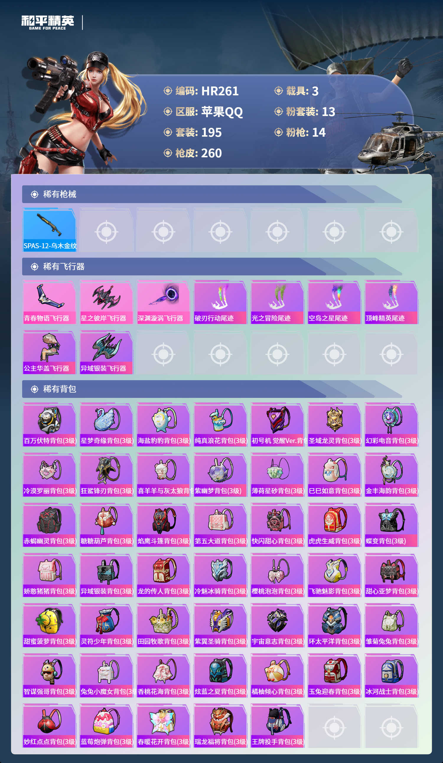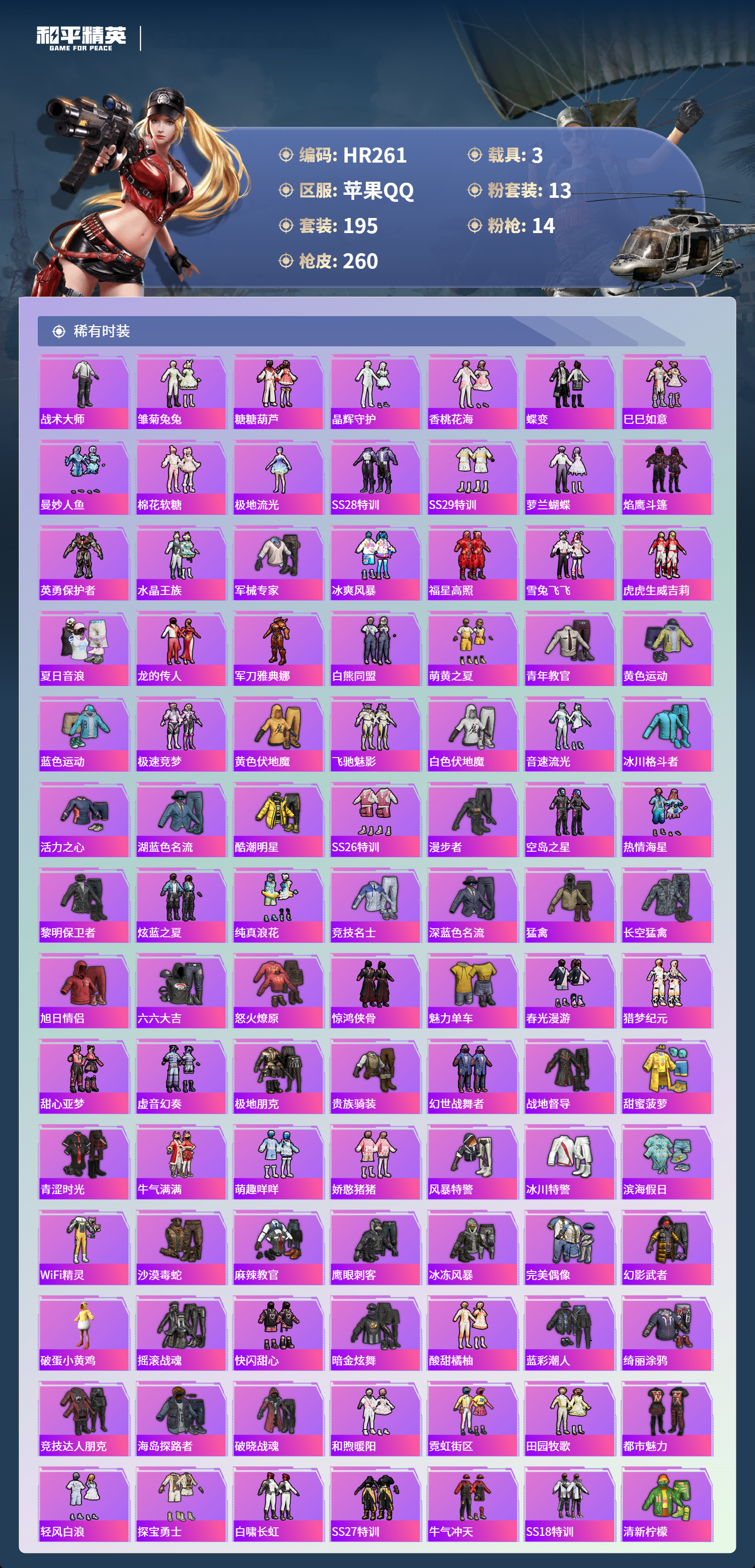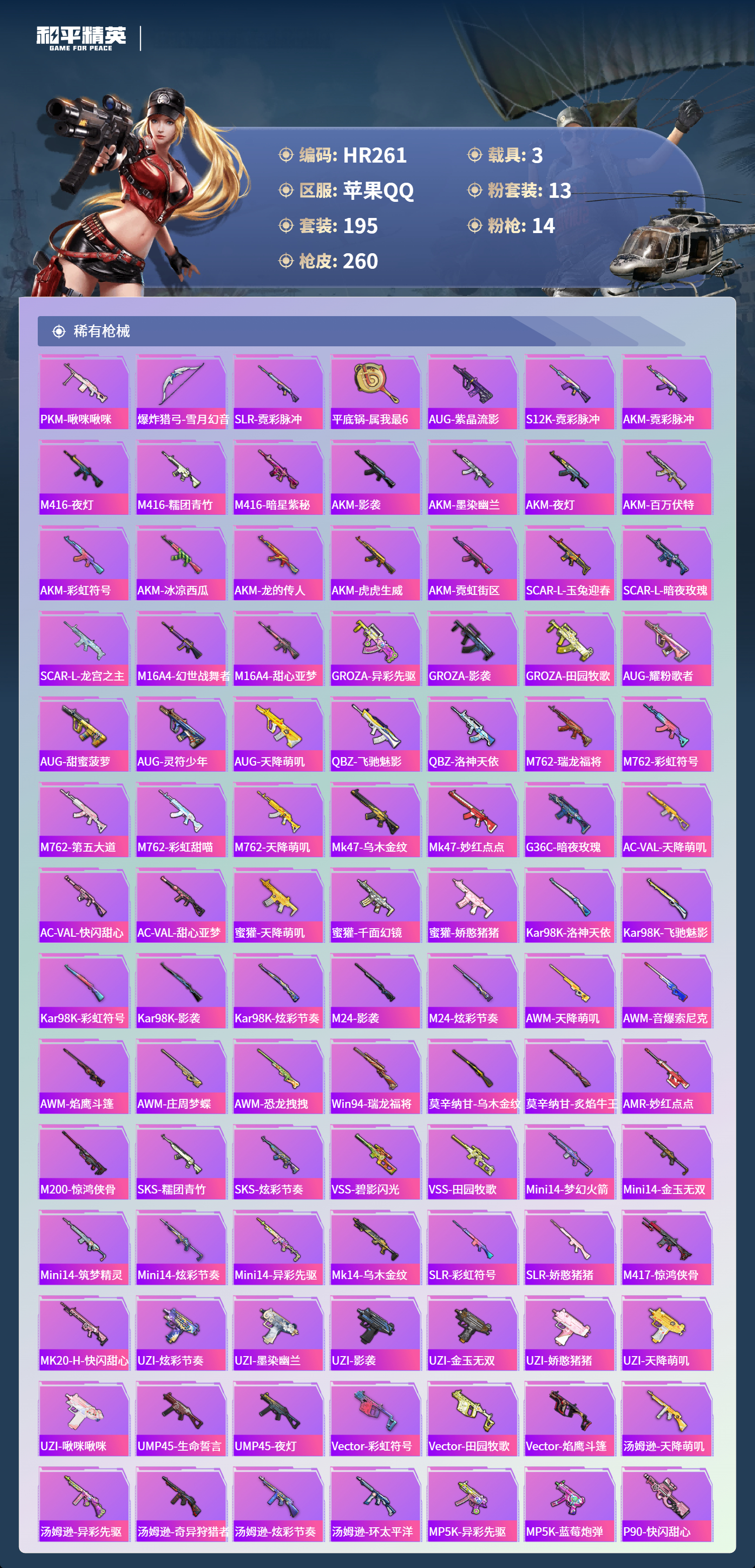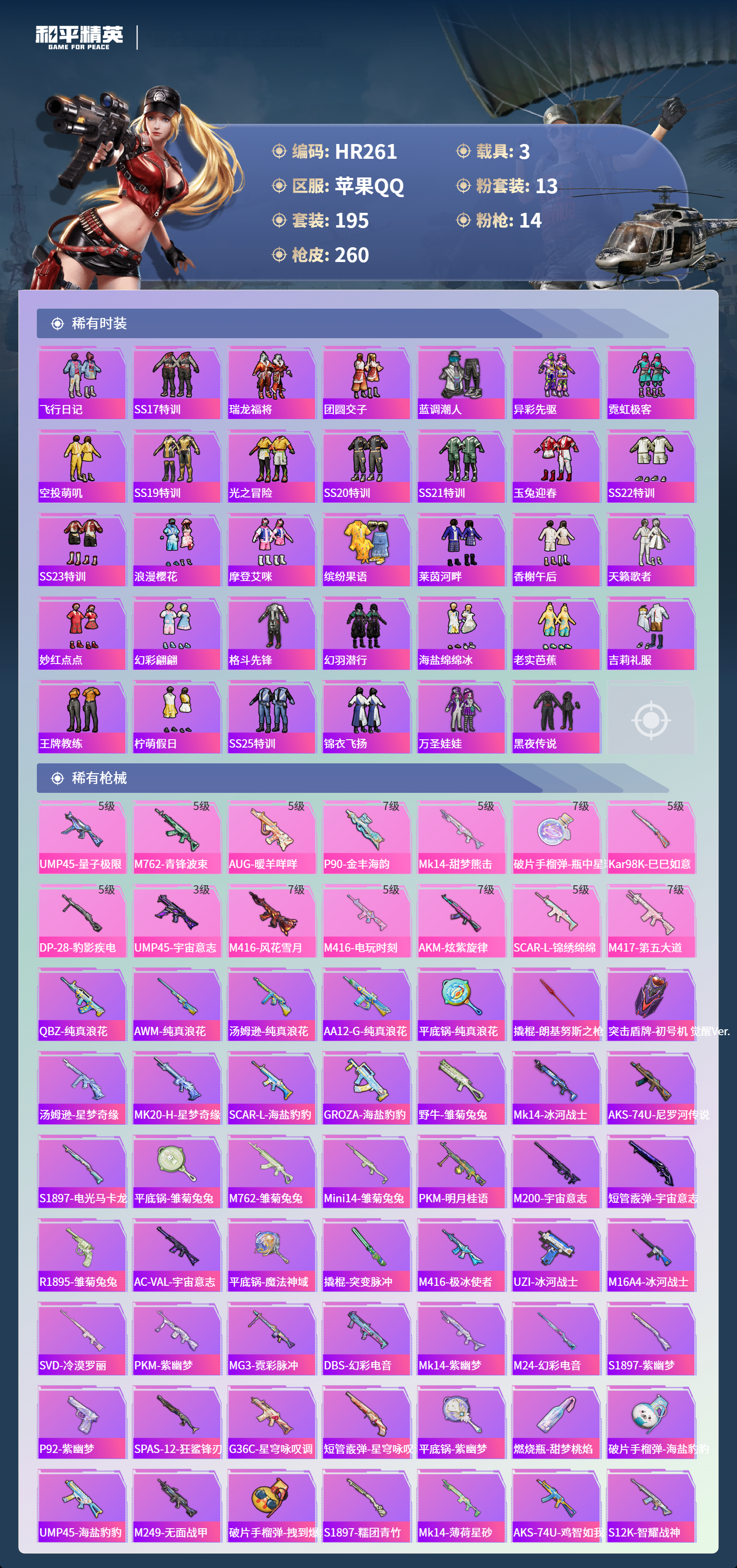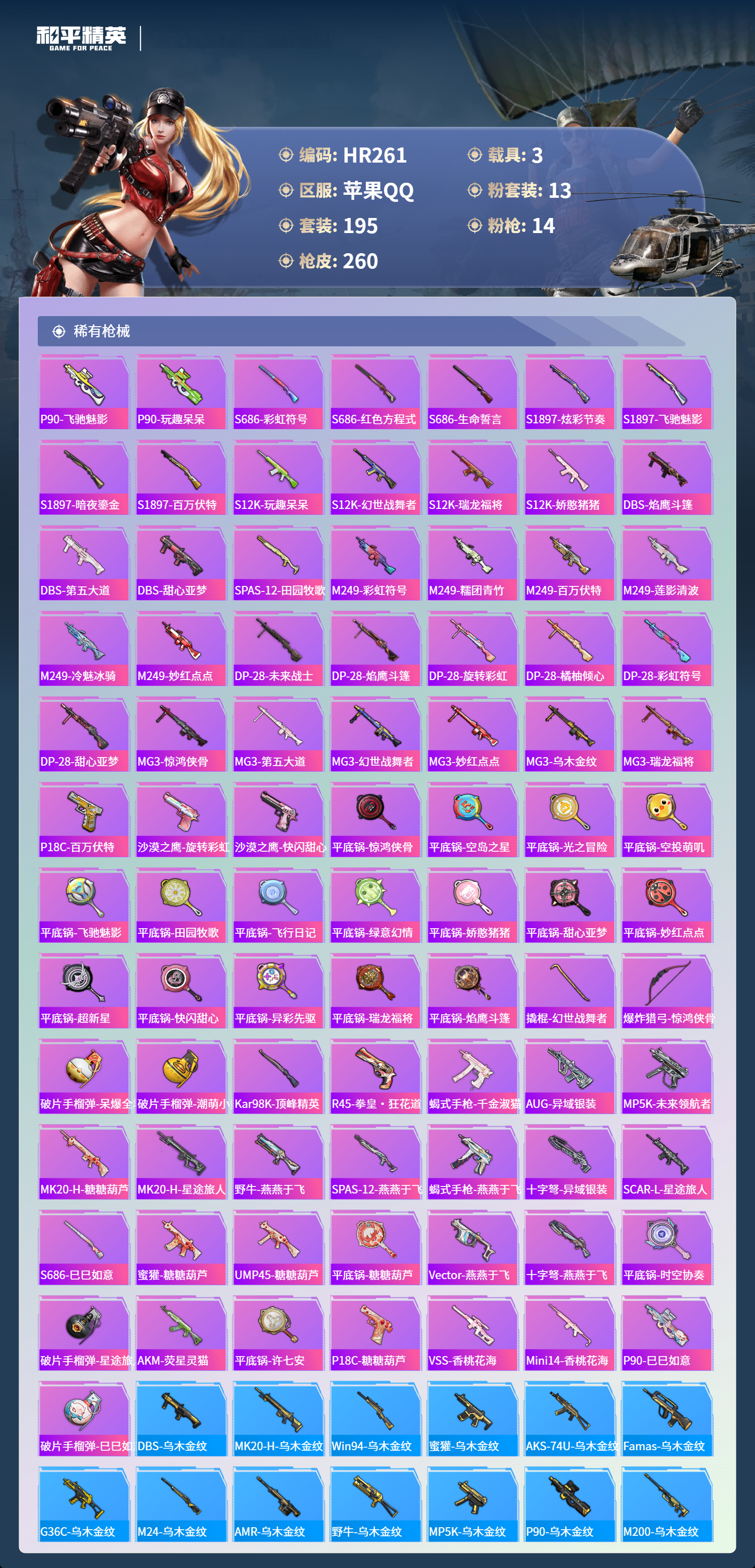 3载具-195套装-260呛皮-苹果手q-17王牌印记-13粉装-14特效呛-3载具-91377热力值-195套装-260呛皮-2卓越印记【13粉装】套装-筑梦精灵套装-星之彼岸角色-复仇流浪者套装-放客神游角色-白勺歌姬套装-旋转彩虹角色-初号机 觉醒ver.套装-第五大道角色-智耀战神角色-2号机款机体服角色-守护天翼角色-星梦奇缘套装-未来战士【14特效呛】p90-金丰海韵/7级kar98k-巳巳