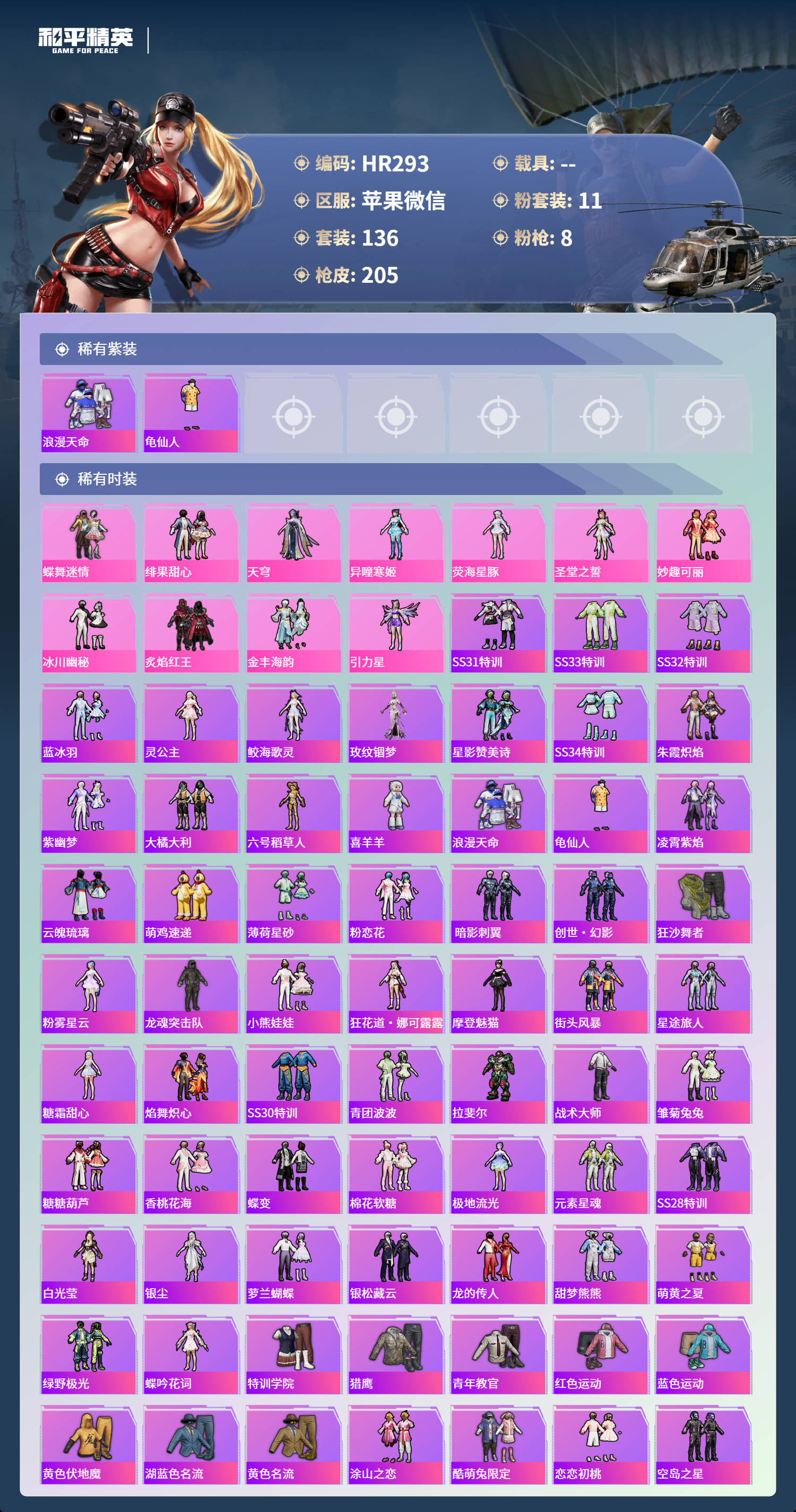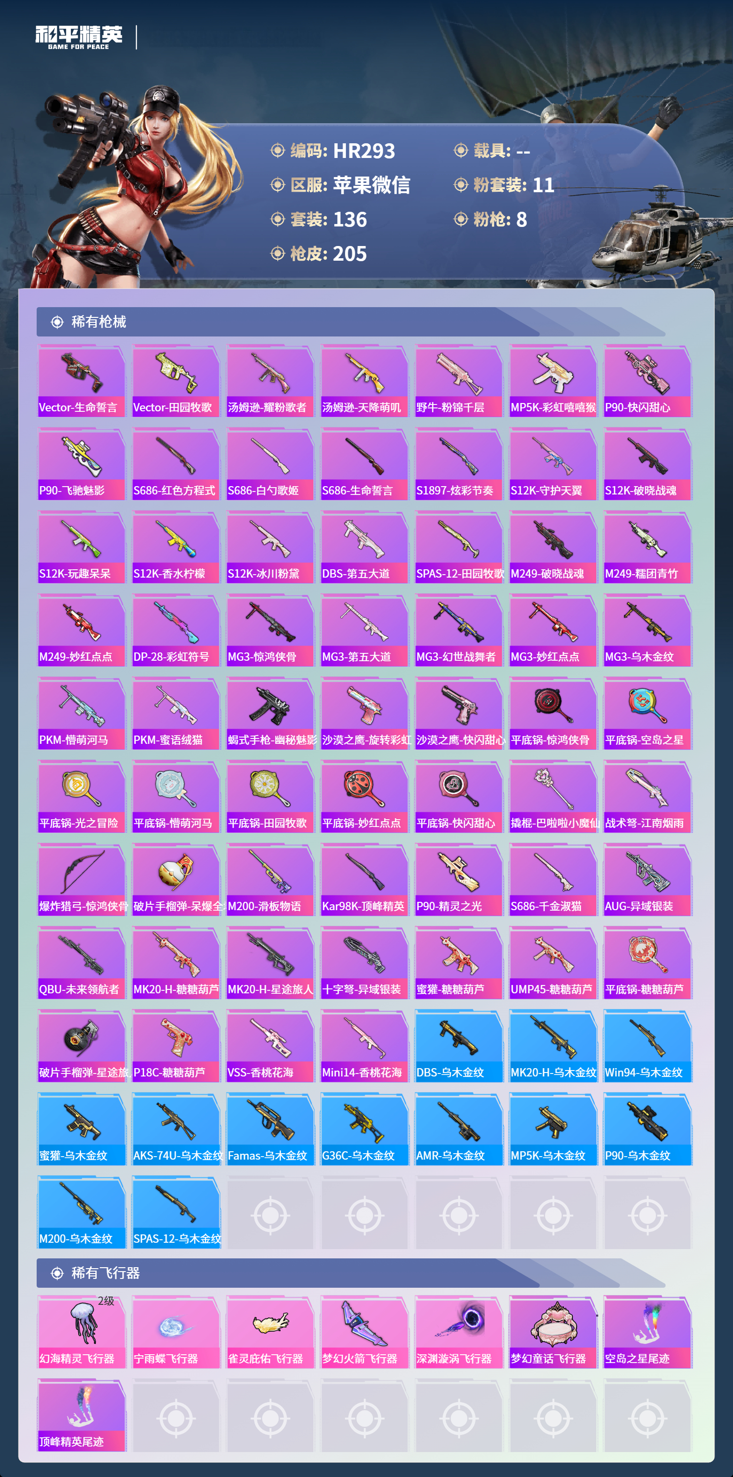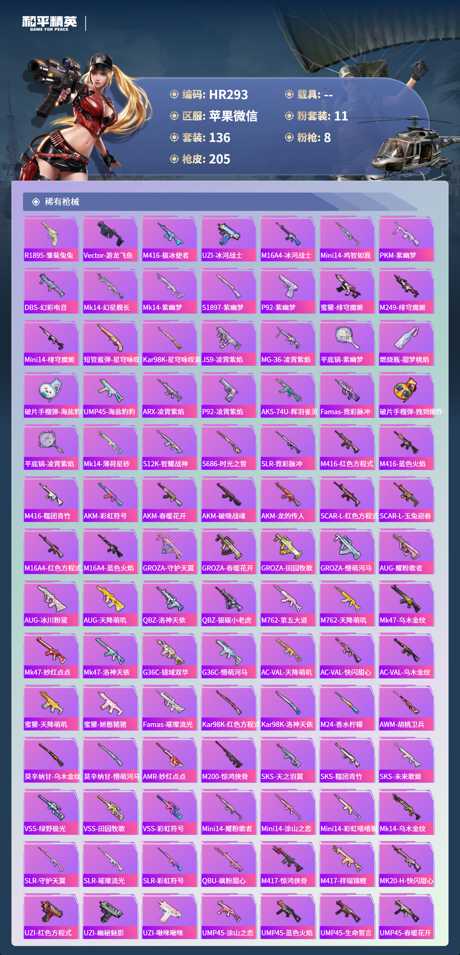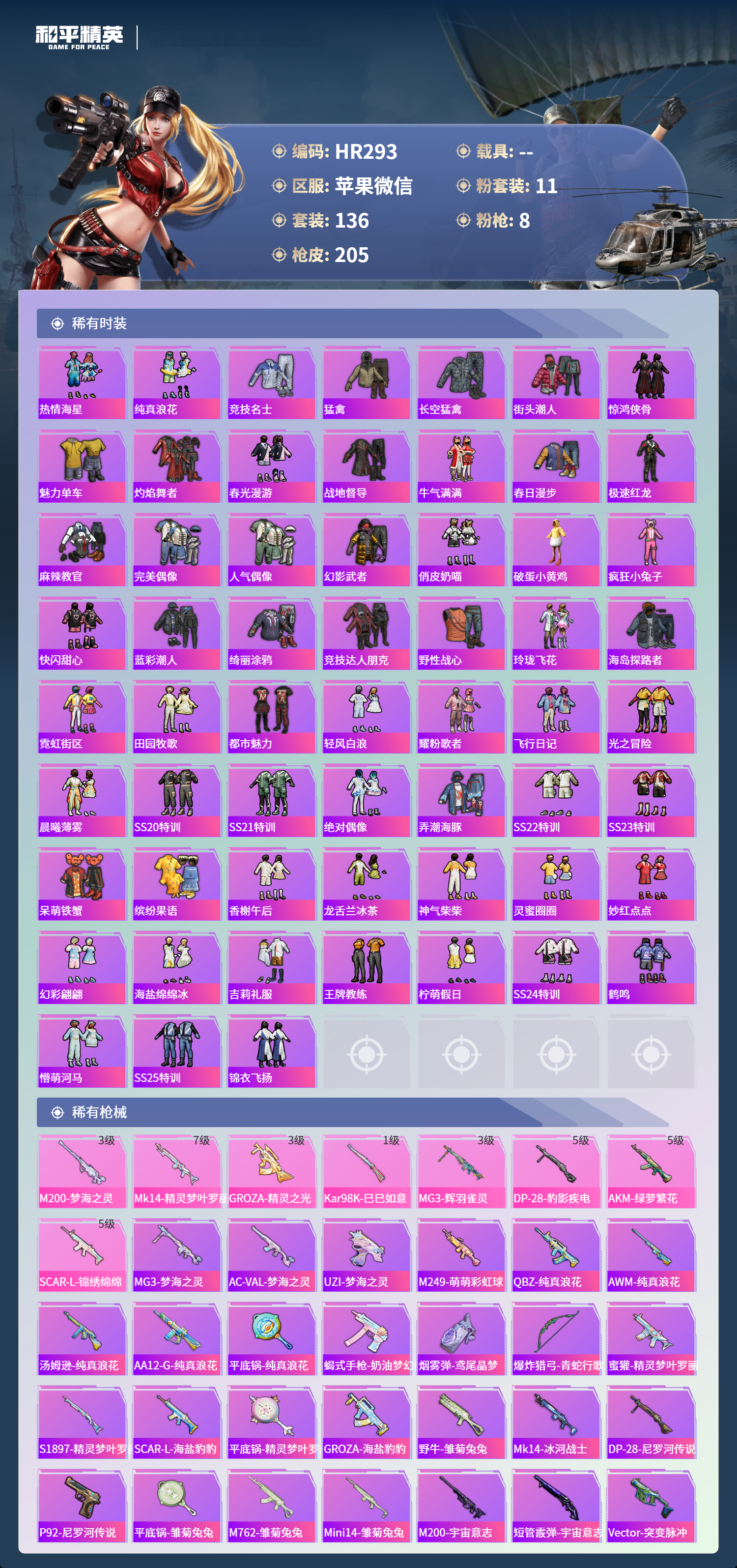 0载具-136套装-205呛皮-苹果微信-9王牌印记-11粉装-8特效呛-64203热力值-136套装-205呛皮-2卓越印记【11粉装】套装-蝶舞迷情角色-圣堂之誓角色-荧海星豚套装-妙趣可丽角色-引力星套装-金丰海韵角色-异瞳寒姬套装-绯果甜心套装-炙焰红王角色-天穹套装-冰川幽秘【8特效呛】m200-梦海之灵/3级akm-绿萝繁花/5级groza-精灵之光/3级dp-28-豹影疾电/5级mk14