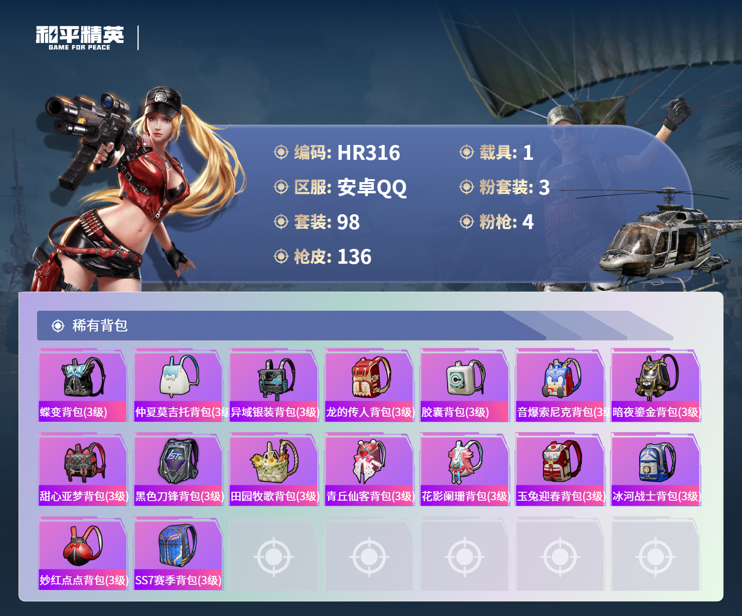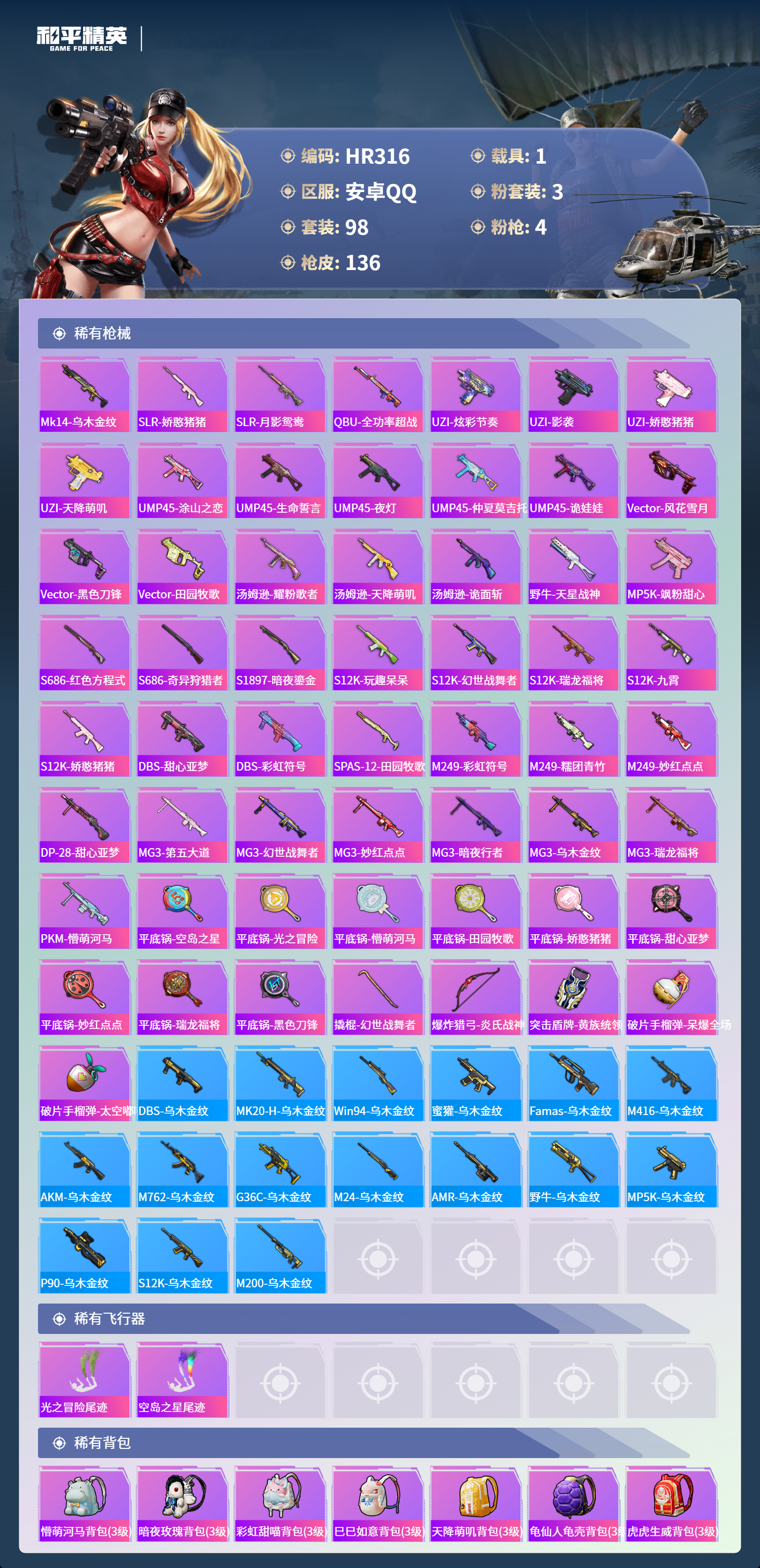 1载具-98套装-136呛皮-安卓手q-7王牌印记-3粉装-4特效呛-1载具-41941热力值-98套装-136呛皮-1卓越印记-1传奇印记【3粉装】套装-海螺星光套装-霞光圣骑套装-未来歌姬【4特效呛】kar98k-巳巳如意/5级vect-飒粉甜心/7级mg3-炙焰牛王/7级dp-28-豹影疾电/3级【2稀有紫装】龟仙人金羽特工【1稀有载具】合金龙骨(蓝)【98稀有时装】ss35特训ss31特训ss33特